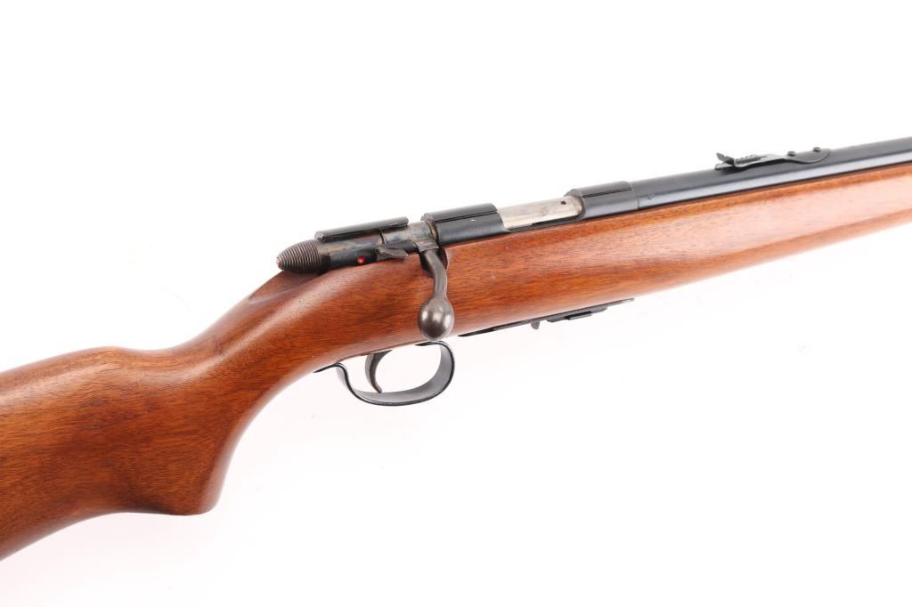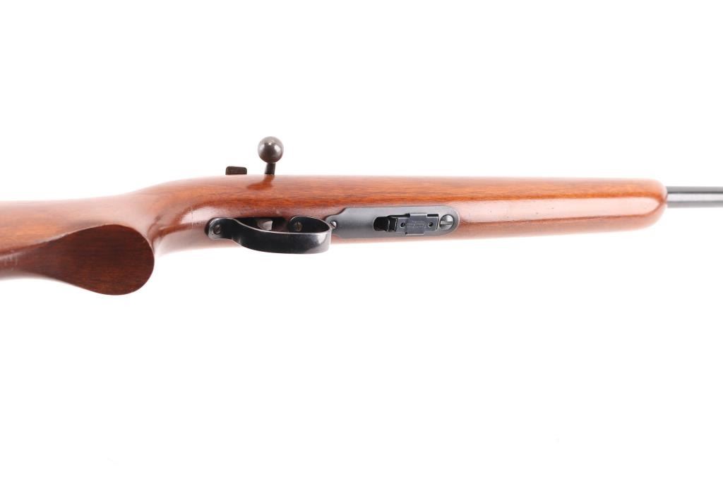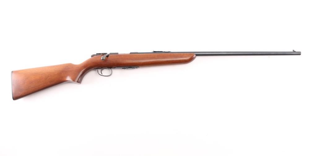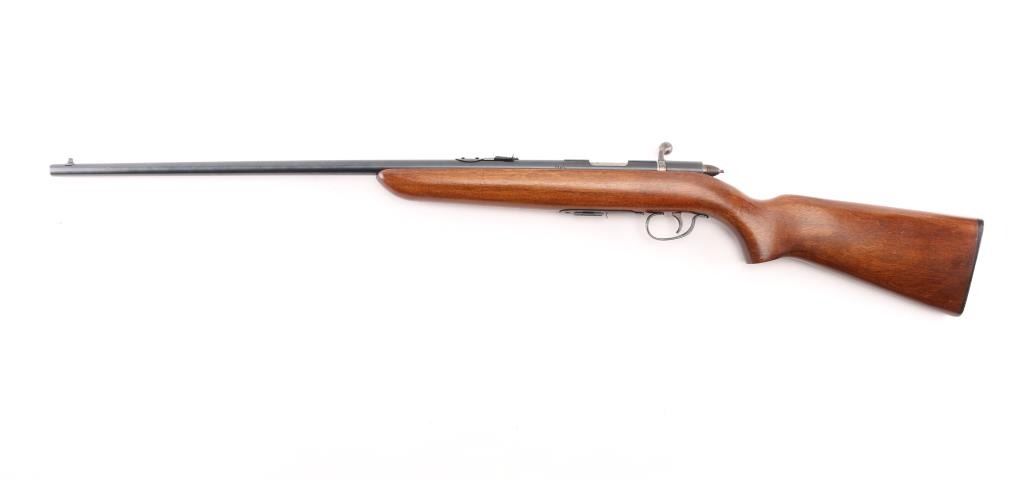 'The Scoremaster' 511 is an American made, magazine fed bolt action sporting rifle chambered for .22 Short, Long or Long Rifle Manufactured 1957. Features a blued finish, 25" barrel, dovetailed blade/bead front sight, elevation adjustable rear sporting sight, serrated trigger, metal trigger guard, manual safety on the right side of the receiver, cocked indicator, detachable 5 round magazine, and smooth walnut pistol grip shoulder stock , factory buttplate. receiver slotted for optics. Bore is excellent/bright. Original blue finish is about 98% with slight muzzle wear, very minor scratches. The wood stock is near excellent with some minor scratches NRA Condition-Near Excellent. C&R Firearm.