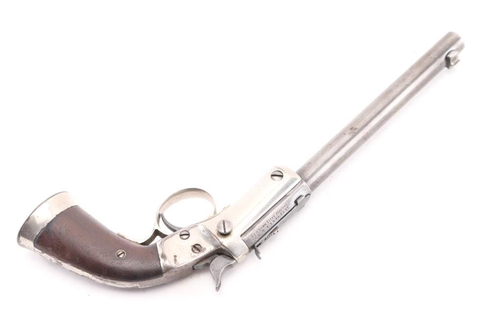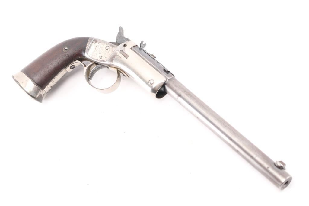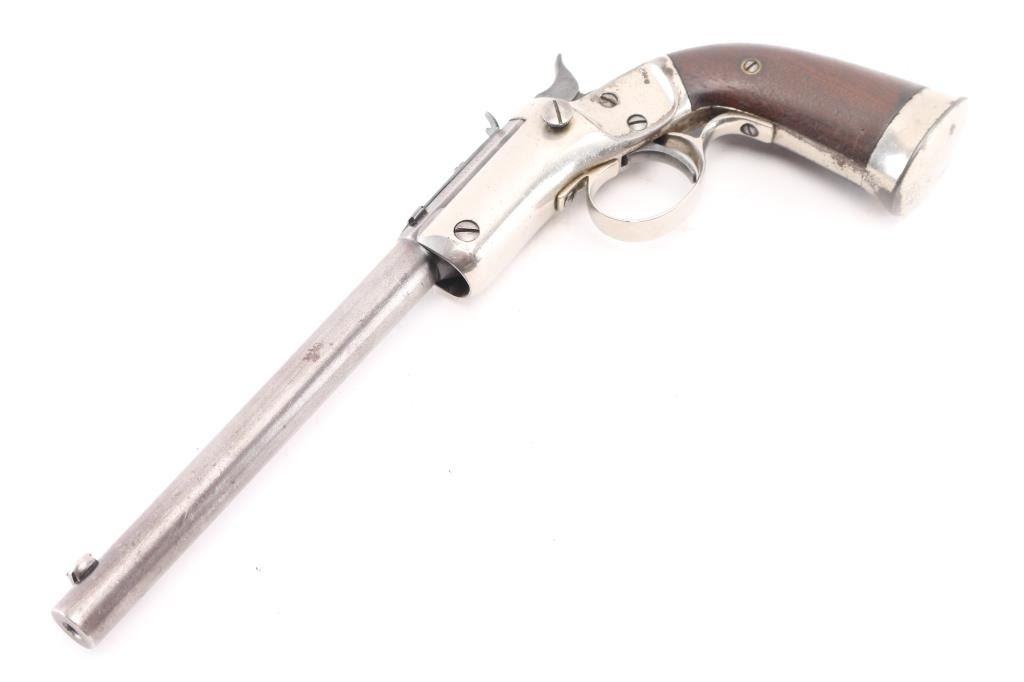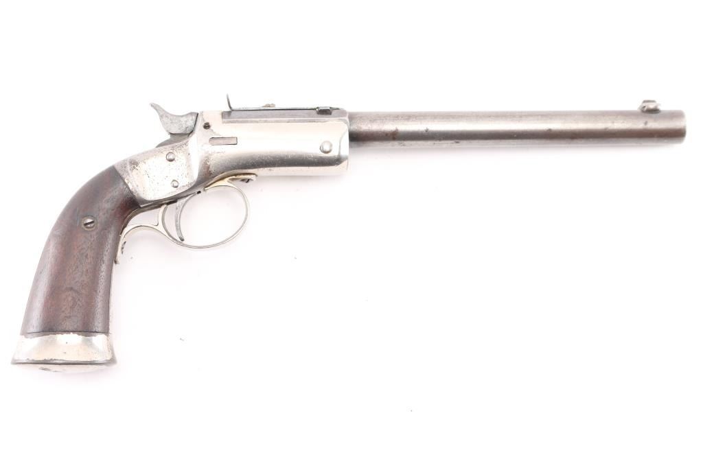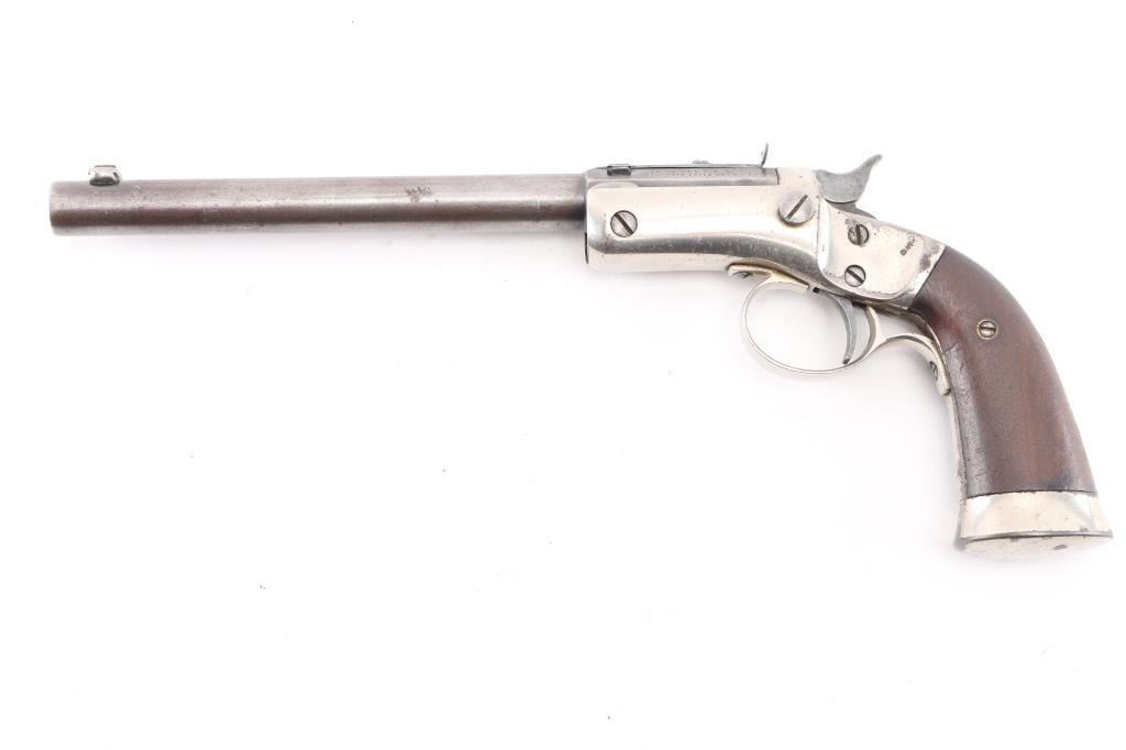 Vintage American made single shot rimfire pistol manufactured circa 1907-1916. Features a blued 8" part octagon/part round tip-up barrel, automatic extractor, dovetailed blade front sight, dovetailed rear sporting sight, smooth trigger, cast metal triggerguard, knurled hammer spur, nickel plated iron frame with weighted & flared butt cap, and two-piece smooth walnut grips. Matching serial numbers are found on the barrel & frame. Bore is poor condition, pitted throughout, with traces of visible rifling. Barrel is mottled brown patina with mostly smooth texture, some areas of polished bare metal, some original blue retained over chamber and on rear sight. Nickel on frame is fair overall, showing losses and brown patina on sides of frame and along backstrap. Grips are good, showing small dents, slight shrinkage, oil staining. Action is smooth, light trigger let-off. Condition is NRA Good *** C&R Firearm ***
