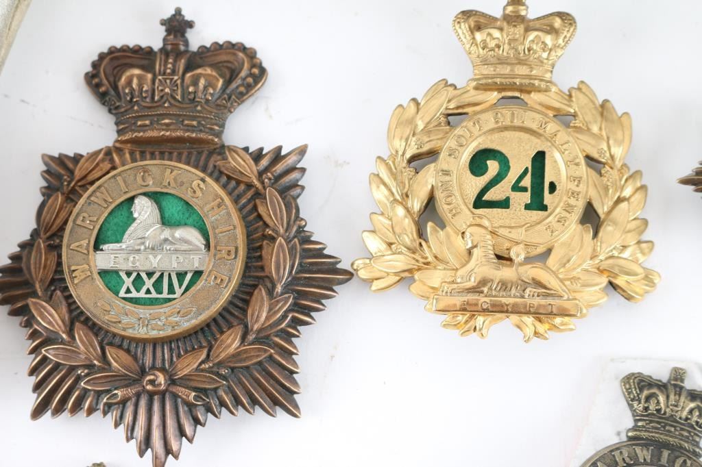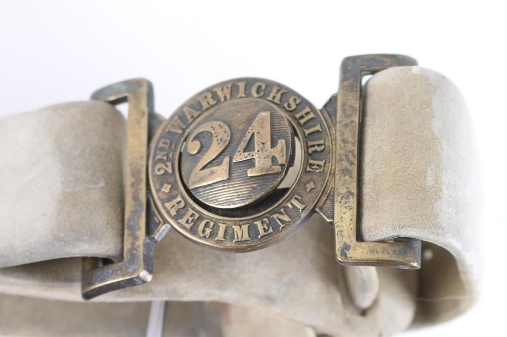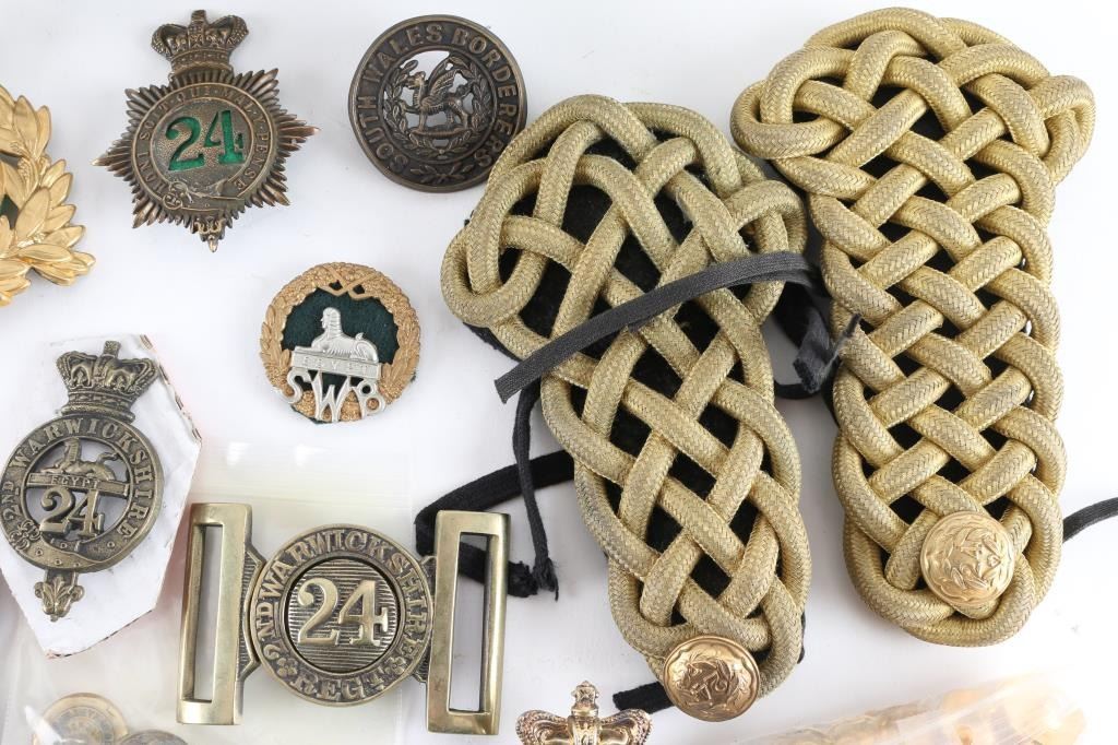 The 24th Regiment of Foot (2nd Warwickshire) has a very distinguished military career, Egypt. Zulu Wars, Boar war, WW1, WW2 etc. This lot includes 1) Pair of officer gold braid epaulets with brass "24" surrounded by wreath buttons. 3) Stamped brass with cut out 24 Regiment helmet plate, crowned wreath with Sphinx, and "Egypt". 4) Larger Helmet plate, crowned wreath with round "Warwickshire" center plate Sphinx with Egypt", and "XXIV" in the middle. 5) Stamped brass cap badge, crowned wreath with cut out "24".5) Round cap badge with Dragon, and "South Wales Borderers" 6) Six vintage brass buttons with wreath, and "24", all maker marked. 7) Vintage White leather belt with sword hangers, staple brass belt buckle, with "2nd Warwickshire regiment Regiment" on the outside. "24' over crown on the inside. 8) Two '24" brass stable belt buckles. 9) Two cap badges. 10) Brass 24th cross belt plate. 11) 2 bags of brass 24th buttons, unmarked, newer, possibly movie props. 12) White leather dress belt with brass 24th stable buckle, and bayonet frog. 13) Stamped brass helmet plate. All in very good condition. From the Joe Musso collection.