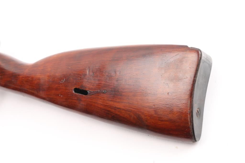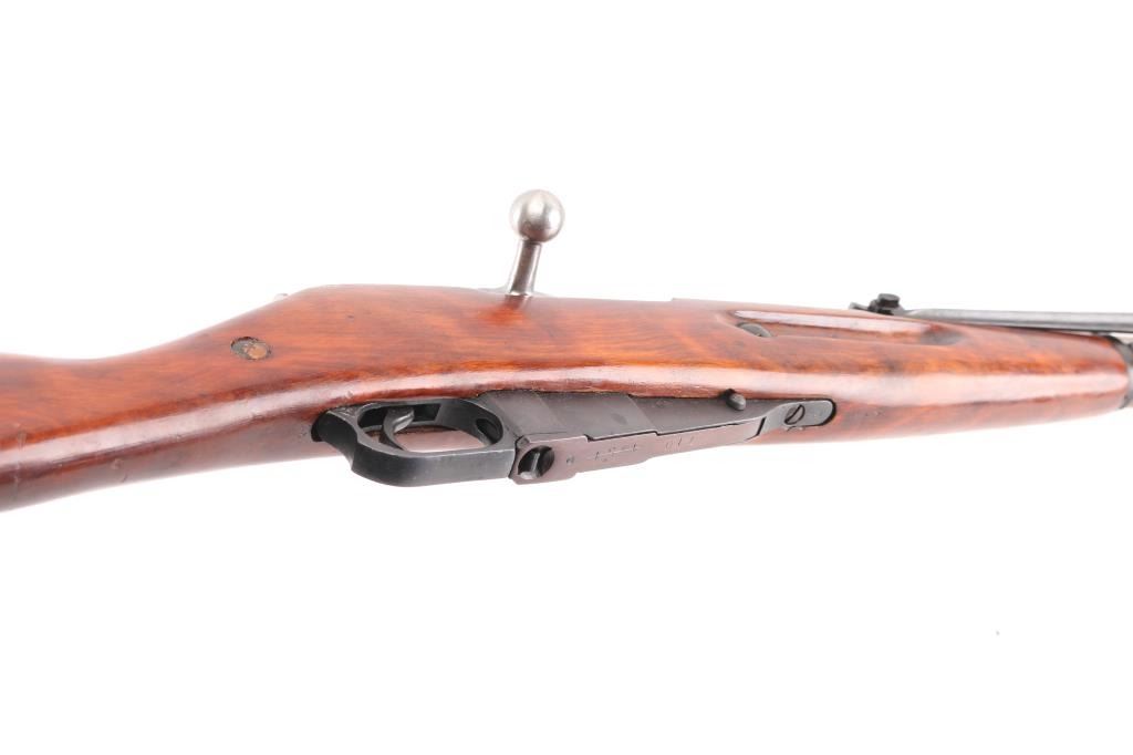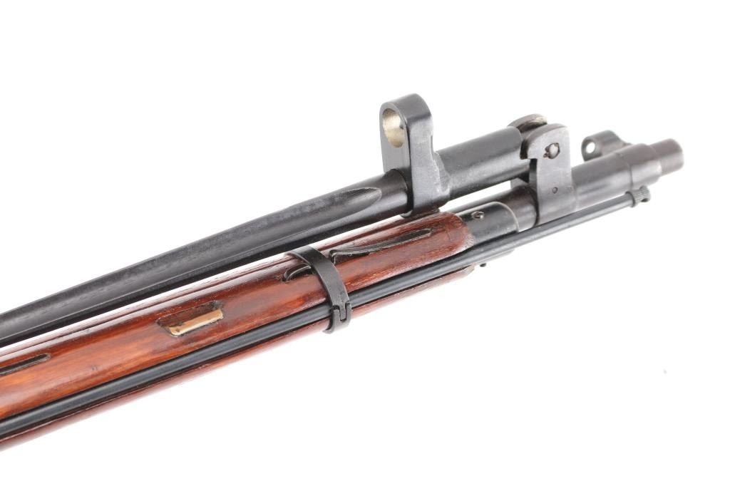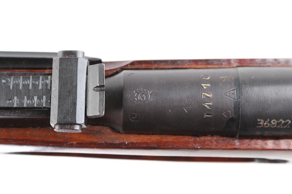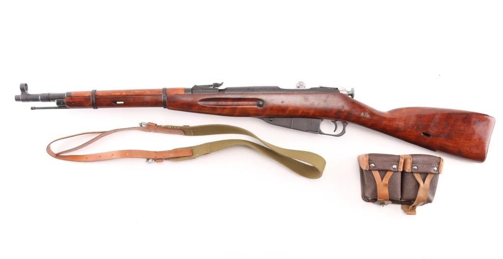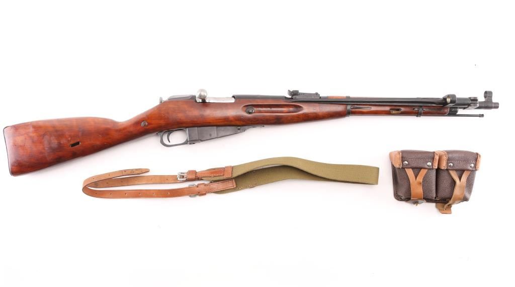 SN: 36822. WW2 era Russian military carbine, dated 1944. Arsenal refinished, Features a 20" barrel with front post, and tangent rear sights, side folding 12" cruciform bayonet, integral magazine, with hinged floorplate. Blue is about 95% with minor scratches/edge wear. Wood is very good, bore is fair, good rifling light pitting. Imported by R Guns. (Left receiver) Cleaning rod present. Original matching serial numbers on bolt, barrel, floorplate, and steel buttstock. Comes with cartridge box, cleaning gear, take-down tool, cleaning gear. NRA Condition-Fair to Good. C&R Firearm.