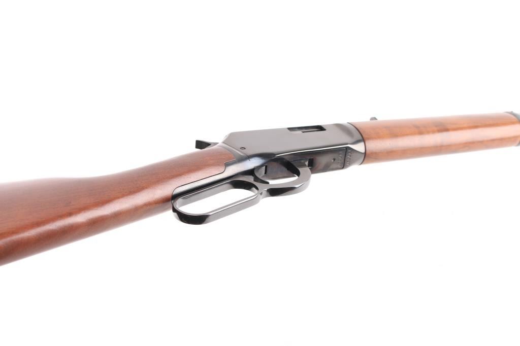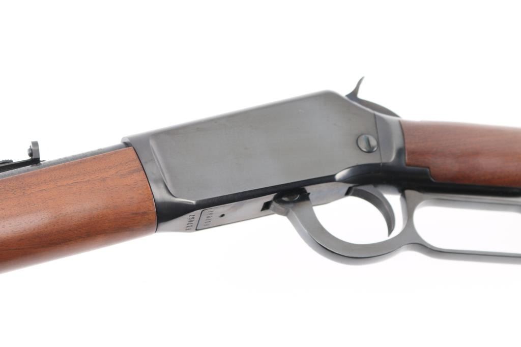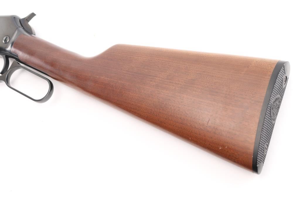 Lever action rimfire rifle features blued finish, nicely figured smooth walnut forend & stock, flat plastic buttplate, 20" barrel, full length magazine tube under barrel, hooded blade front & sporting rear sights. Bore is excellent bright condition. Overall condition is excellent with few handling marks. Wood is very good condition with few minor blemishes. Condition is NRA Excellent *** Modern Firearm ***