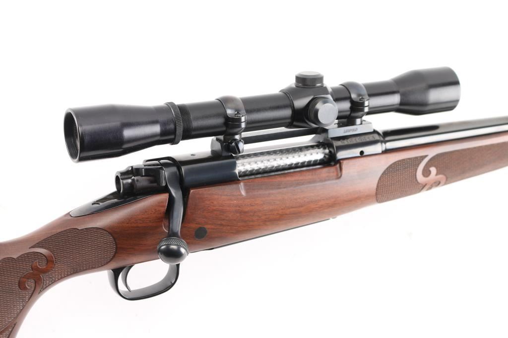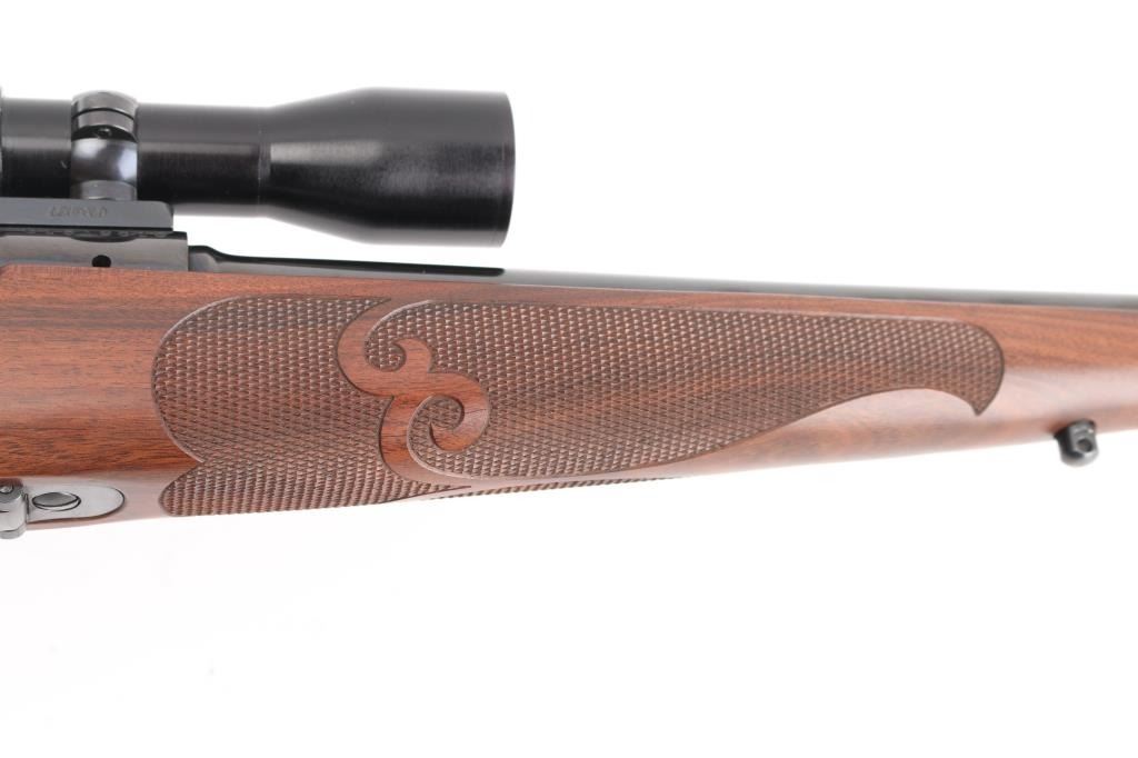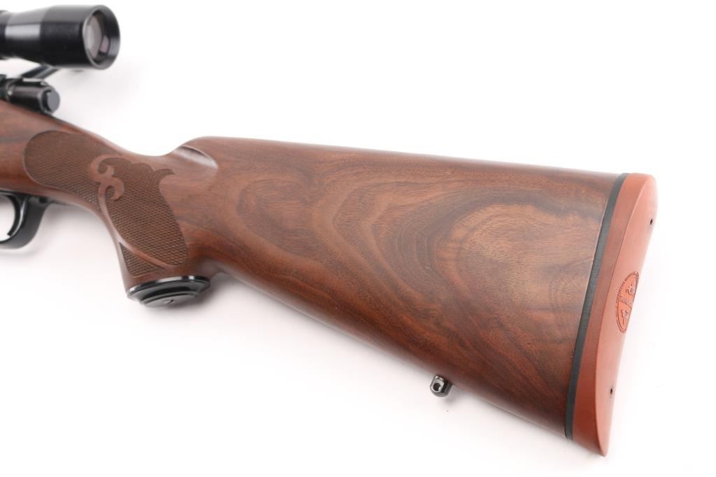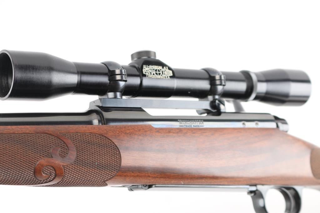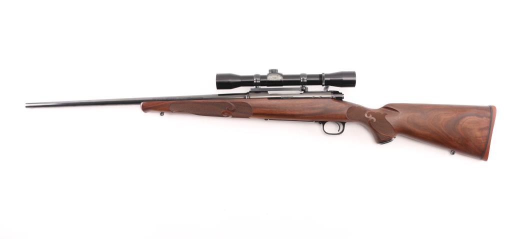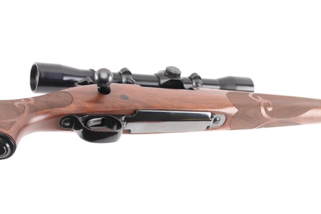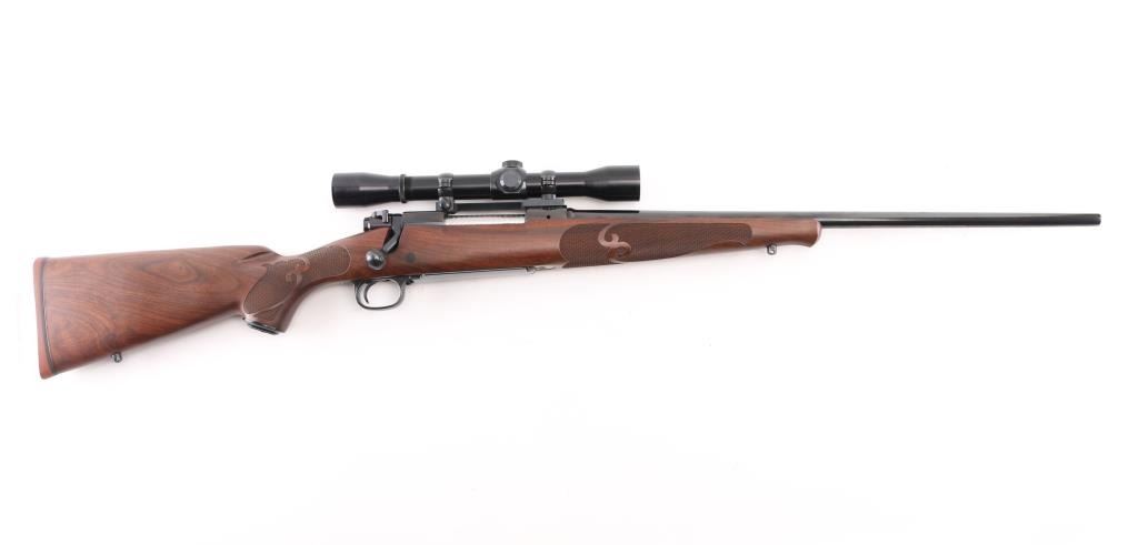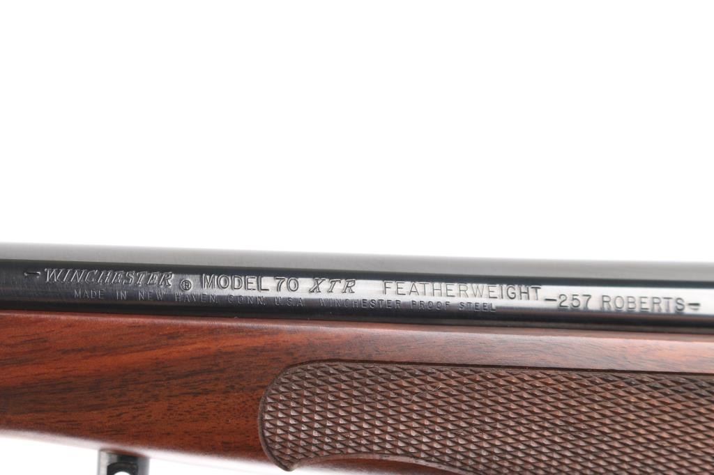 'XTR Featherweight' Light weight bolt action sporting rifle chambered in .257 Roberts Features a blued finish, 22" tapered barrel with no provisions for sights, installed Leupold one-piece scope base with rings, Lyman All-American Perma Center 4X scope, clear optics. serrated trigger, jeweled bolt, three position safety on the rear of the bolt, internal box magazine with hinged floorplate, and fancy checkered pistol grip walnut shoulder stock with schnabel forend, grip cap, Factory red recoil pad & 13 1/2" LOP. Rifle exhibits approximately 99% of it's original blued finish showing very little wear. Action is smooth, the bore is pristine, and the wood stock is fine. Rifle is like New. NRA Condition-Excellent. Modern Firearm.