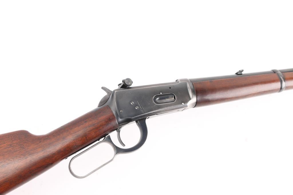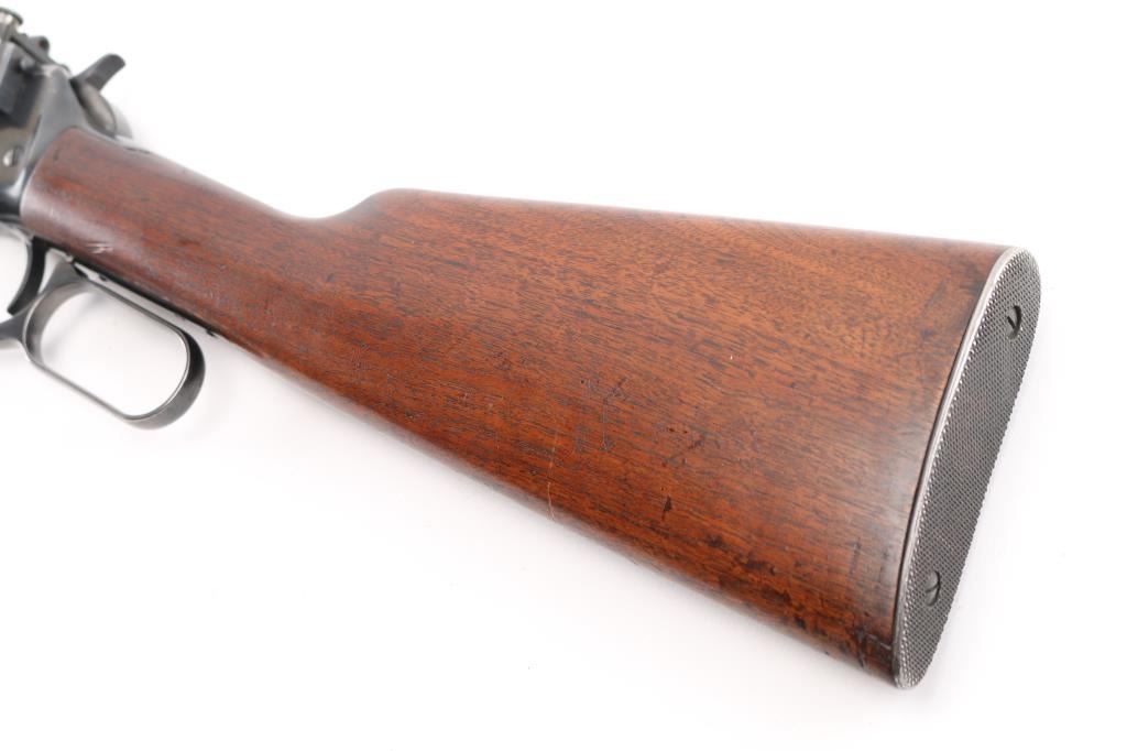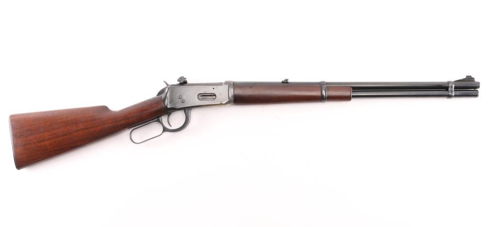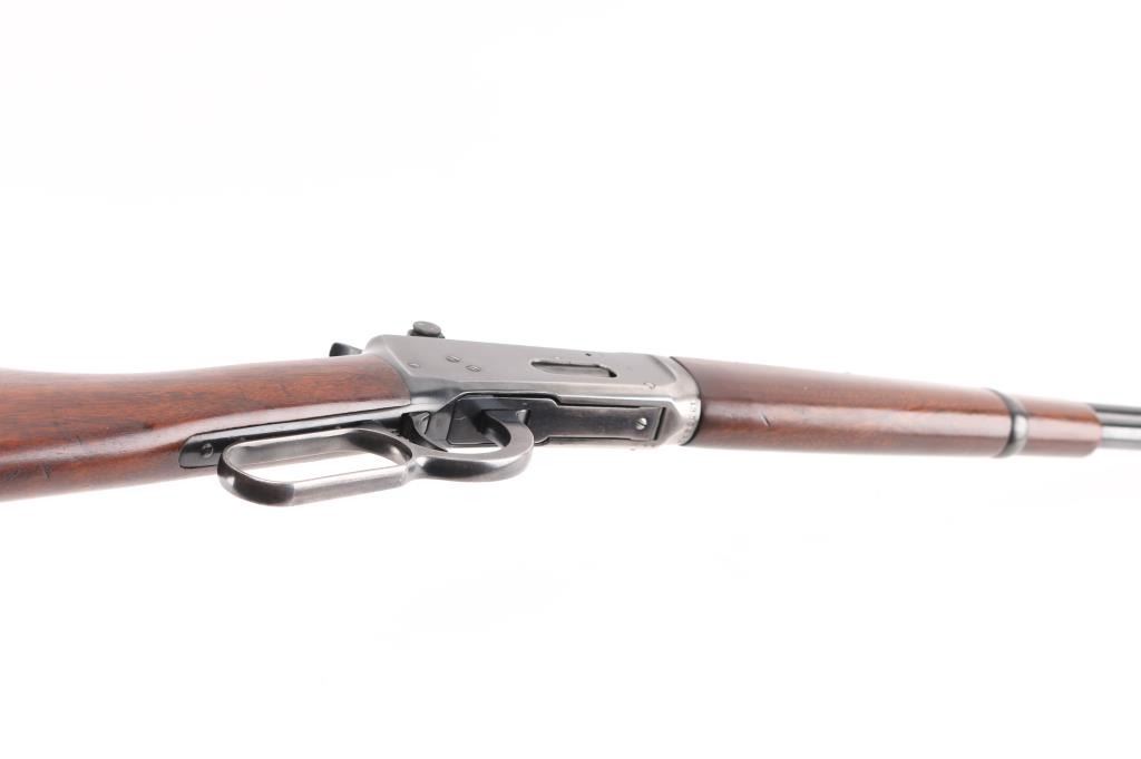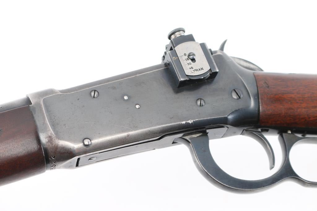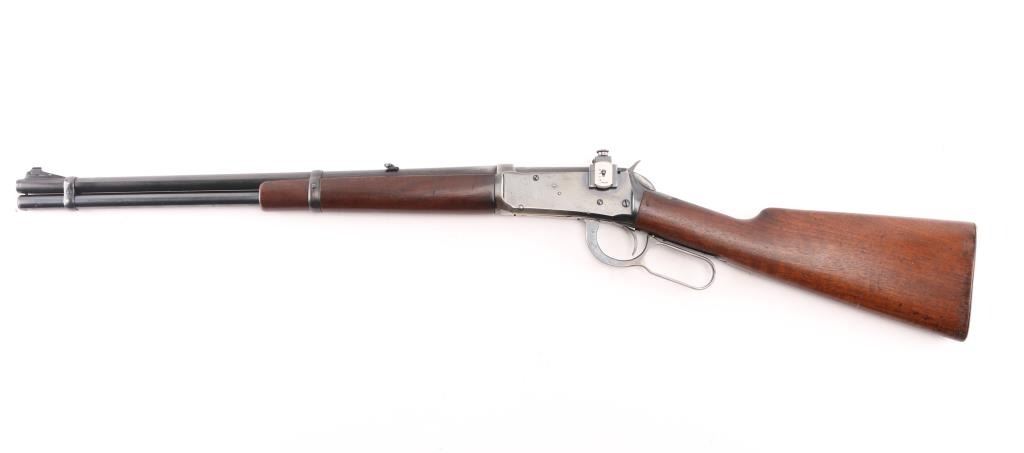 'Eastern Carbine'. Vintage lever action repeating rifle chambered in .30-30 Winchester. Manufactured 1942. Features a blued finish, 20" barrel, full-length tube magazine, ramped, post/bead front sight , adjustable rear white triangle folding sight, vintage Lyman adjustable peep sight attached to the rear. left receiver. Smooth trigger, serrated hammer spur, steel receiver, smooth walnut forend and straight wrist shoulder stock with knurled metal buttplate. Bore is excellent/bright. Retains 80% finish with handling wear on the lower receiver, & lever edge/muzzle wear, minor scratches. Wood is very good/sound with minor scratches/dings. Markings are crisp. NRA Condition-Very Good. C&R Firearm.