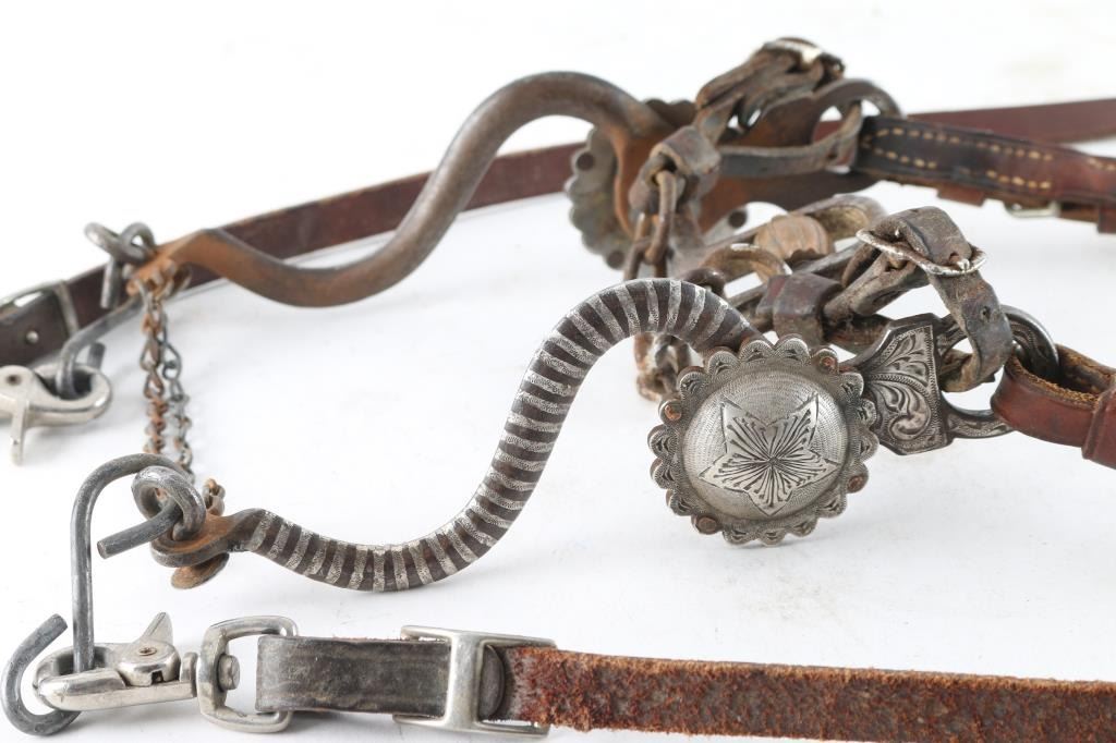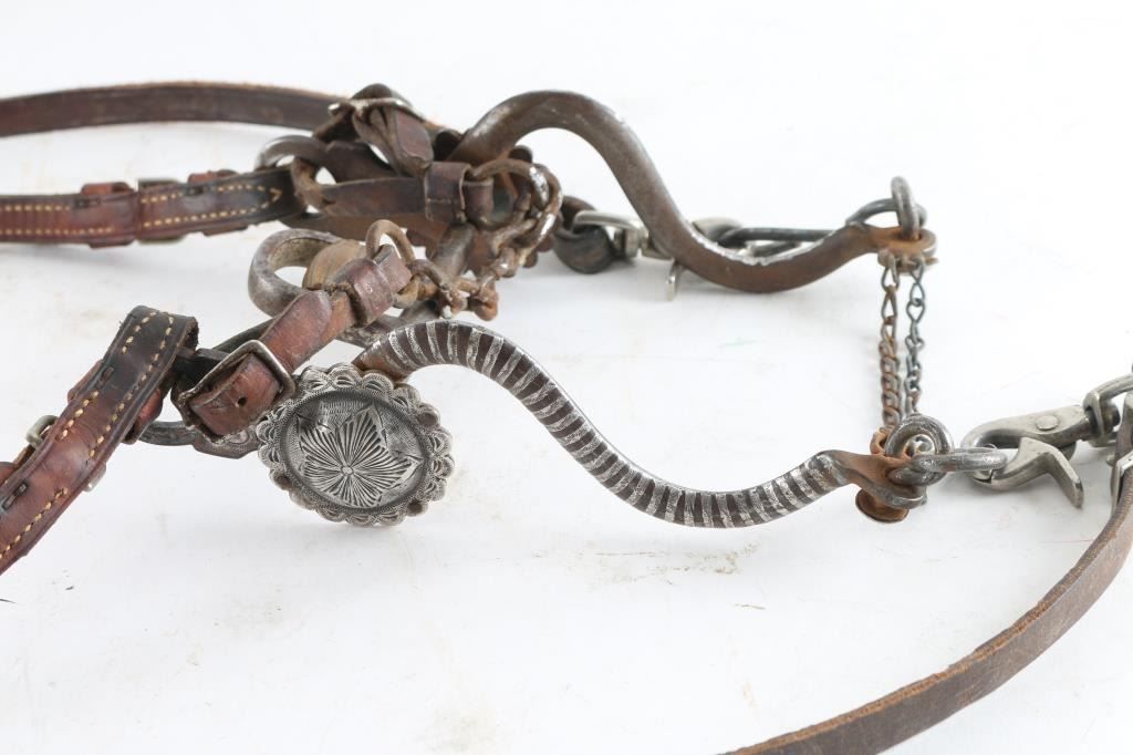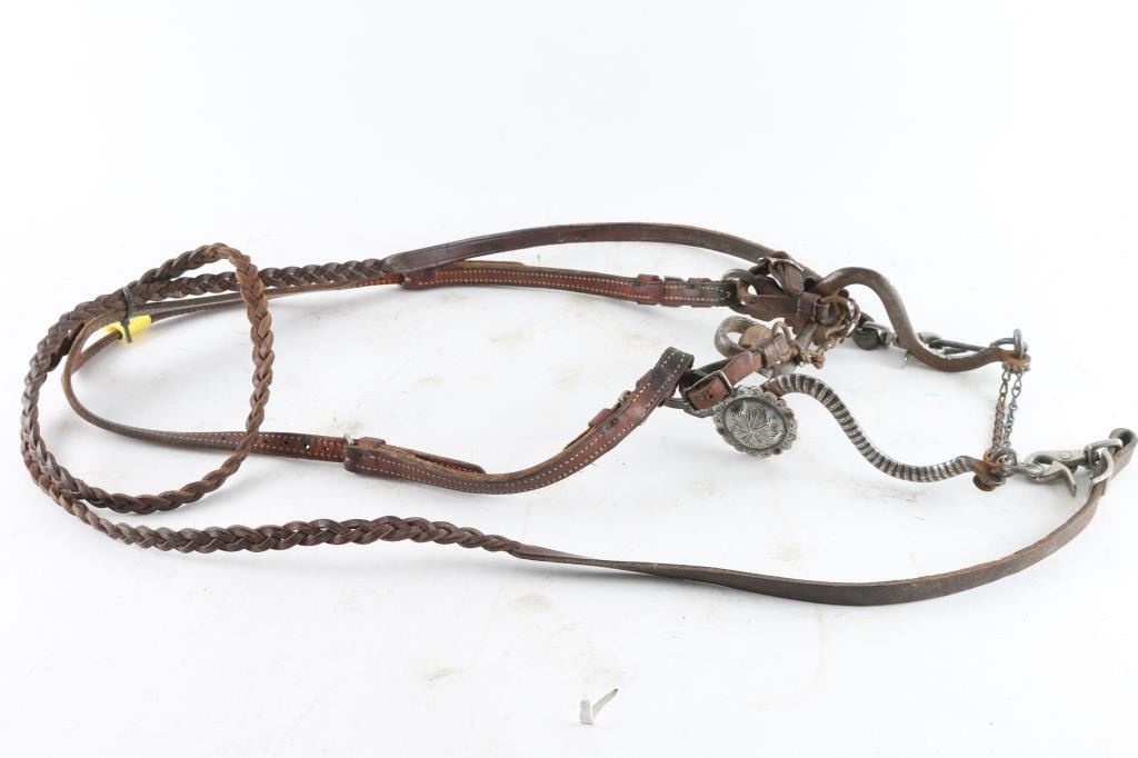 with engraved design on brown leather McPherson headstall with braided reigns.