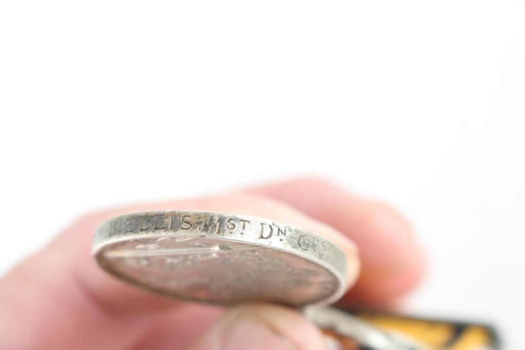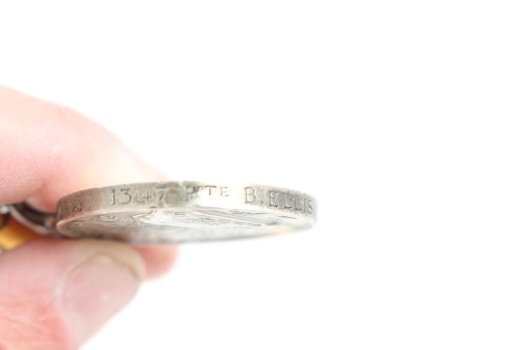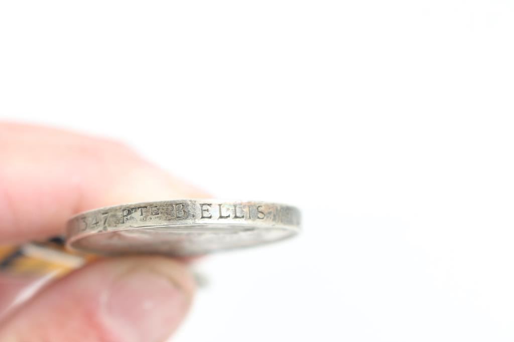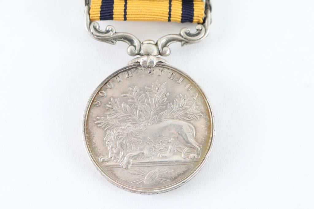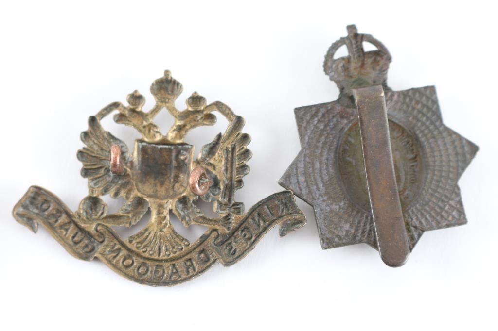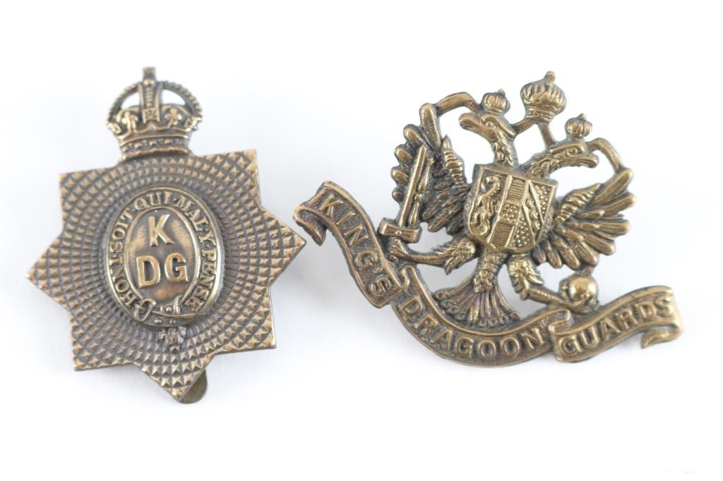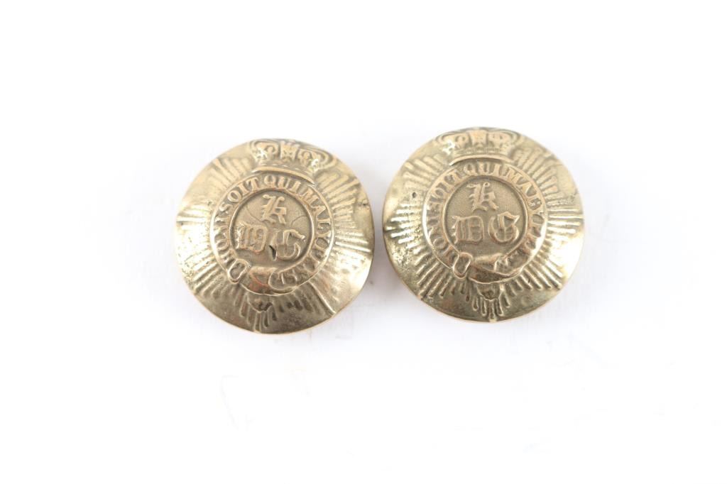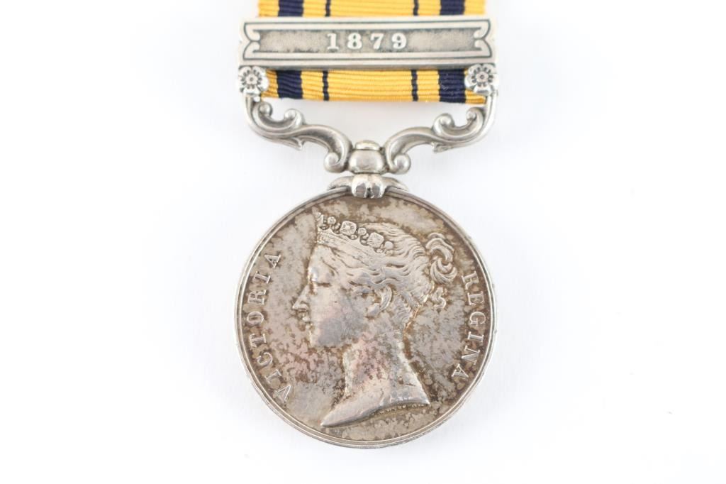South Africa medal with 1879 bar to Pte B. Ellis, 1st (King's) Dragoon Guards 1347. The King's Dragoon Guards were sent to Zululand following the Isandlwana disaster and served in a number of capacities throughout the war. They were present at the discovery of the body of the Prince Imperial on 2 June 1879, were extensively employed on the lines of communication, and one squadron took part in the charge at Ulundi. A detachment of Dragoons captured King Cetshwayo on 28 August 1878.Participants in the Zulu War received this medal without a bar if they remained on the Natal side of the Tugela, or with the bar '1879' if they actually saw service in Zululand. Medal in good condition, no obvious knocks or scratches. Top Clasp is hallmarked. Comes with KDG double headed eagle cap badge. (Not Period} The King's Dragoon Guards 1916 Brass Economy WW1 cap badge. For display. From the Joe Musso Collection.