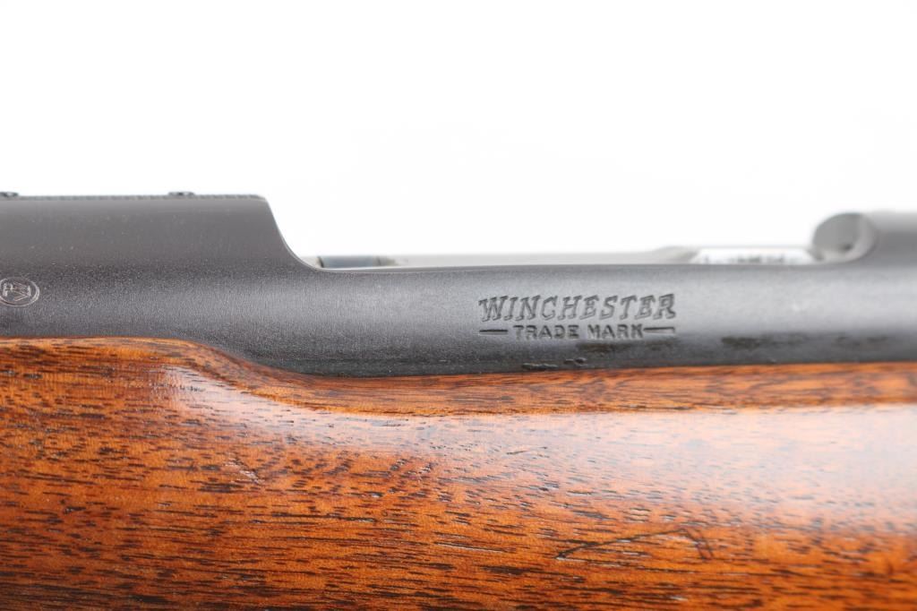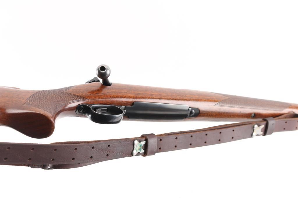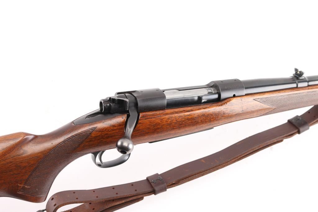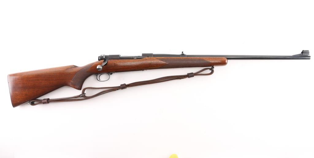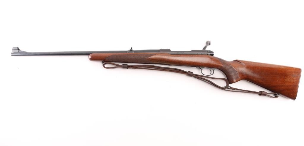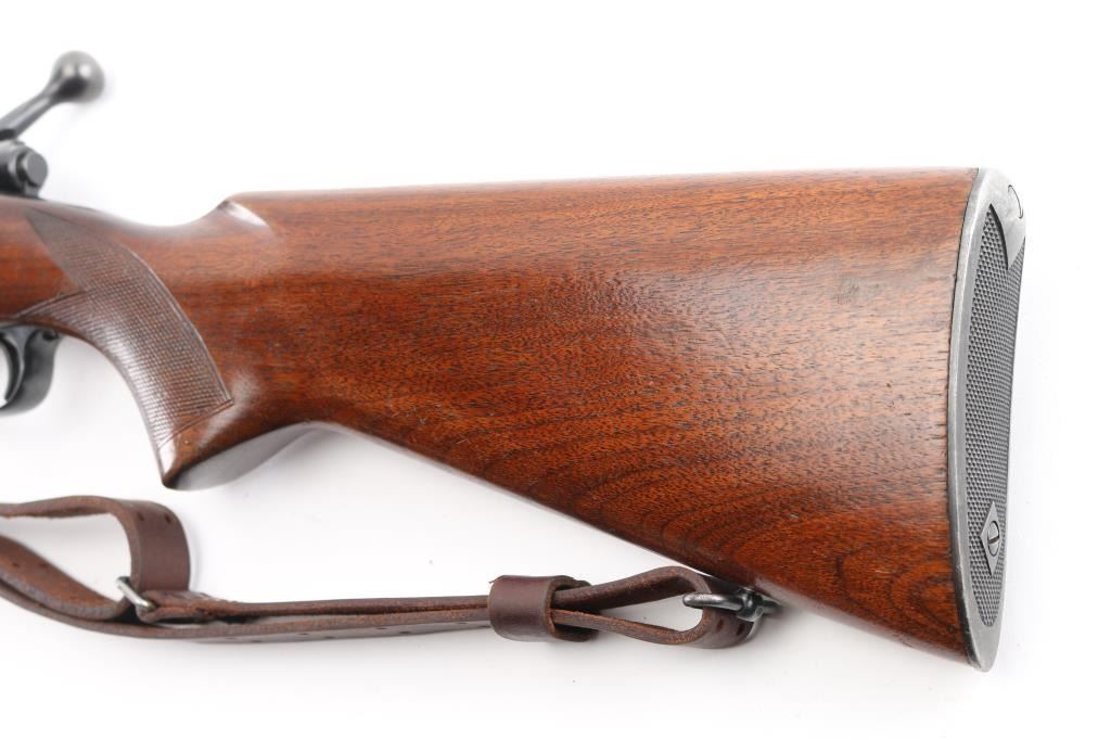 SN: 464890. Bolt action rifle manufactured circa 1958. Features blued finish, matte receiver, wood stock with semi-pistol grip, checkered metal buttplate, checkered panels at wrist & forend, 24" barrel, hooded blade/bead front sight, folding white triangle rear sight, three position manual safety, hinged floorplate, sling swivels, receiver drilled/tapped for optics. Bore is excellent/bright. Retains about 95% bluing, with light muzzle wear, some rubs on the extractor, minor scratches. Stock is very good condition with minor scratches/dings. Action is smooth. Condition is NRA Very Good. C&R Firearm.