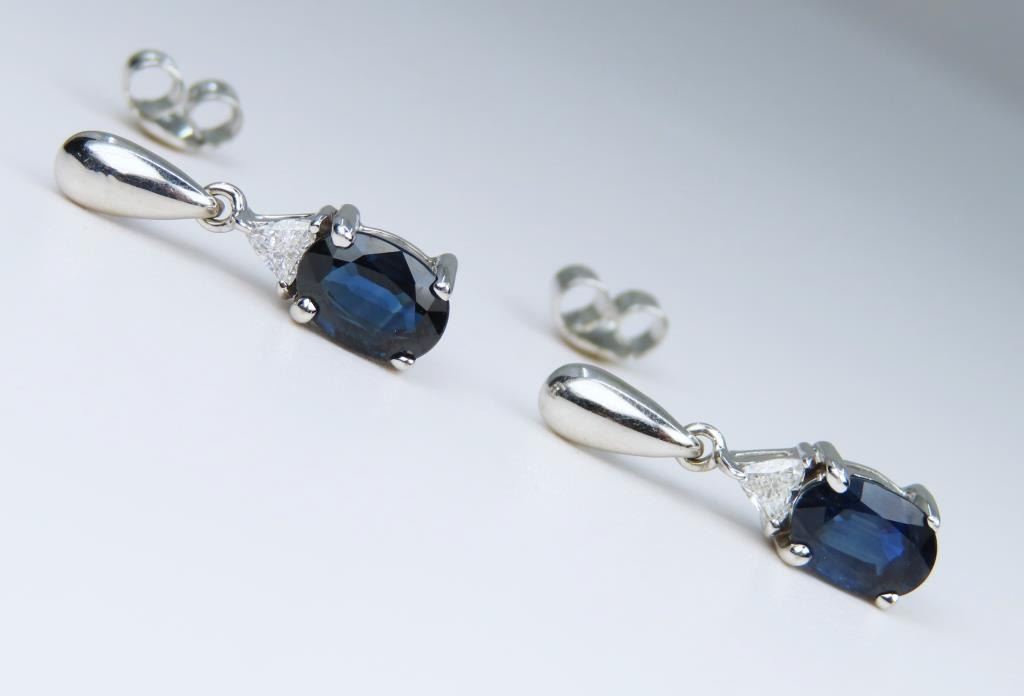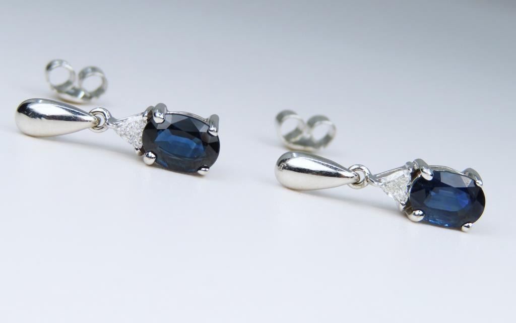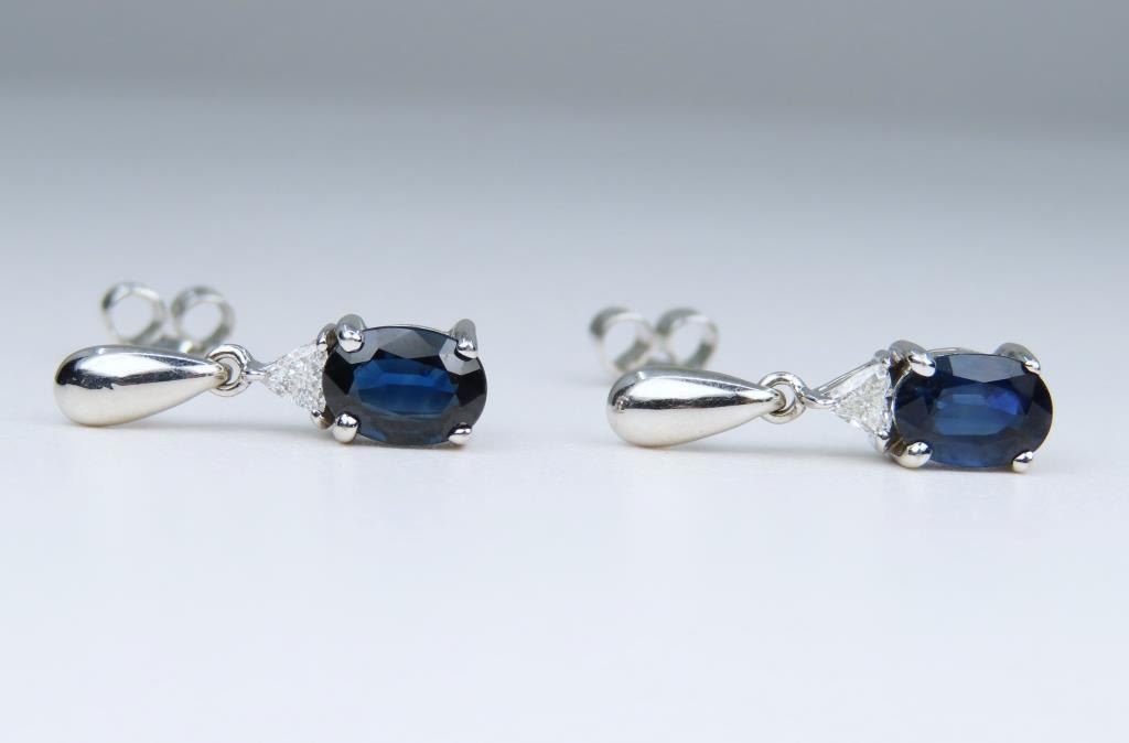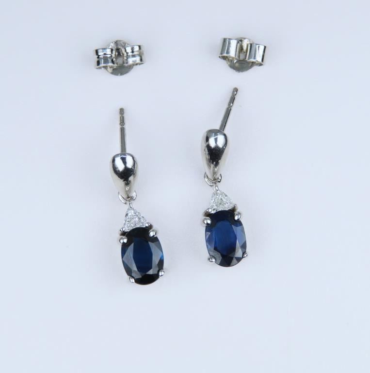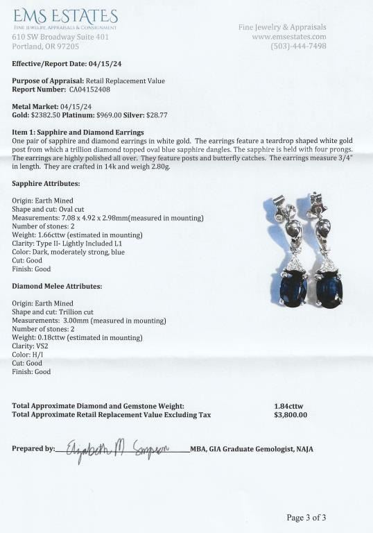 Dangle Earrings featuring two matching Royal Blue Sapphires weighing approx. 1.66 carats with two matching trilliant cut Diamonds weighing approx. 0.18 carats with F-G colors and VS clarity set in a fine 14 karat white gold settings. Retail Appraisal - $4,800.00