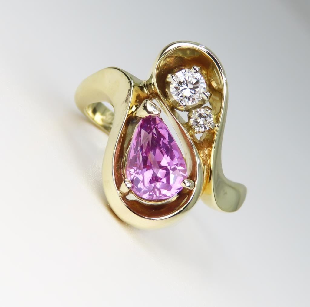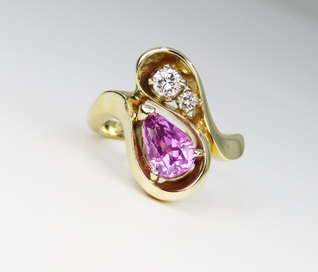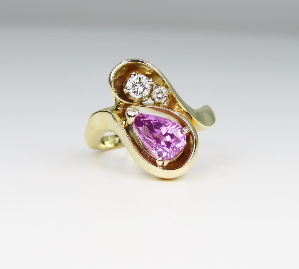 featuring a natural intense Pink Sapphire weighing 1.80 carats accented with 2 fine round cut Diamonds set in 14 karat yellow gold freeform style custom setting, Size 7 ¼. Retail $4,000-$6,000
