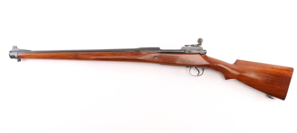 SN: 287458 This is a U.S. Military rifle that has been sporterized. High polish blue finish, chrome plated bolt. barrel has been shortened to 22". Ramped Lyman blade front sight, original 1917 ladder peep sight with side protectors removed, manual safety, hinged floorplate, sling swivel studs. Smooth wood semi-pistol-grip full Mannlicher stock with grasping grooves, steel fore cap, checkered steel buttplate. Bore is excellent/bright, strong rifling. Action is smooth, wood is very good with minor scratches, high-polish reblue is 98% with some very minor scratches. NRA Condition-Very Good as Sporterized.C&R Firearm.