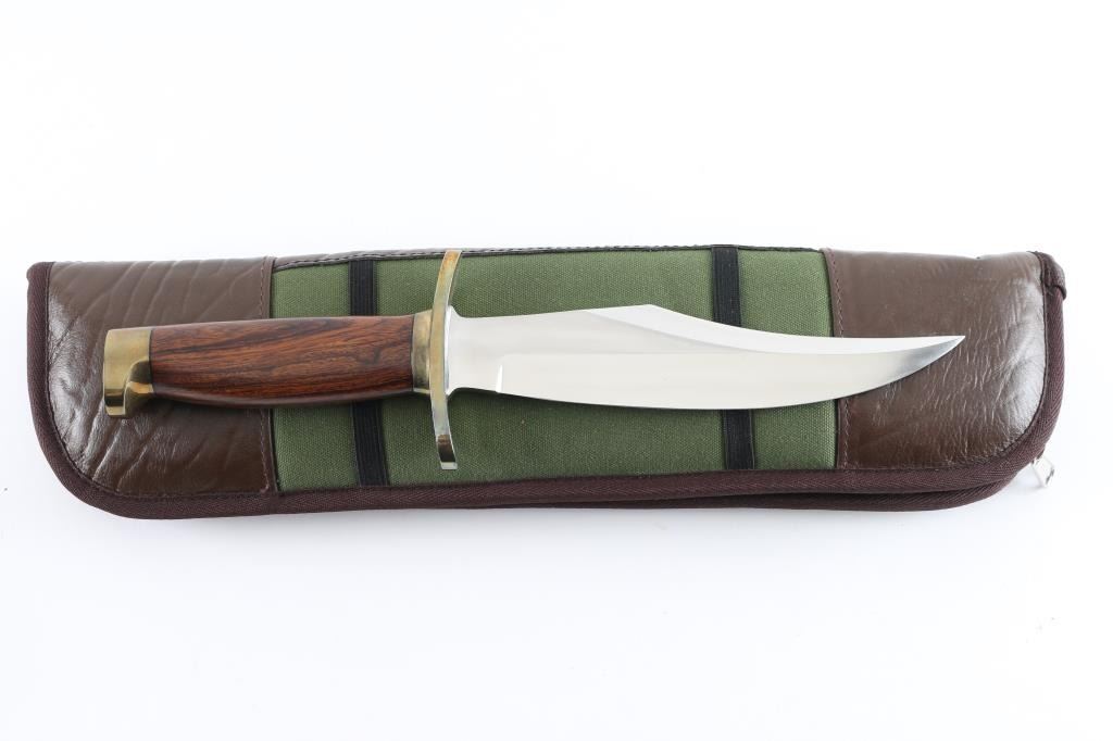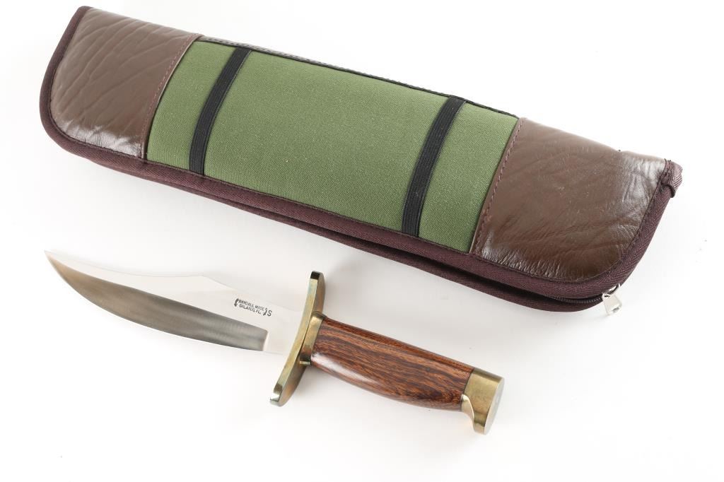 Model 12. 8" blade of 1/4" stock. 1 5/8" wide. The top cutting edge is sharpened approximately 5 ¼”. Brass double forward curved hilt. Approximately 5" wood handle. Brass scalloped butt cap. Designed on special order for a big game sportsman who planned to use it for hunting.