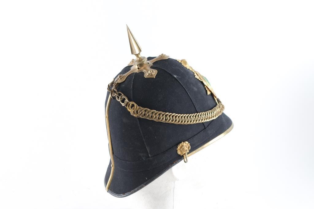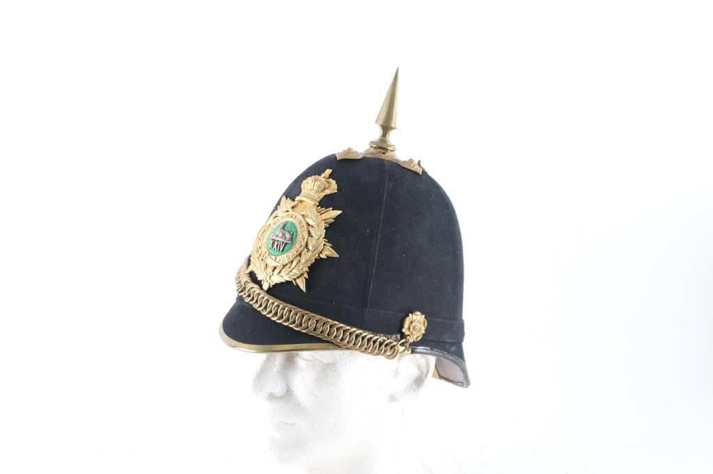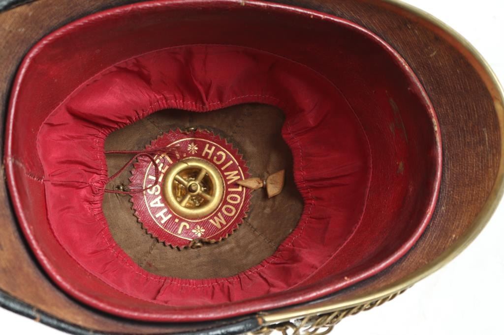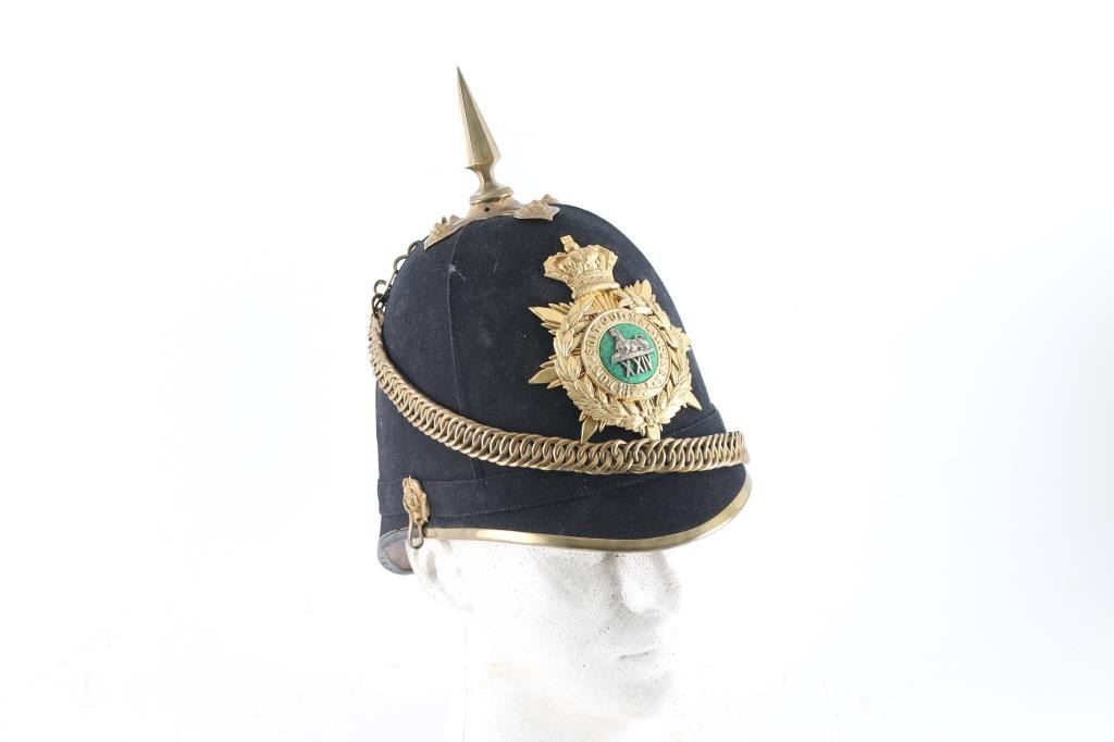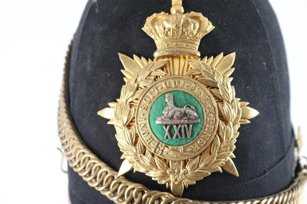 24th Infantry Regiment, British Home Service 1878 pattern helmet, dark blue cloth cover with gilt brass screw in mount and spike to the crown, rosette bosses to each side, with attached leather backed gilt chain chin strap, fitted with the standard brass helmet plate for the 24th Infantry Regiment with the Sphinx, "Egypt": and "24" in Roman Numerals. (Post 1902 Kings Crown), fitted with red leather sweat band to the interior, red silk lining, makers mark of J. Haslett, Woolwich. Excellent condition.