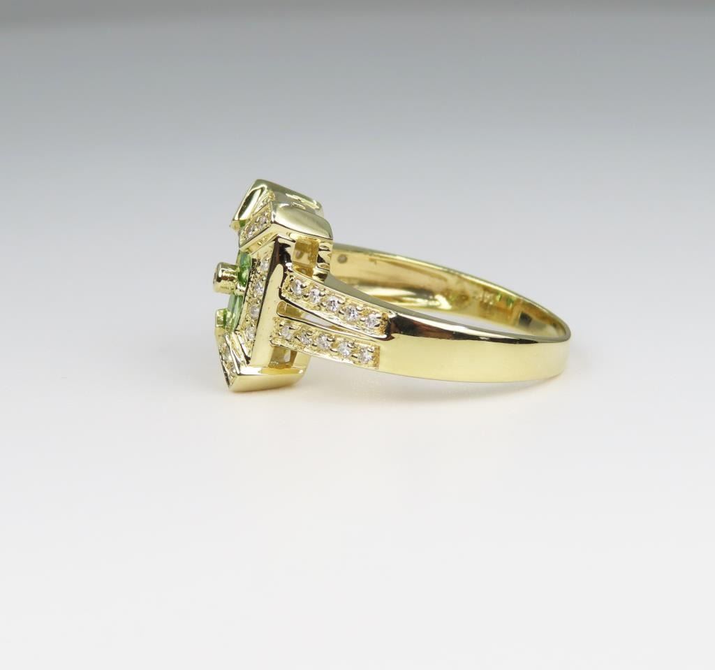featuring 4 oval cut bright Green Tsavorites and 43 round Diamonds with H-I colors and VS clarity with a combined gem weight of approx. 2.00 carats set in beautiful 14 karat yellow gold setting, Size 8 ¼.