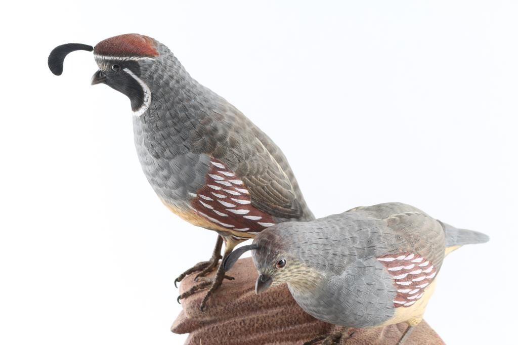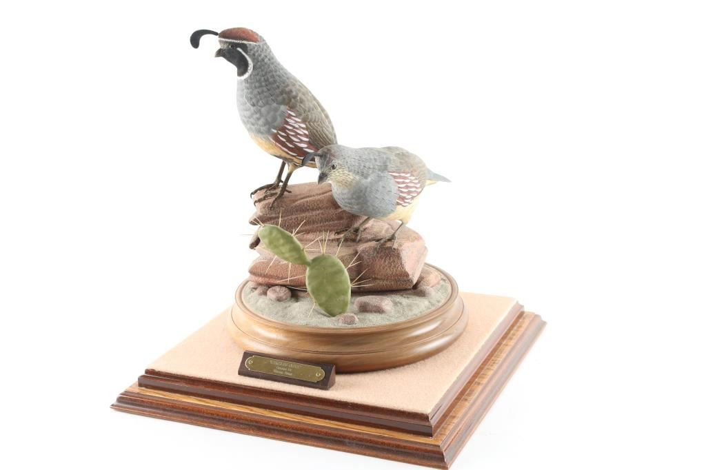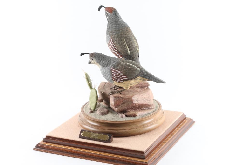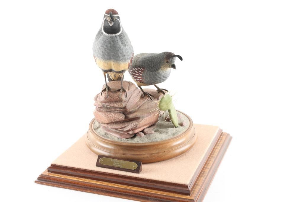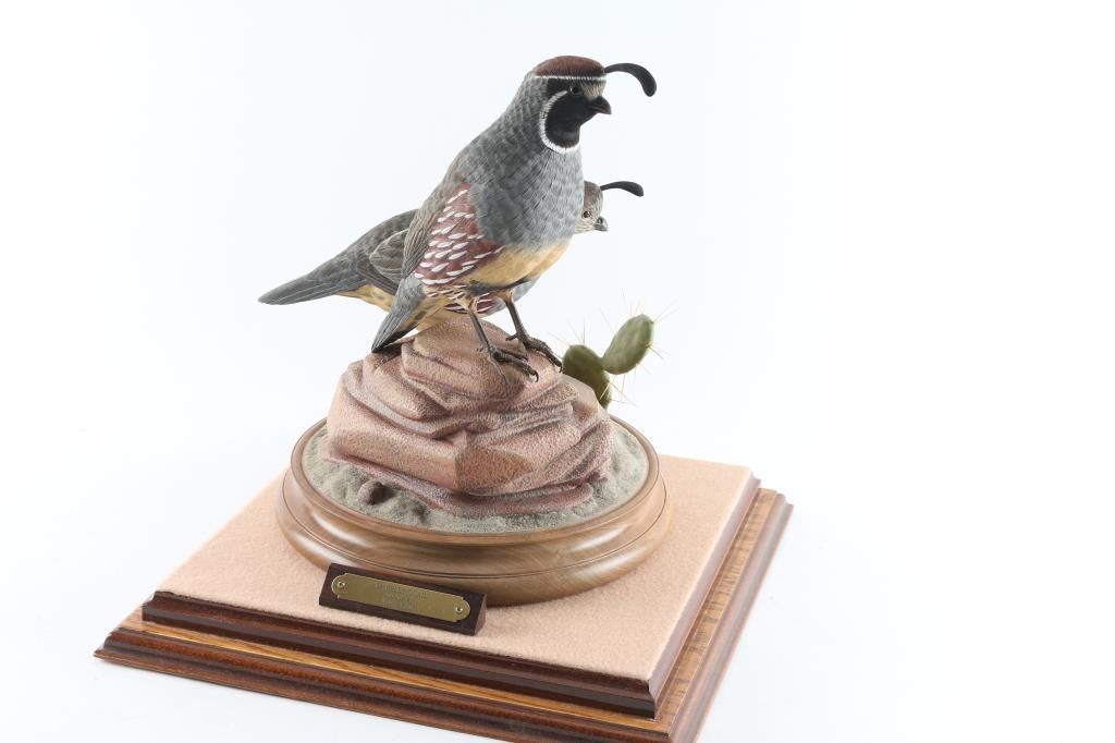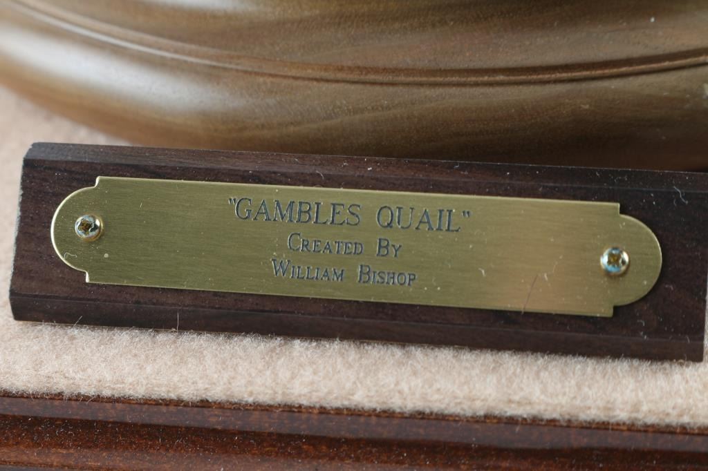 made by famous Prescott carver William Bishop entitled Gambles Quail measures 13"x10" in glass case. William Bishop won a first place award for this piece at the Desert Wood Carving show. Highly collected and his work is so fine that they appear to be mounts.