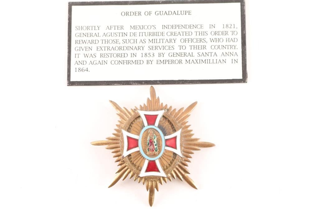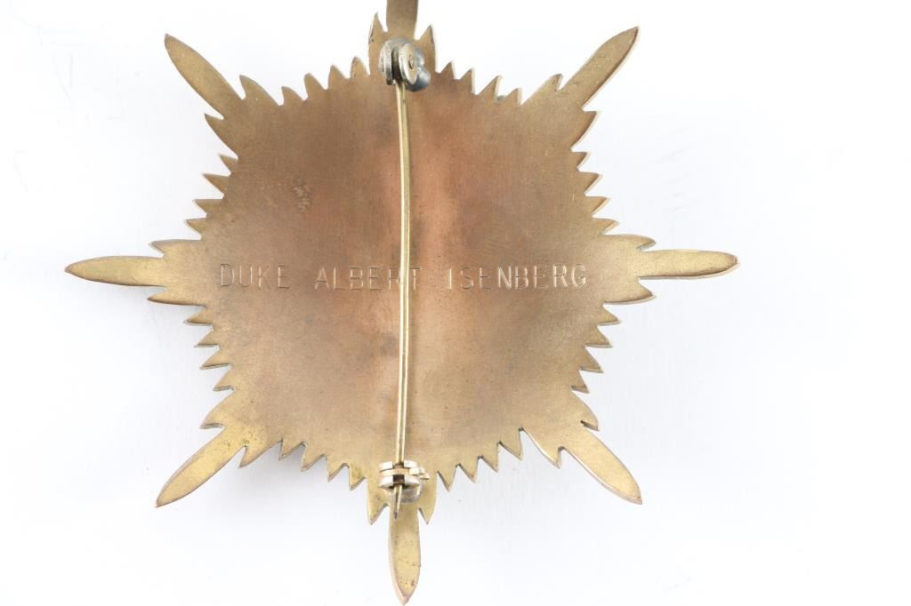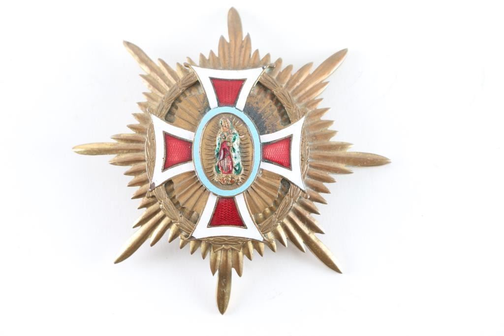 Breast star of the Grand Cross of the Imperial Order of Our Lady of Guadalupe formerly known as the National Order of Our Lady of Guadalupe, established by Emperor Agustín I in 1821, the order was renamed Imperial Order of Our Lady of Guadalupe in 1865. Red and white enameled cross. Back of medal is inscribed "Duke Albert Isenberg".