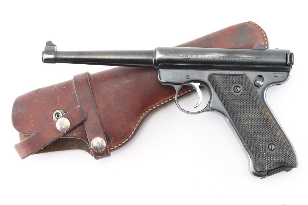 American made semi-auto pistol chambered in .22 LR circa 1979. Features a blued finish, 6" tapered barrel, pinned patridge front sight, dovetailed rear sight with square notch, serrated wide chrome trigger, manual safety/bolt catch on the left side of the frame, heel magazine release, factory 9 round magazine, steel grip frame and two-piece checkered black plastic grips with a black and silver Ruger medallion in the left grip panel. The blue metal finish is about 70% with holster, muzzle wear, some minor scratches/chips, and handling wear on the straps. Grips are very good, action is smooth, bore is excellent/bright. Comes in brown leather Hunter snap holster. Condition is NRA Very Good. Modern Firearm.