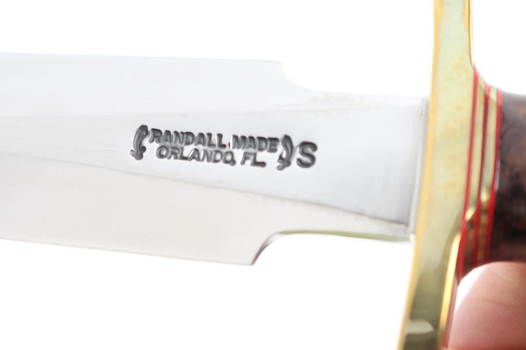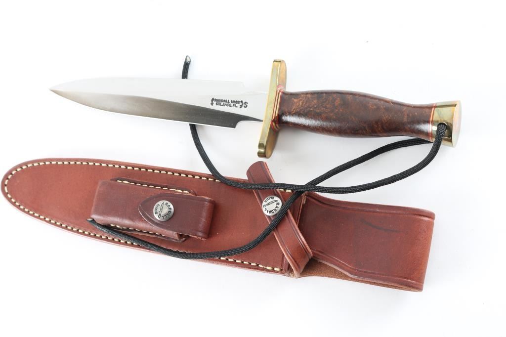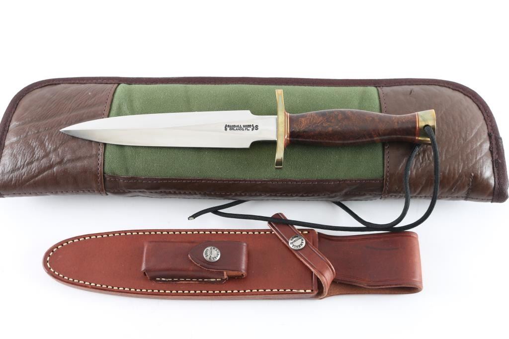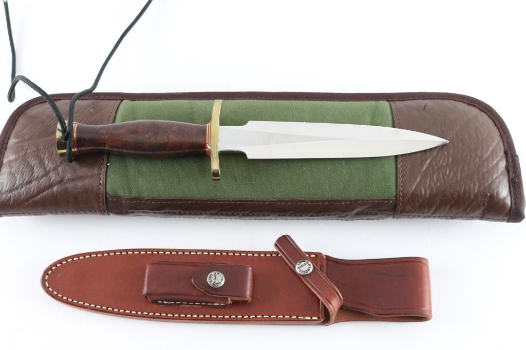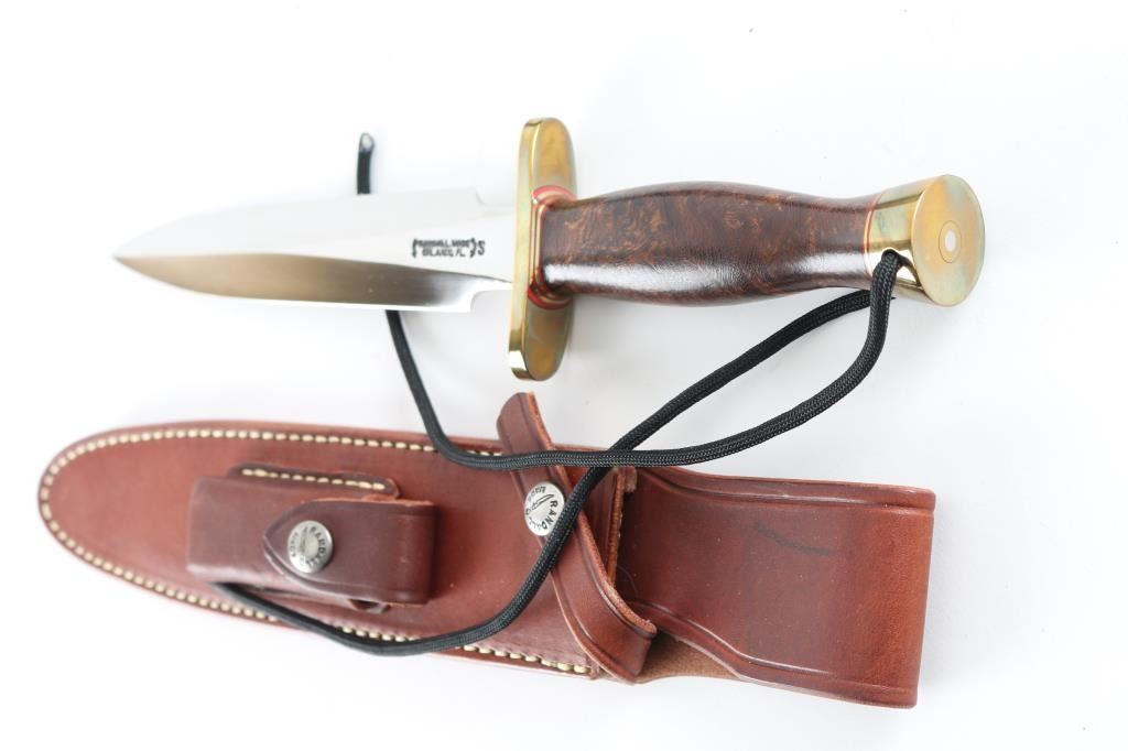 Model 2. 7" blade of 1/4" stock. Brass double forward curve hilt. Approximately 4 5/8"- 5" Burl wood handle. Brass butt cap w/ wrist thong through brass ferrule. This is a heavily made dagger or dirk. The knife is shaped along the lines of a famous British Commando knife, but is larger, stronger, and has a more comfortable grip.