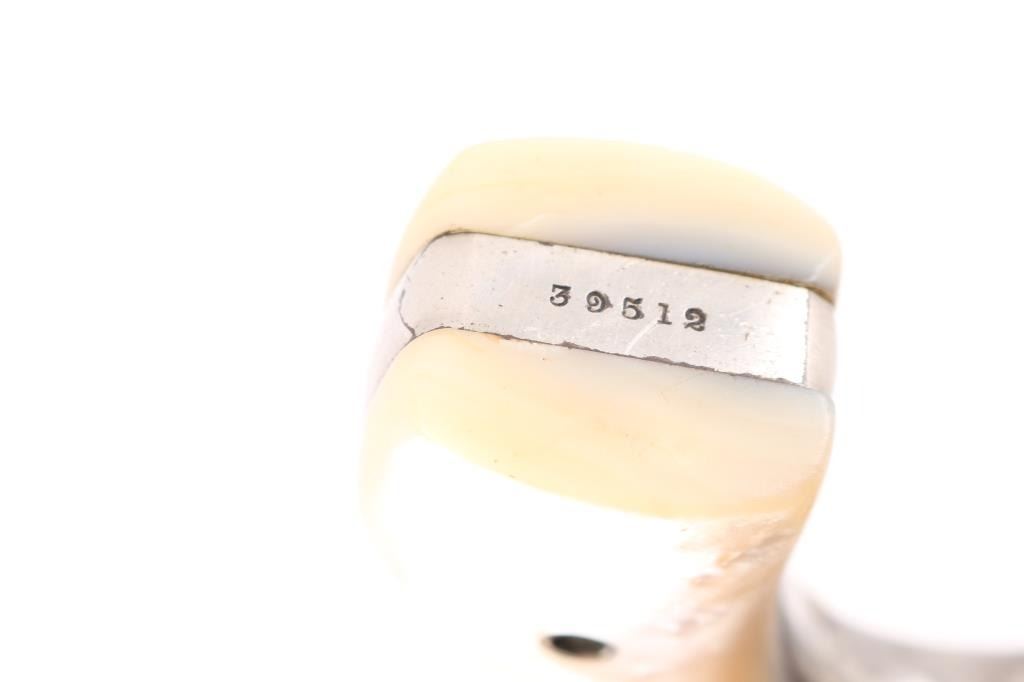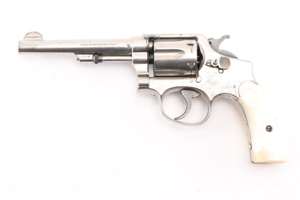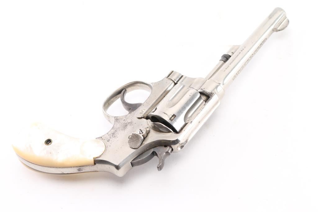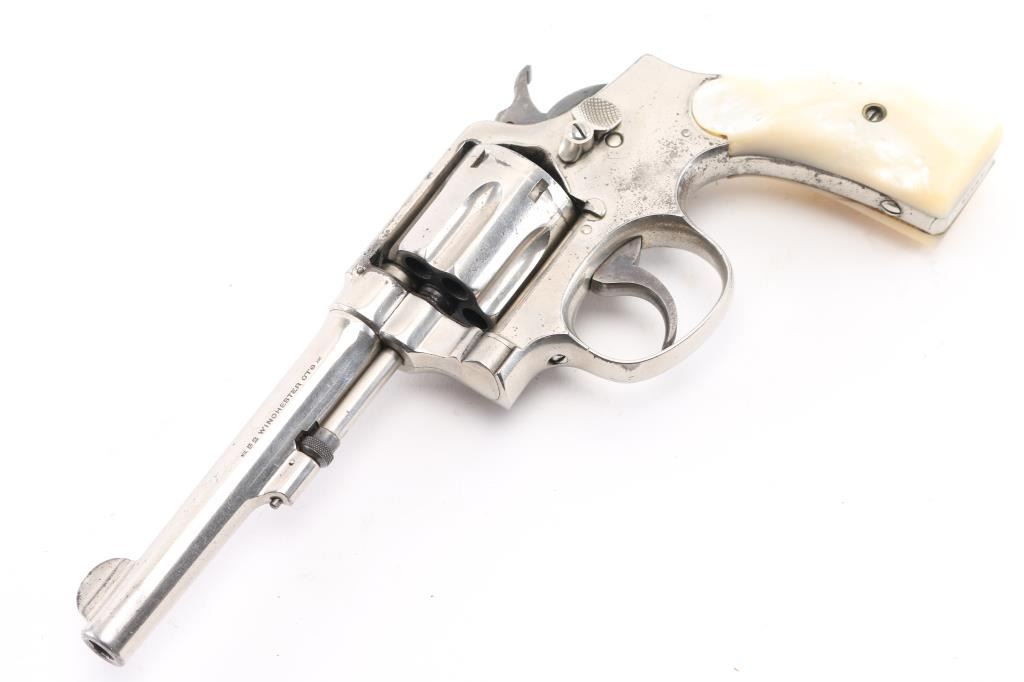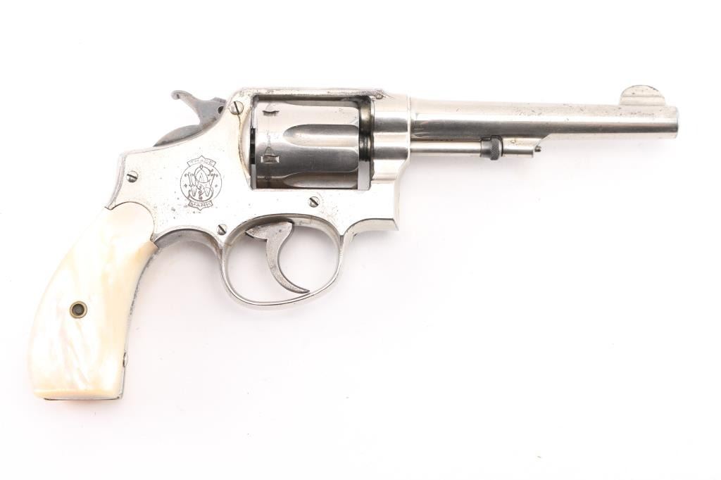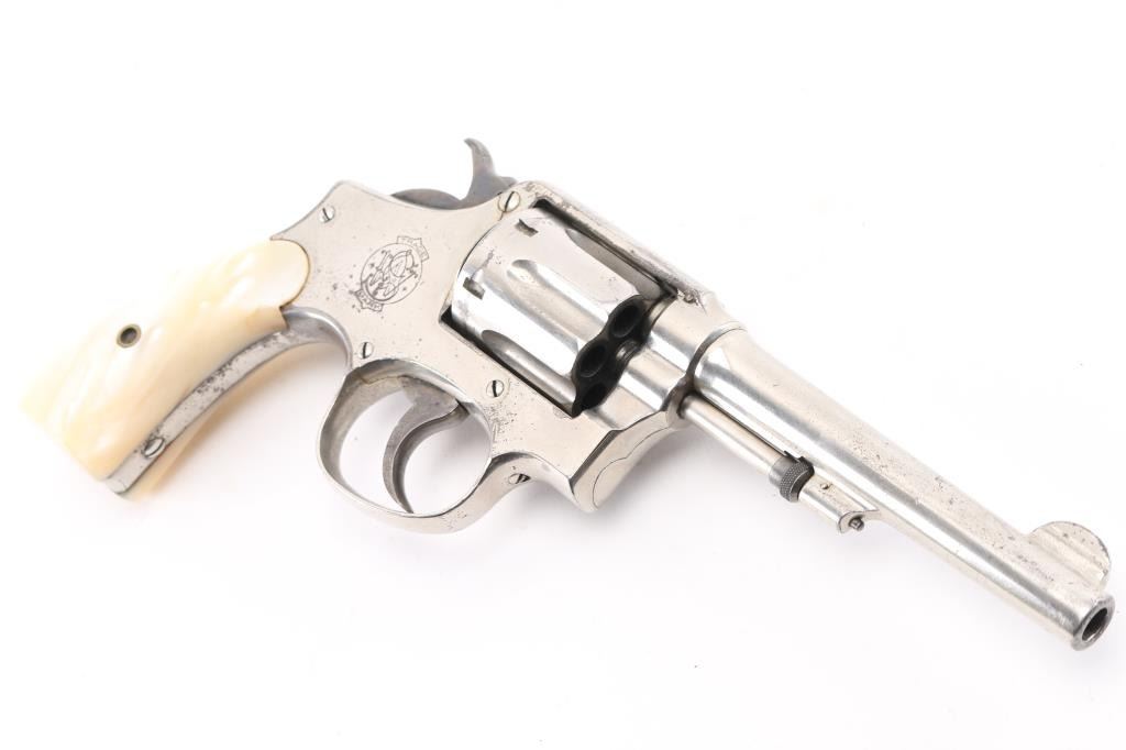 Model of 1905, 2nd Change' Vintage pre-war medium frame double action revolver chambered in .32 W.C.F, manufactured circa 1906-1909. Features a nickel finish, pinned 5" barrel with serrated blade front sight, square notched rear sight, non-shrouded ejector rod, fluted six-shot cylinder, case hardened .265" smooth trigger, case hardened hammer with knurled spur, five screw square butt K service frame and two-piece mother of pearl grips. Revolver exhibits approximately 75% of it's original nickel finish showing minor flaking, scratches. Action is smooth with good lock-up, the bore is good with some light, scattered pitting, good rifling, and grips are overall; very good. Matching serial numbers. NRA Condition-Good. C&R Firearm.