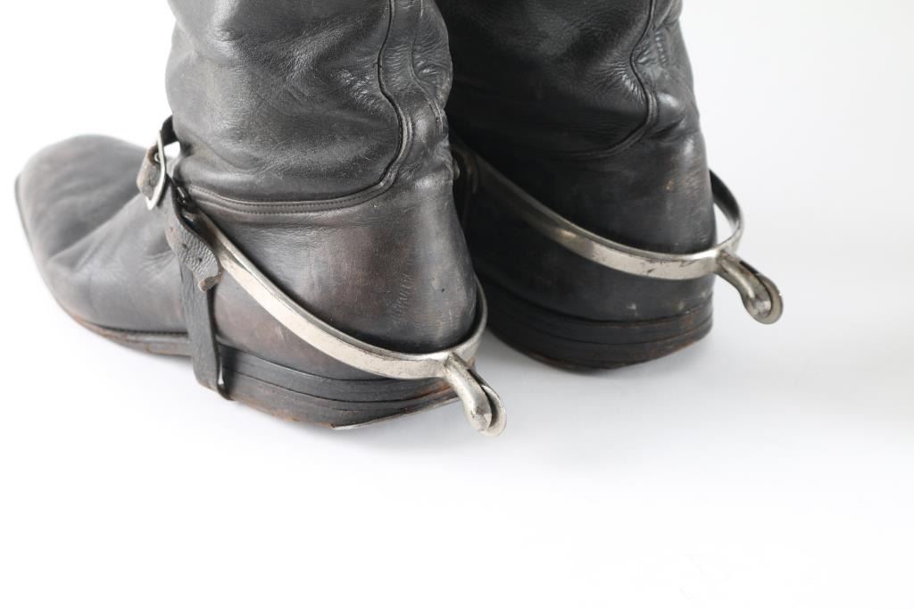 Two Total. 1)19th Century French Light Cavalry Boots. Some separation on the seam on one, scuffs, and some flaking to the leather 2) Vintage black leather cavalry boots, believe British, unmarked disc rowel spurs, good condition.