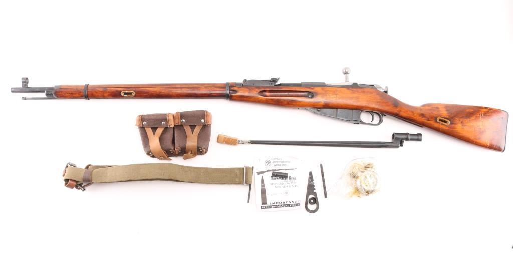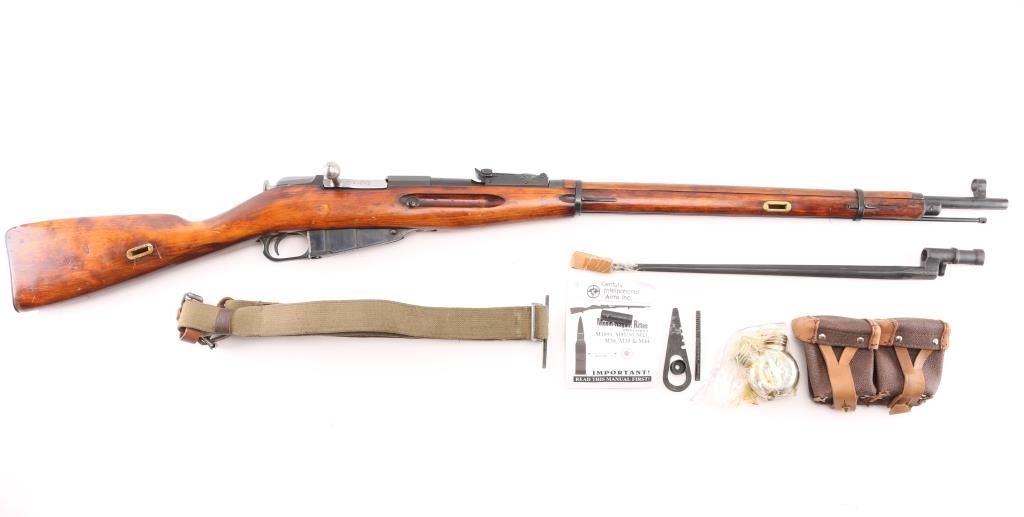Russian (Soviet Union) WW2 military bolt action Mosin Nagant rifle dated 1934. Imported by CAI (Left Receiver rail). Arsenal refinished. Features round receiver, blued finish, wood stock & handguard, 29" barrel, cleaning rod, post front sight, tangent rear sight, sling slots. Bore is dark/rough. Metal retains 90% dark black color arsenal re-finish, with minor edge wear/scuffs. Bare metal bolt. Wood is very good with minor scratches/scuffs. Original serial number matches on receiver, bolt. floorplate, and steel buttplate. Includes bayonet, cartridge box, sling with "Dog collars", oiler, take-down tool, & cleaning gear. Condition is NRA Fair (Bore). C&R Firearm.
