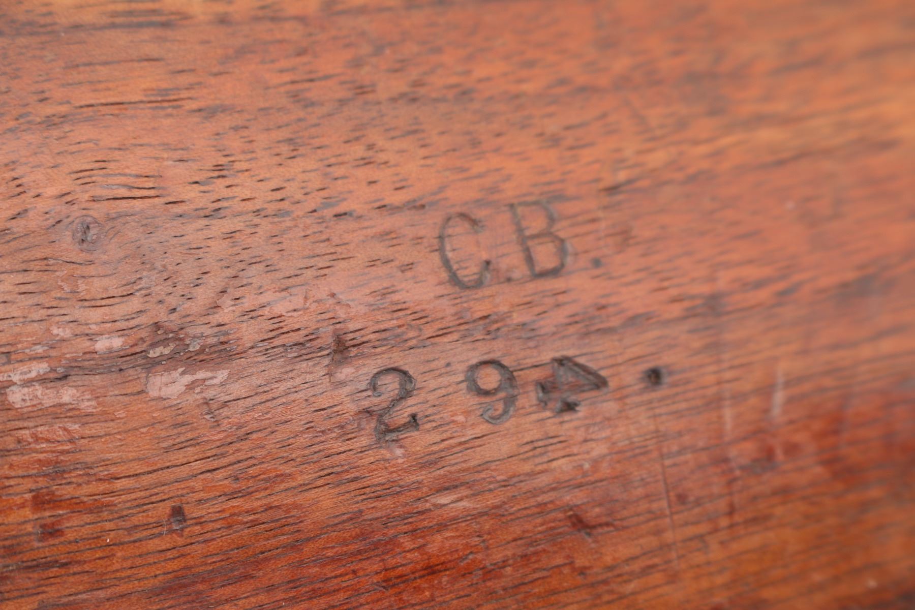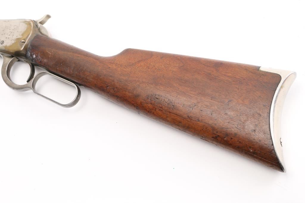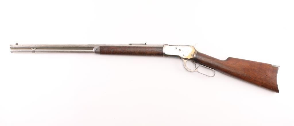 This rifle was imported to Great Britain in the early days of WW1.Vintage lever action rifle chambered for .44 Winchester Center Fire (44-40) ammunition circa 1912. It has a 24" round barrel, full length magazine tube, blade/bead front sight, adjustable rear buckhorn sporting sight, missing the elevator, smooth trigger and knurled hammer spur. Two piece smooth wood stocks have a metal forend cap and a crescent metal butt plate. Standard Winchester markings. This rifle has the London inspection proof , crown over "V" on the barrel, & receiver, the barrel also has the "not English Made" stamp, London black powder, crown over "CP', and the bore diameter, and case length. They were standard sporting rifles in 44 WCF but they all had round barrels, which were purchased and used by the British during WW I. These are marked with CB and then a number on the stock. This rifle has "C.B.", & "294" stamped on the right butt stock. It is stamped on the underside of the fore stock, forward of the receiver "RGP". (Royal Gibraltar Police.?) Most of these rifles went to the Royal Navy. The rifle has a old nickel finish, we found one other British 1892 with the same finish. The bore is fair, good rifling, with scattered light pin-prick pitting, wood is sound with many dings/dents, action is crisp/tight, is mostly all there with handling loss to the receiver, and tangs. NRA Condition-Fair to Good. C&R Firearm.