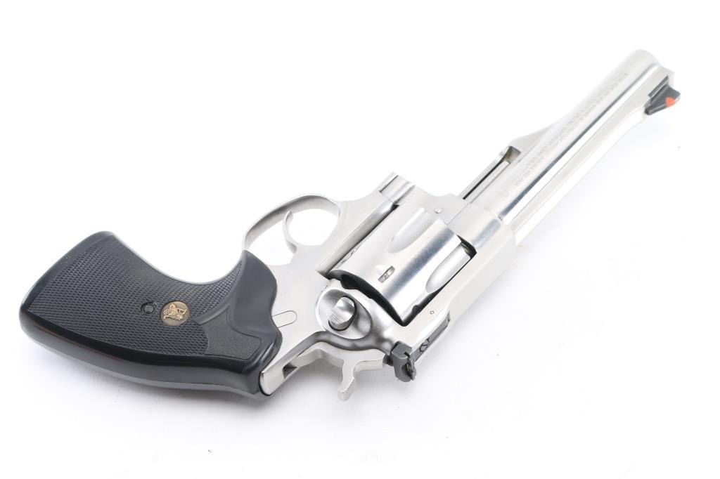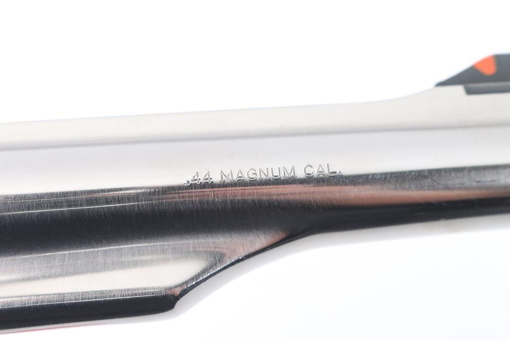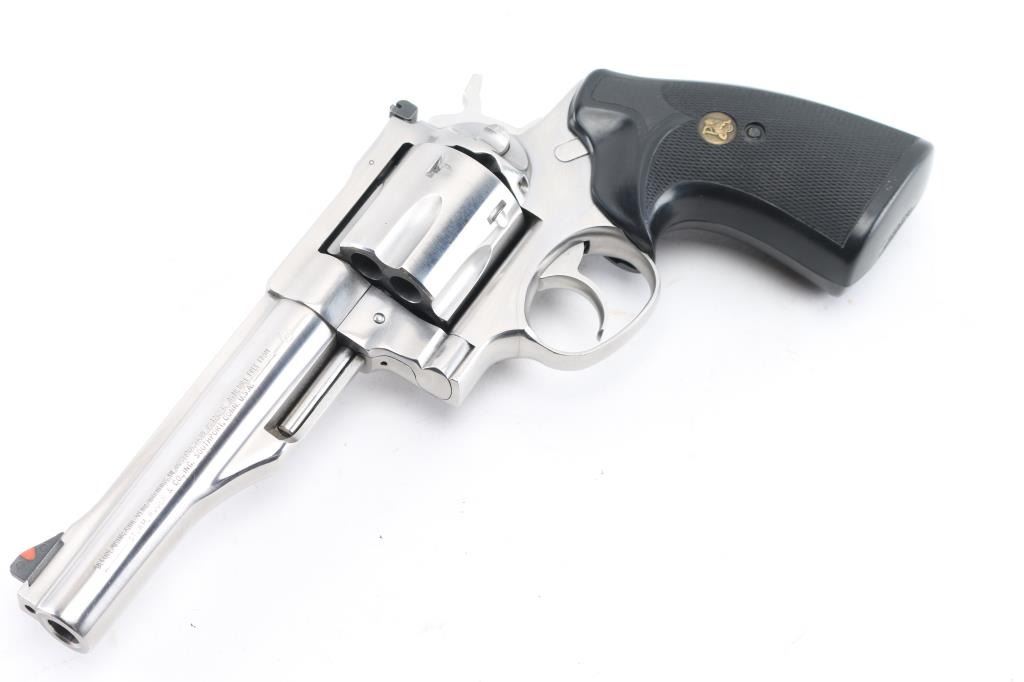 Double action revolver chambered for 44 Magnum. Features stainless steel construction, 5.5" barrel, adjustable sights with orange ramp front and white outline rear, fluted 6 shot cylinder, textured black rubber Pachmayr grips. Bore is excellent. Metal finish is excellent condition with a few small shiny spots from handling. Grips are excellent. Action operates smoothly and locks up tight. Condition is NRA Excellent *** Modern Firearm ***