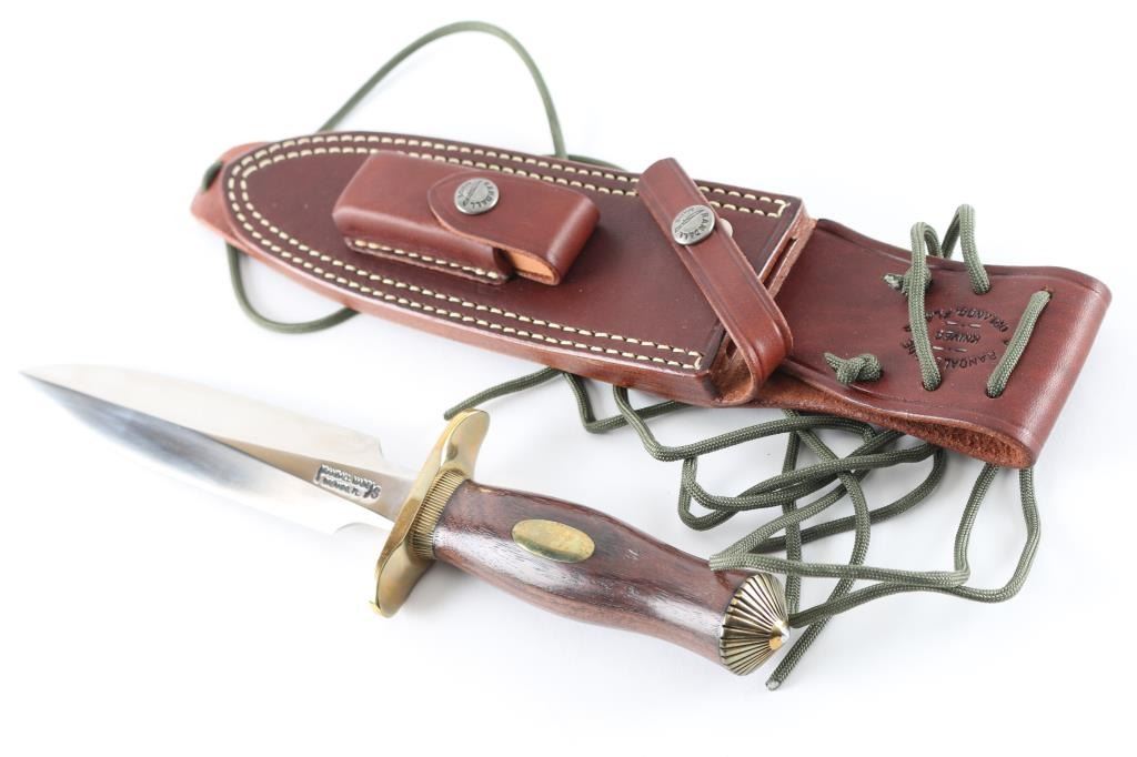 Model 2. 7" blade of 1/4" stock. Brass double reverse hilt. Approximately 4 5/8"- 5" wood handle. Brass umbrella butt cap. Comes with brown leather sheath and sharpening stone. This is a heavily made dagger or dirk. The knife is shaped along the lines of a famous British Commando knife, but is larger, stronger, and has a more comfortable grip.