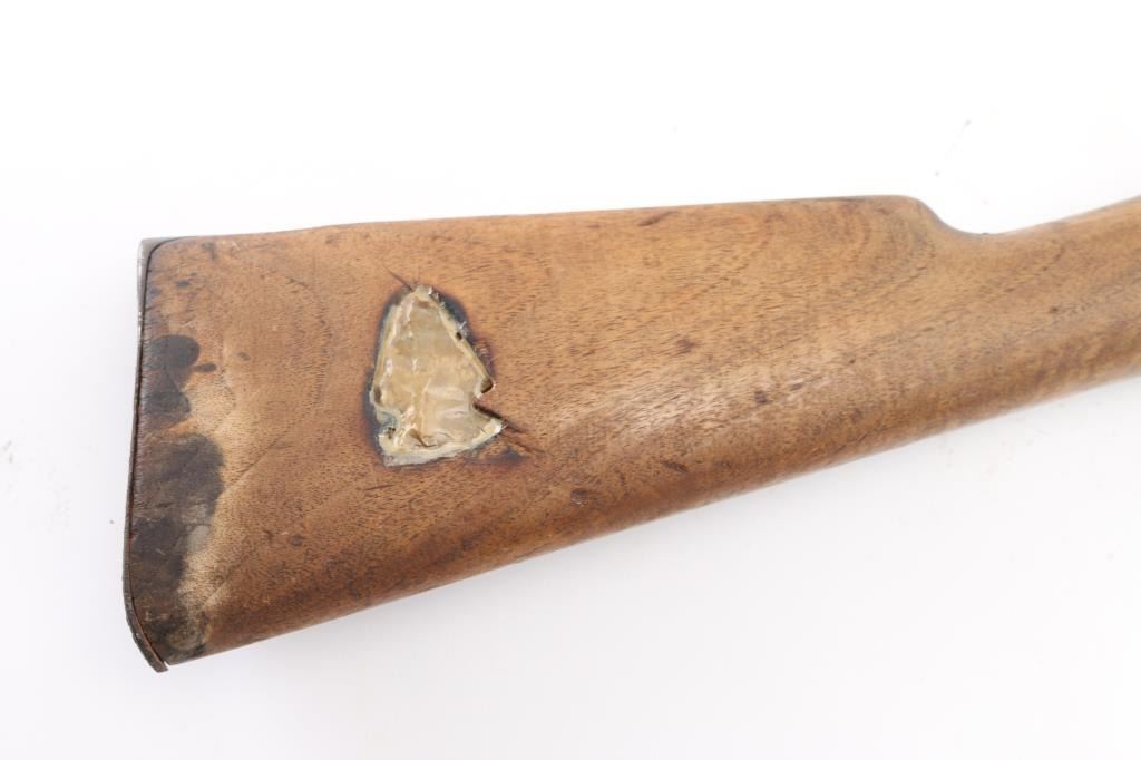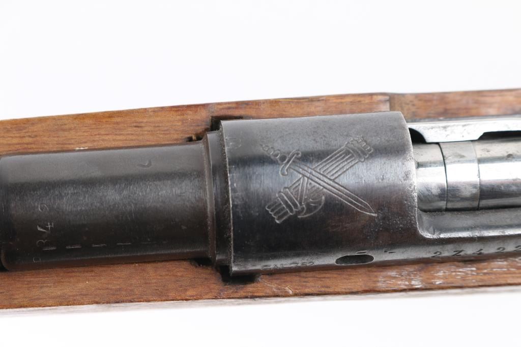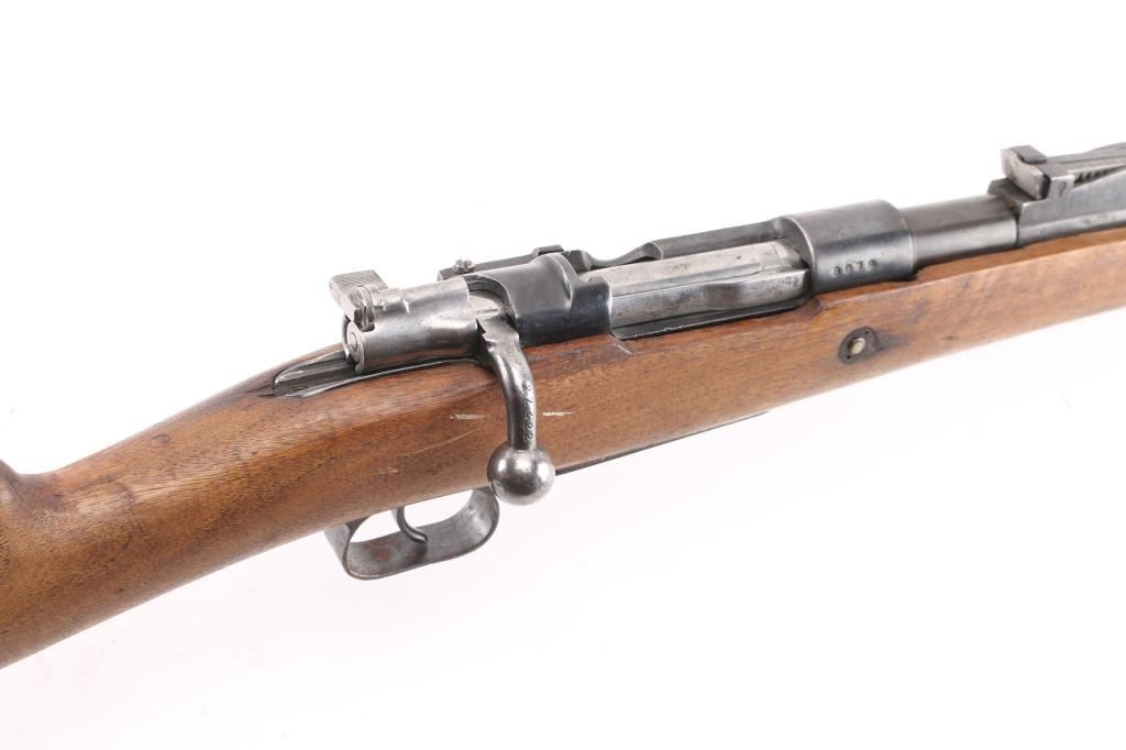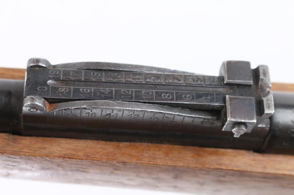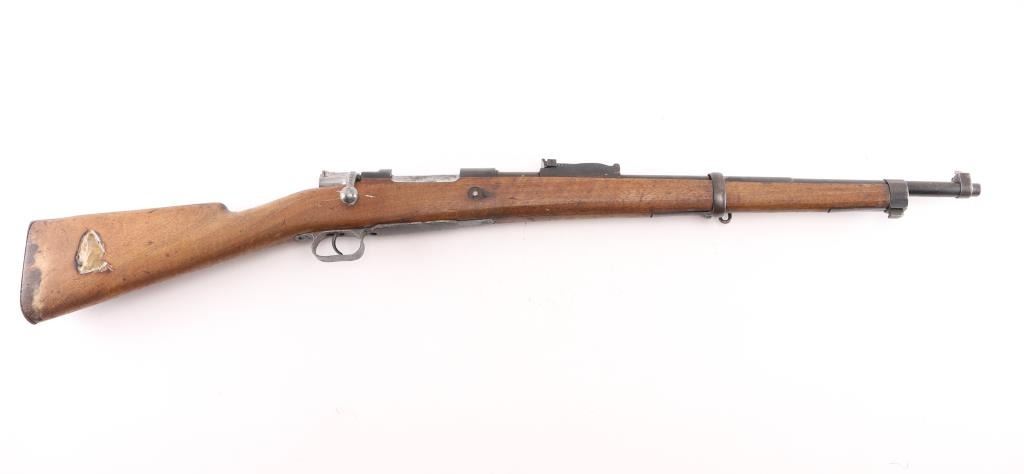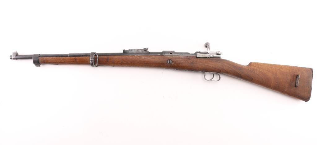 SN: 2Z422/8087. The Mauser M1916 "Short Rifle" was produced in Spain by Oviedo. These rifles are the carbine version of the classic Mauser action. This rifle was imported by SAMCO, and the mark is under the muzzle. Rechambered in the 1960's. Sword/axe crest on chamber. Bore is excellent/bright, metal finish is good, butt plate has rust spots, someone has inletted a flint arrowhead in the right buttstock, wood is overall good with some water stains on the lower right buttstock. NRA Condition-Good. C&R Firearm.