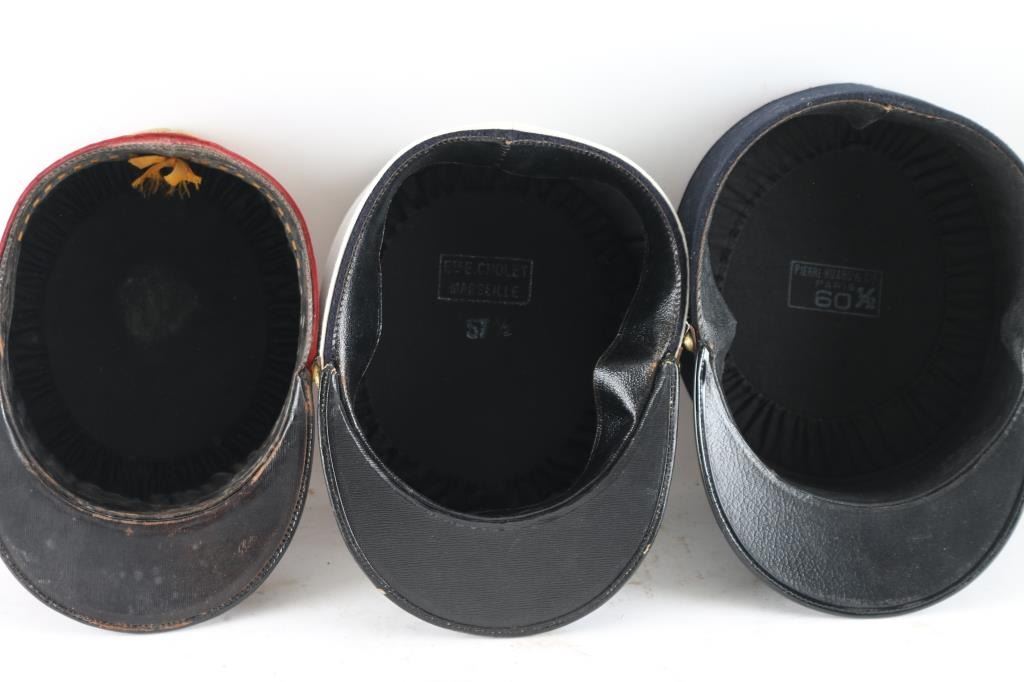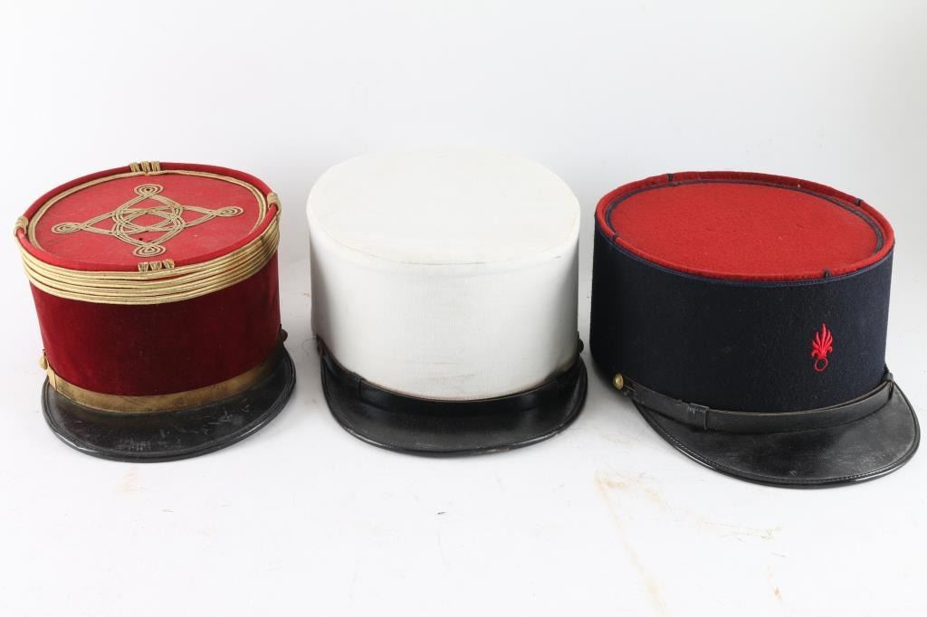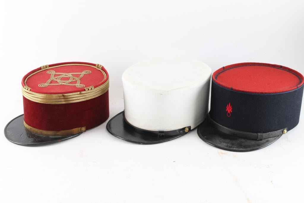 Three Total. 1) A dark blue wool band measuring approximately 4" high with a red wool crown and dark blue piping. An upright, red wool flaming grenade is to the front. A leather chinstrap is held in place by a pair of brass French Legion buttons. The interior is fully lined in black cloth. Complete sweatband. Size 601/2. Late 1930's or early 1940's model. Excellent. 2) Same as above, but this is the iconic plain white kepi. Makers label on interior crown. Size 57 1/2. Excellent. 3) Officers Kepi, private purchase, red felt with gold trimmings. Around the upper part of the kepi are four bands of gold piping, denoting the rank of Chief de Bataillon (Major), quatrefoil design to the crown. Interior has leather sweatband and maker stamp to the sweatband. Overall condition is very good, with typical signs of wear and age, a couple on minor moth nips on the crown. From the Joseph Musso Collection