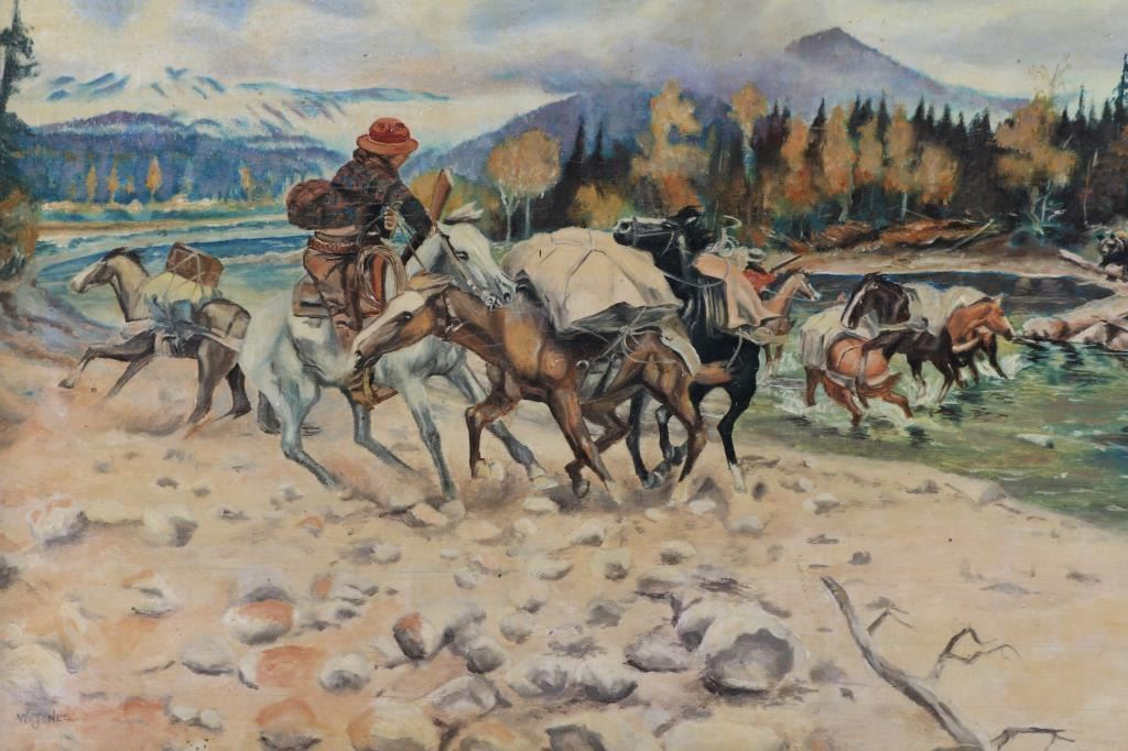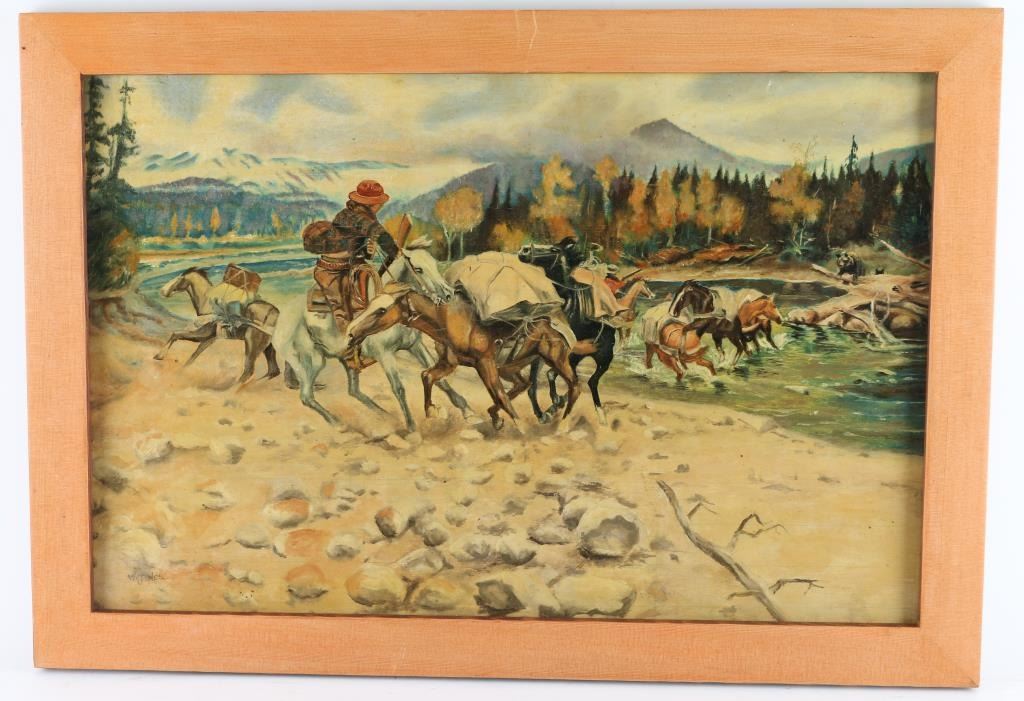 By artist "Wendall Jones"signed lower left, framed in wood frame. Image size measures "21x17" Depicting action scene of horse back travelers being chased by a grizzly bear across a river.