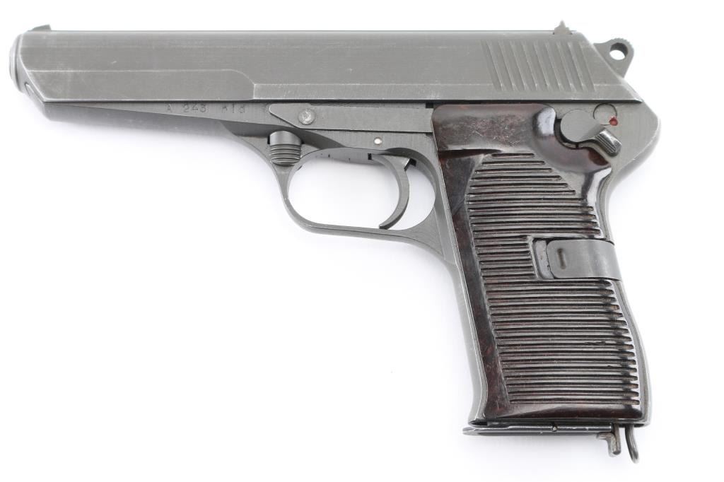 8+1 Capacity. Recoil operated, roller locked action. Czechoslovak Military issued pistol. Produced 1952-1954. In service until 1984. 4.7" barrel with front blade and u- notch rear sight. Frame mounted thumb safety, Heel magazine release. Lanyard ring. "rid" marked indicating issue to the military. Manufactured 1953. Matched serial numbers. Gray parkerized finish. Brown bakelite grips. Bore is excellent/bright Slide action is smooth/tight. Metal finish is good with minor edge wear/scratches. Grips are good with some minor scratches. Importer marked on right frame. Comes with one 8-rd magazine. NRA Condition- Very Good Good. C&R Firearm.