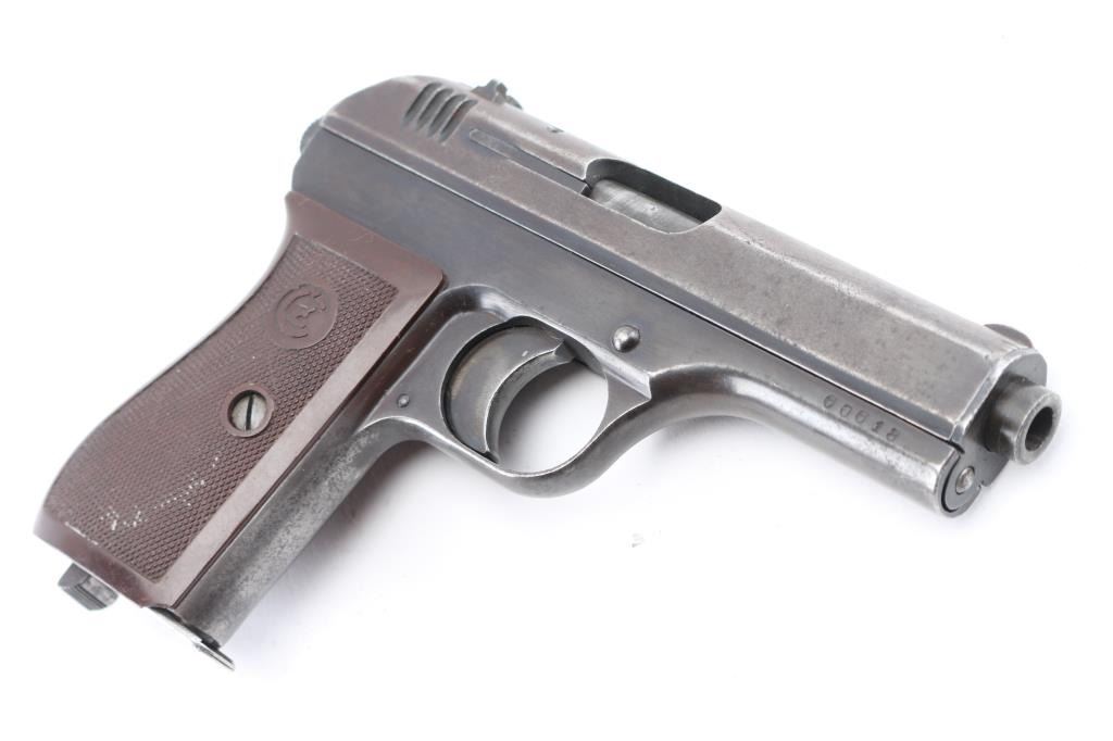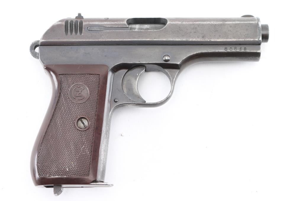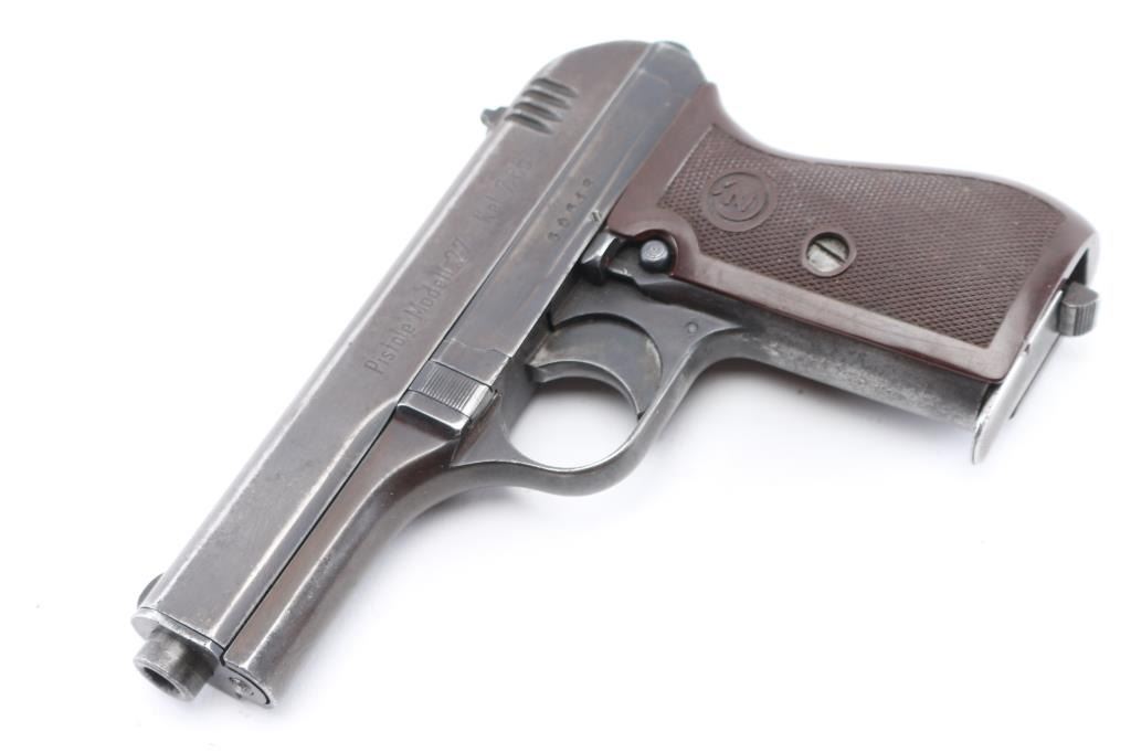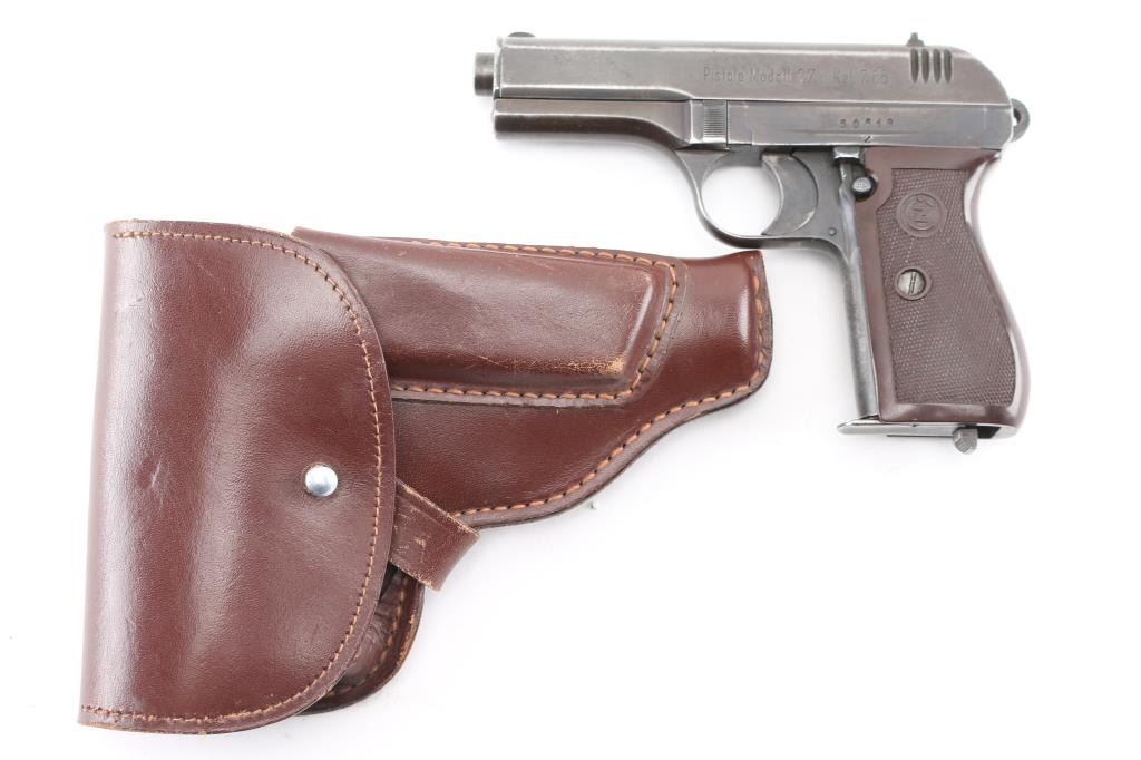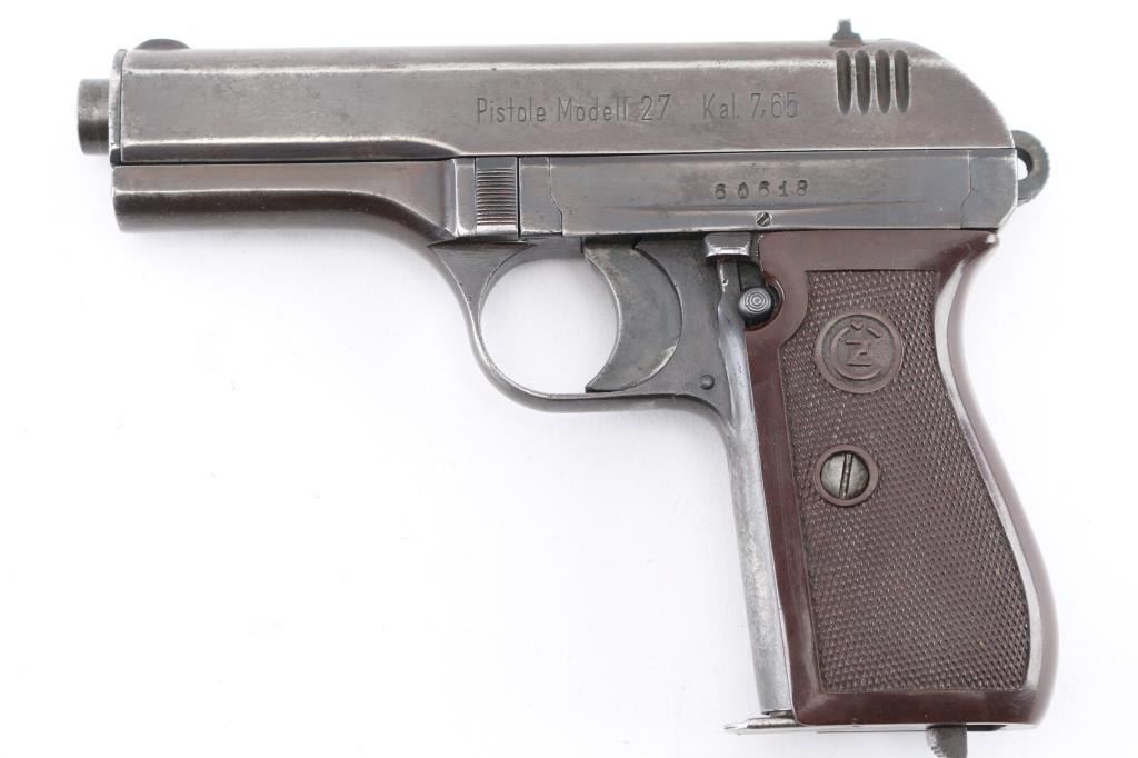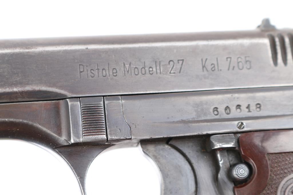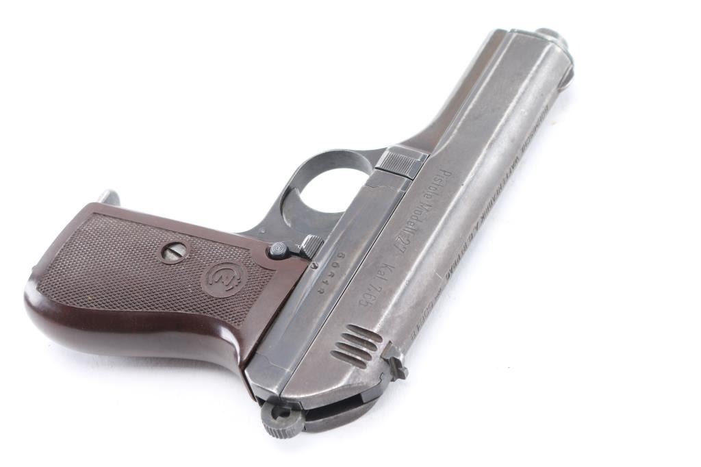 WW2 Semi-automatic. Czechoslovakian military semiautomatic pistol chambered for the 7.65 / 32acp cartridge. Manufactured under occupation in WWII for the German Police/Military. Retains Waffenamt Eagle/WaW 76 on the right frame. Features fixed sights, approx. 3.5 inch barrel. Matched SN's on Frame/slide. Eagle/swastika proof on barrel. Left slide stamped "Pistole Modell 27 Kal. 7.65". Top of slide marked " Bohmische Waffenfabrik A.G. Prag" with Eagle/WaA76 Waffemamt. Bore is excellent/bright. Dark brown checkered plastic grips with CZ motifs are in very good condition. Blue finish has dulled, with the slide turning a brown patina, handling wear to the fore strap. No import marks observed. Comes with one 8-rd magazine, and a post war East German Army holster, brown leather, Unit marked NVA (National People's Army) "III/B". NRA Condition- Good. C&R Firearm.