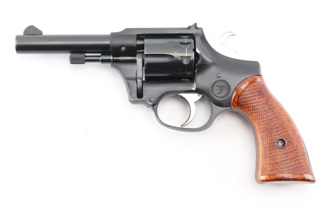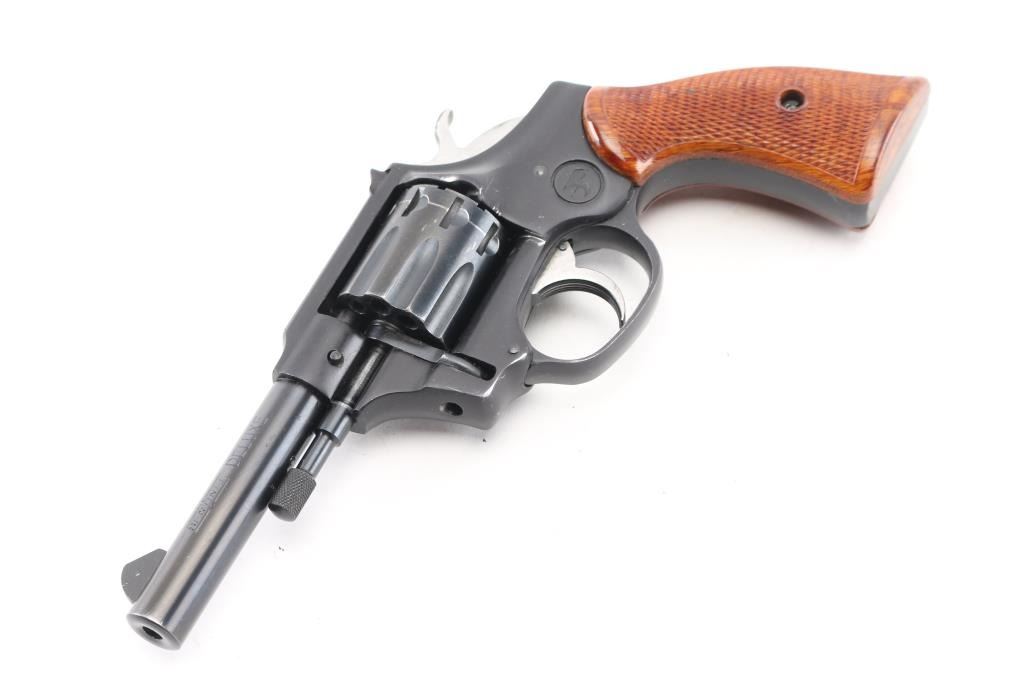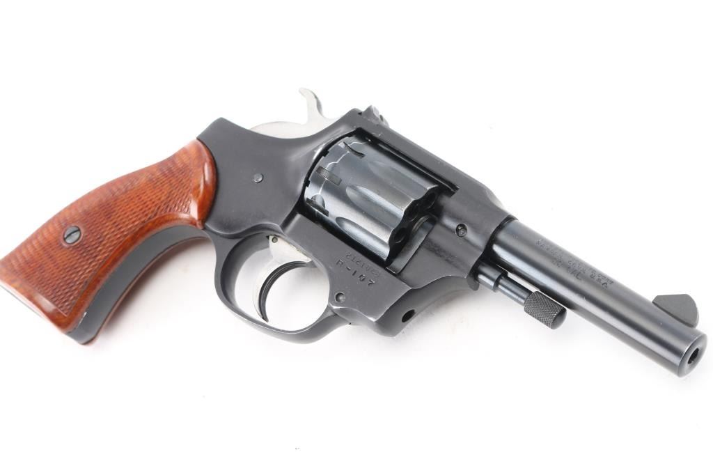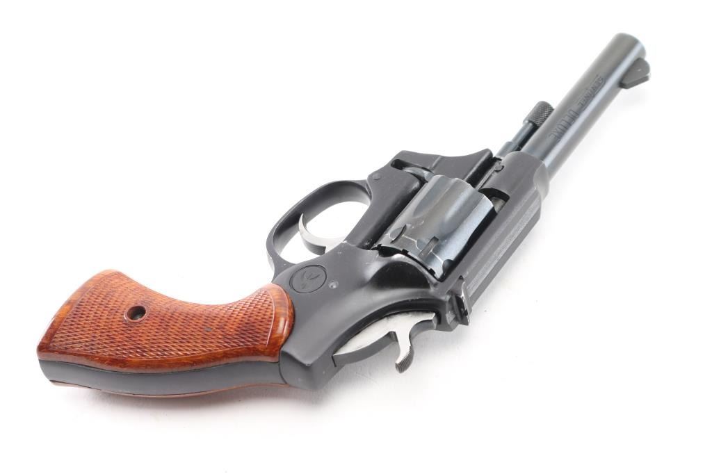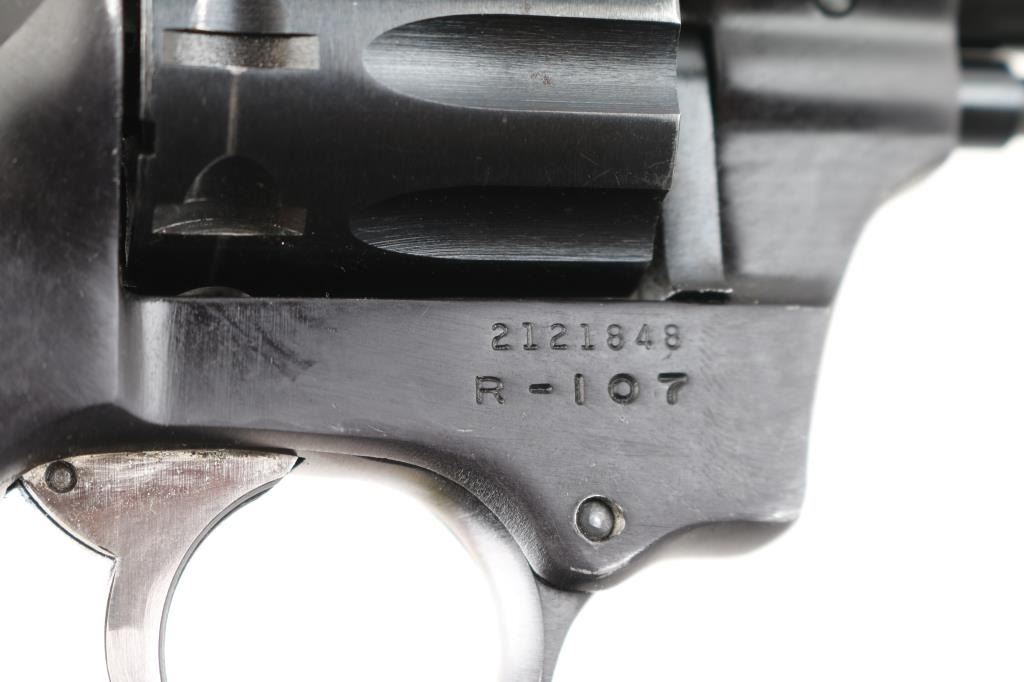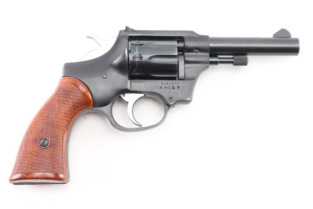 SN: 2121848 Double action nine-shot rimfire revolver manufactured circa 1969, chambered for 22 Long Rifle. Features a blued finish on steel parts with matching color aluminum alloy frame, polished bright metal sides on hammer & trigger, 4” barrel, serrated ramp front sight, dovetailed notch rear sight, serrated trigger, serrated hammer spur, ejector rod pulls forward to release the fluted cylinder, square butt frame, two-piece checkered brown plastic faux wood grain grips. Bore is very good condition. Retains 95% finish with edge wear, drag line. Grips are very good condition. Action is smooth with good lock up. Condition is near NRA Excellent *** C&R Firearm ***