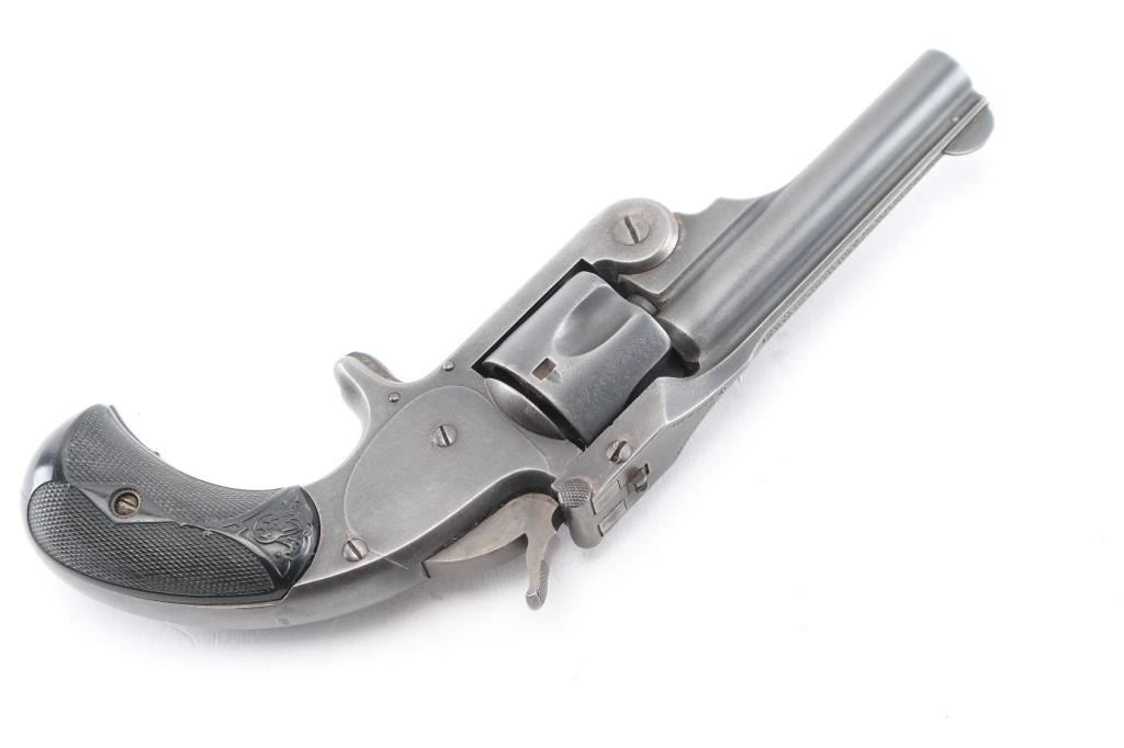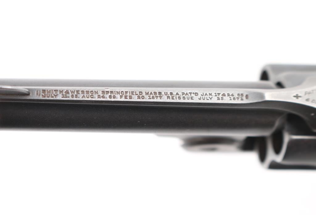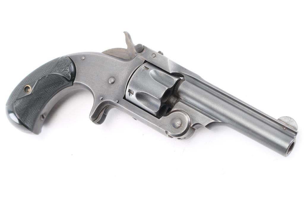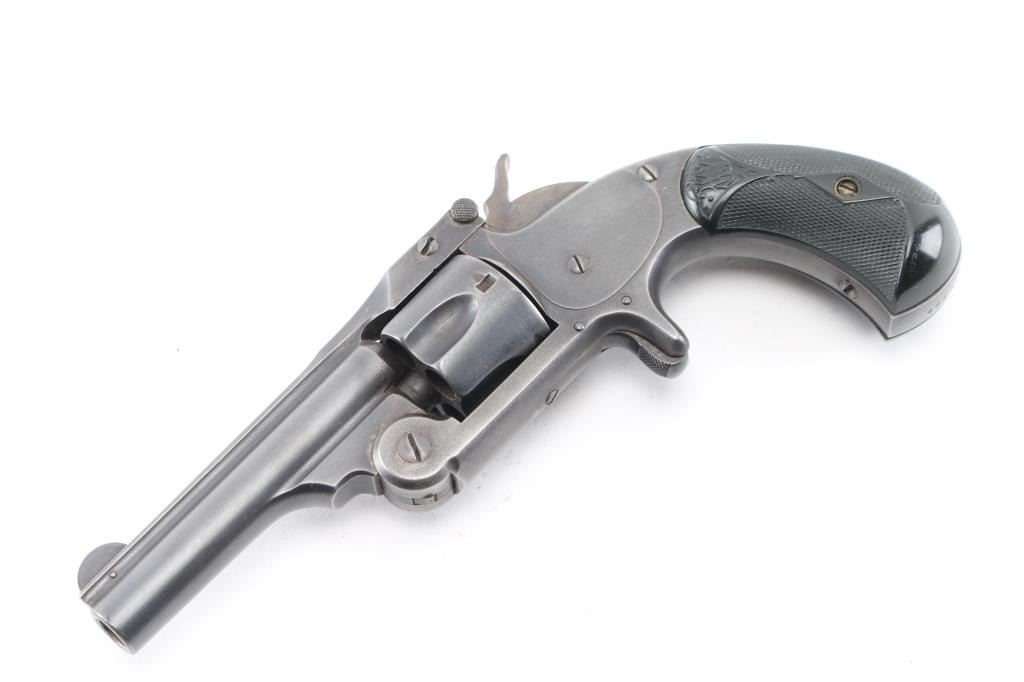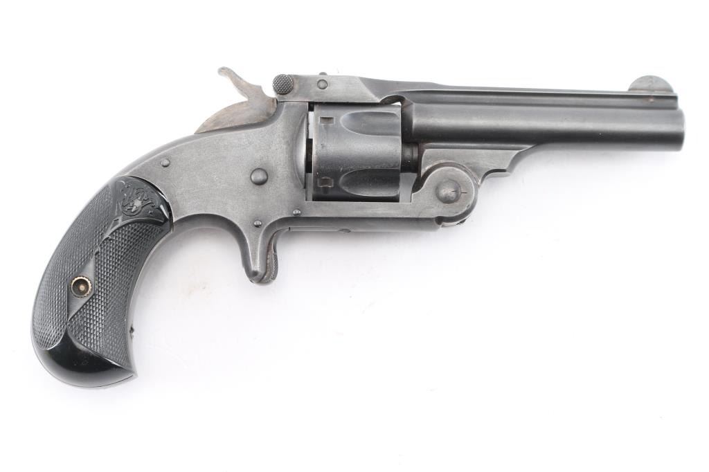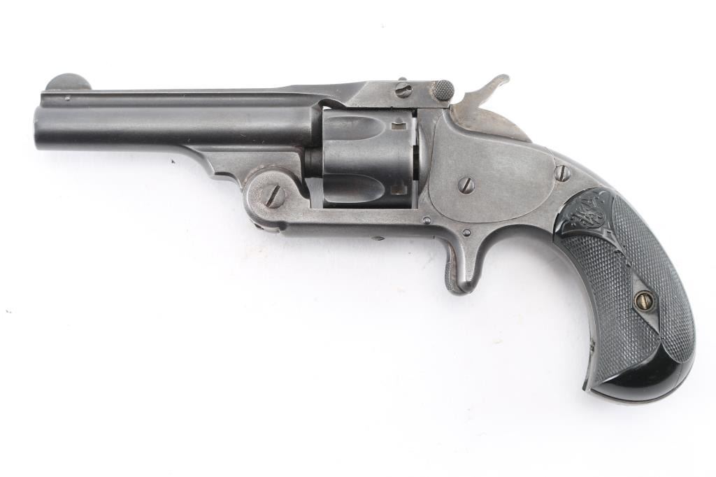 Manufactured from 1878 to 1892, this is the earlier Model 1 1/2 marked with the two line address/patent reissue dates on top of the rib and the V shaped patent marking on the top strap. Matching serial numbers on butt, latch and cylinder. Pinned blade front and notch rear sights, five round fluted cylinder, 3" ribbed barrel, spur trigger, re-blued finish, two-piece checkered hard rubber grips with "S&W" monograms. Bore is fair with much light pitting, especially in grooves, rifling present throughout. Retains 90% coverage of dull re-blue, with edge losses. Grips are very good. Action is good with good lock-up, ejector star is a bit slow in operation. Markings are sharp. Condition is NRA Very Good *** Antique Firearm ***