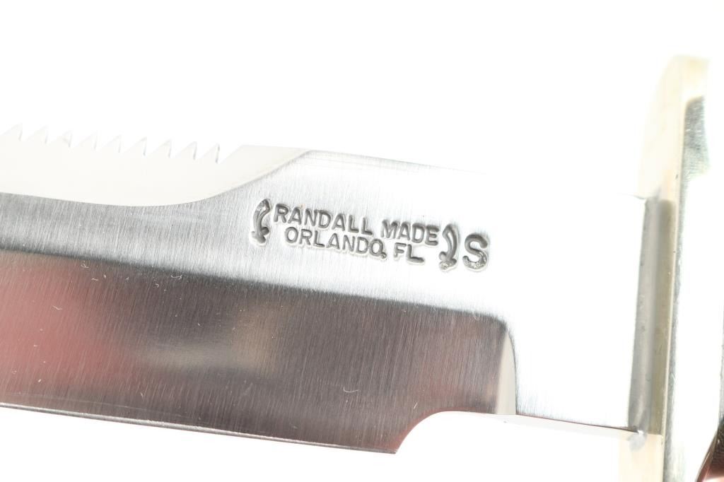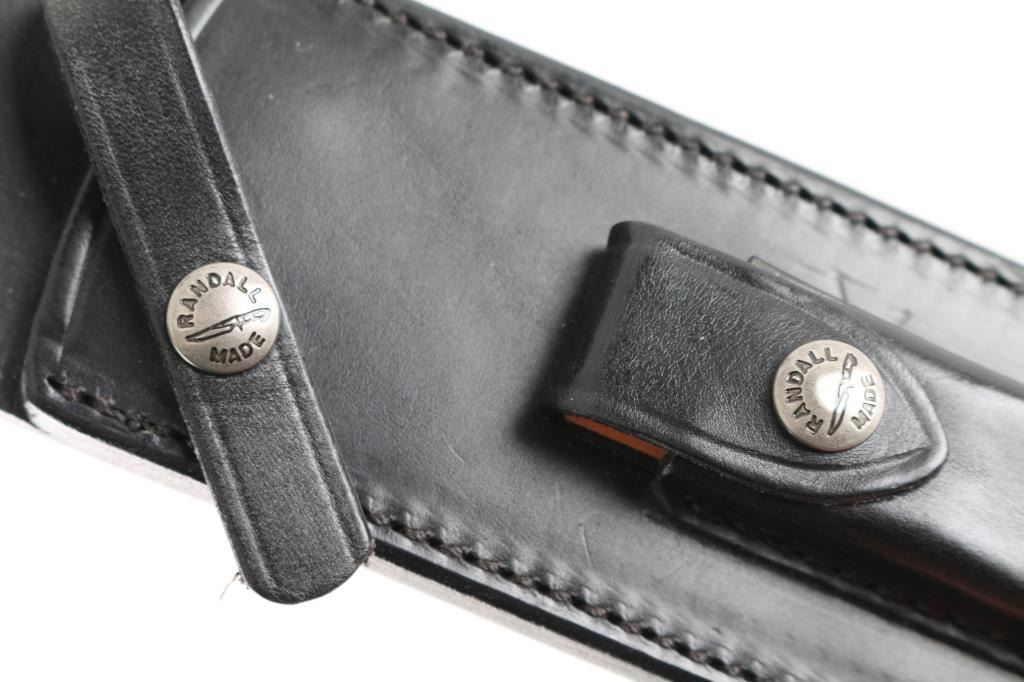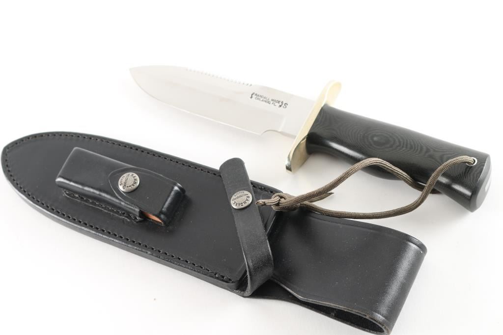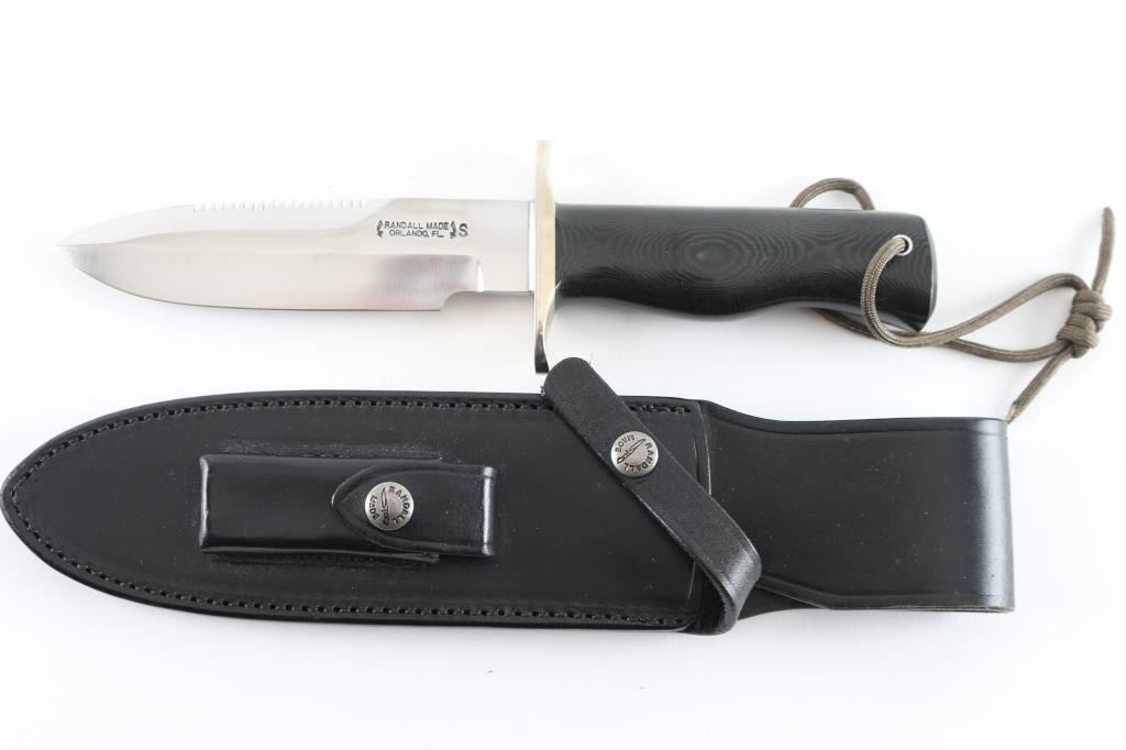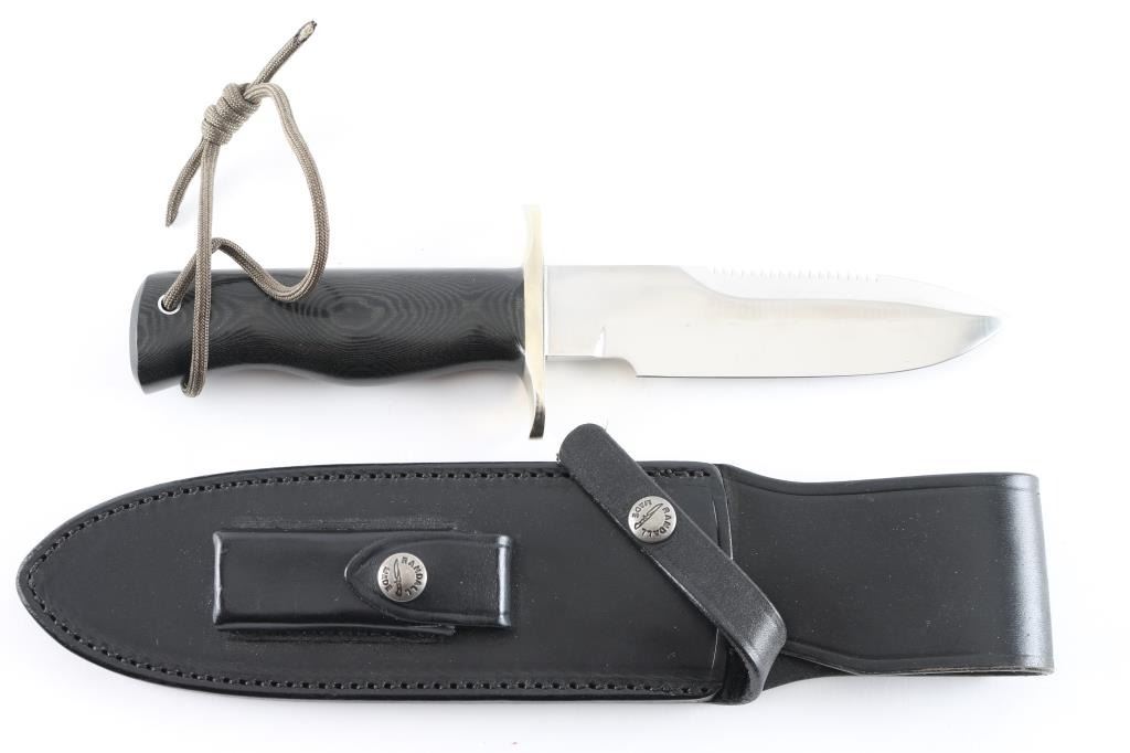 Model 18 Attack Survival. 5 1/2" of 1/4" stock. Sawtooth edge on top (saw teeth not offset). Silver soldered to 1/4" oblong brass hilt. Approximately 4 3/4" black micarta grip w/ wrist thong through nickel ferrule. Comes with black leather sheath and sharpening stone.
