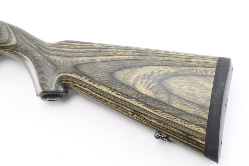 Stainless barrel and receiver with a green/black laminated Mannlicher stock configuration, rubber recoil pad, blade/brass bead front, and flip white diamond rear sights, Ruger grip cap, receiver drilled/tapped for optics. Includes Ruger 10 round magazine. Bore is excellent. wood & metal finish are excellent. NRA Condition-Excellent. Modern Firearm.