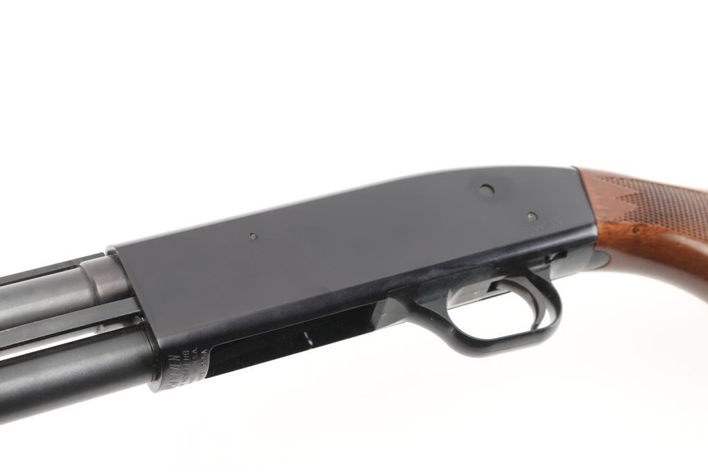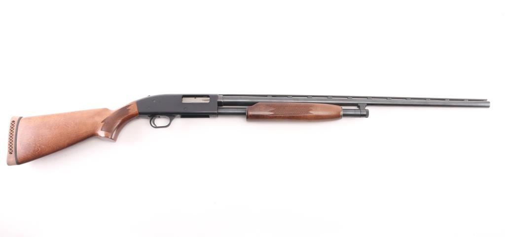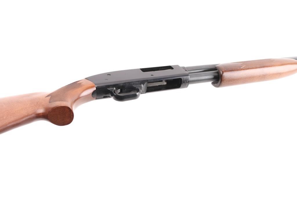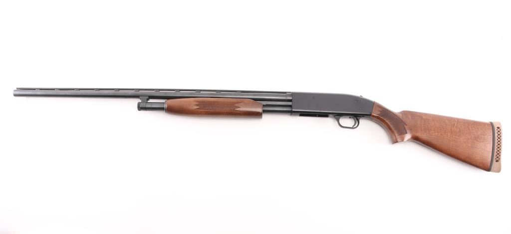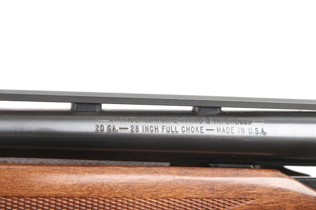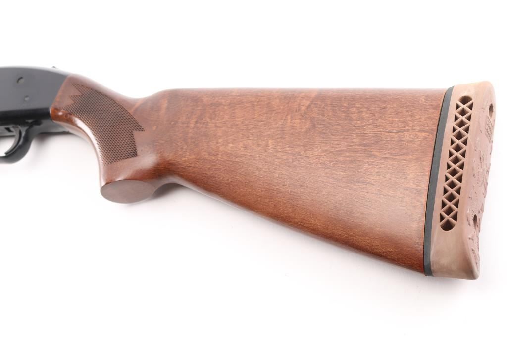 Pump action shotgun. Features blued finish on steel parts, black anodized aluminum receiver, black polymer trigger guard, hardwood stocks with impressed checkering, 28" vent rib barrel, fixed Full choke, steel bead front sight, single action bar, sliding safety on rear of receiver, ventilated rubber recoil pad. Wood plug in mag tube. Bore is very good bright condition. Retains 95% finish with handling marks. Wood is near excellent with few minor blemishes. Recoil pad is ill fitting, otherwise very good. Includes a spare 29" vent rib barrel, Mod choke, brass bead. Condition is near NRA Excellent *** Modern Firearm ***