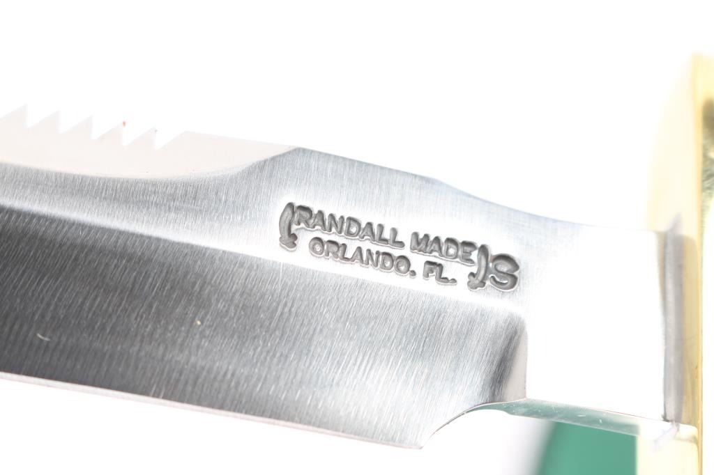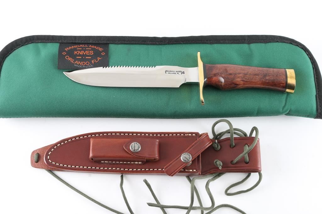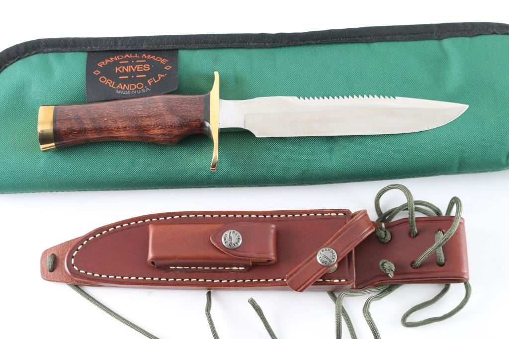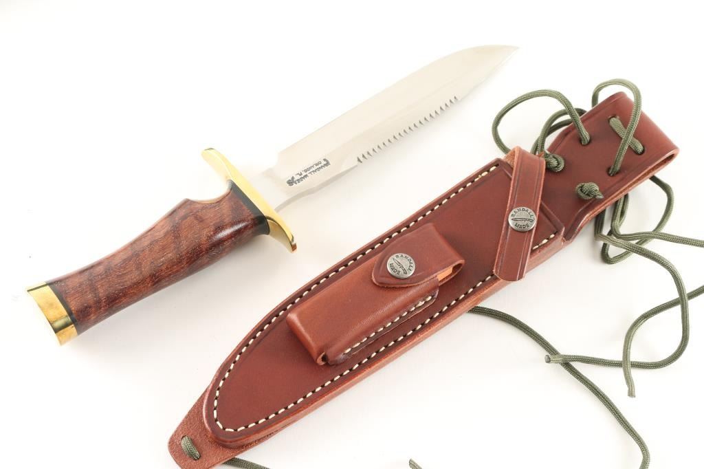 Model 1 All Purpose Fighter. 6 3/4" blade of 3/16" stock. The top cutting edge sharpened approximately 2" inches with additional 2 3/4" saw teeth. Brass double hilt. Approximately 4 5/8"- 5" wood handle with brass butt cap. Comes with tan leather sheath & sharpening stone.