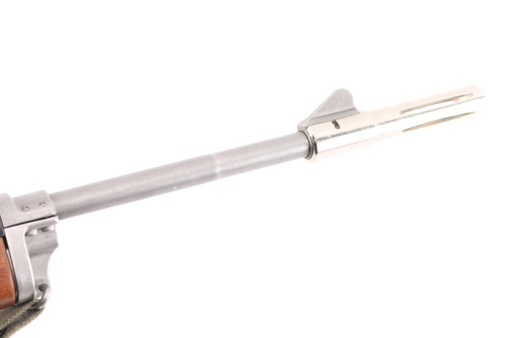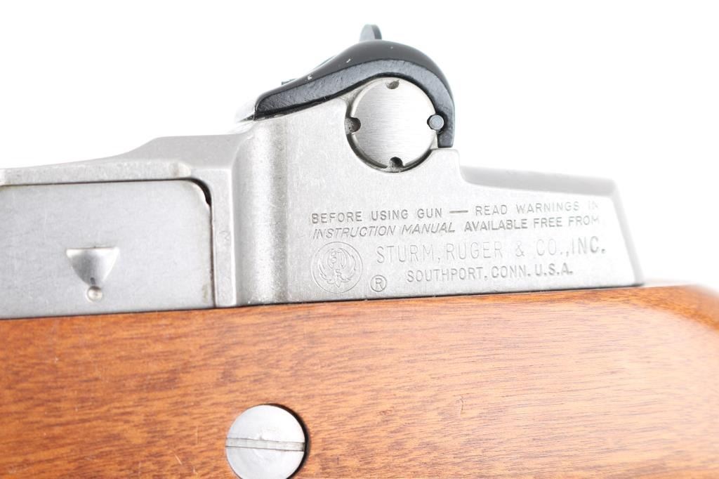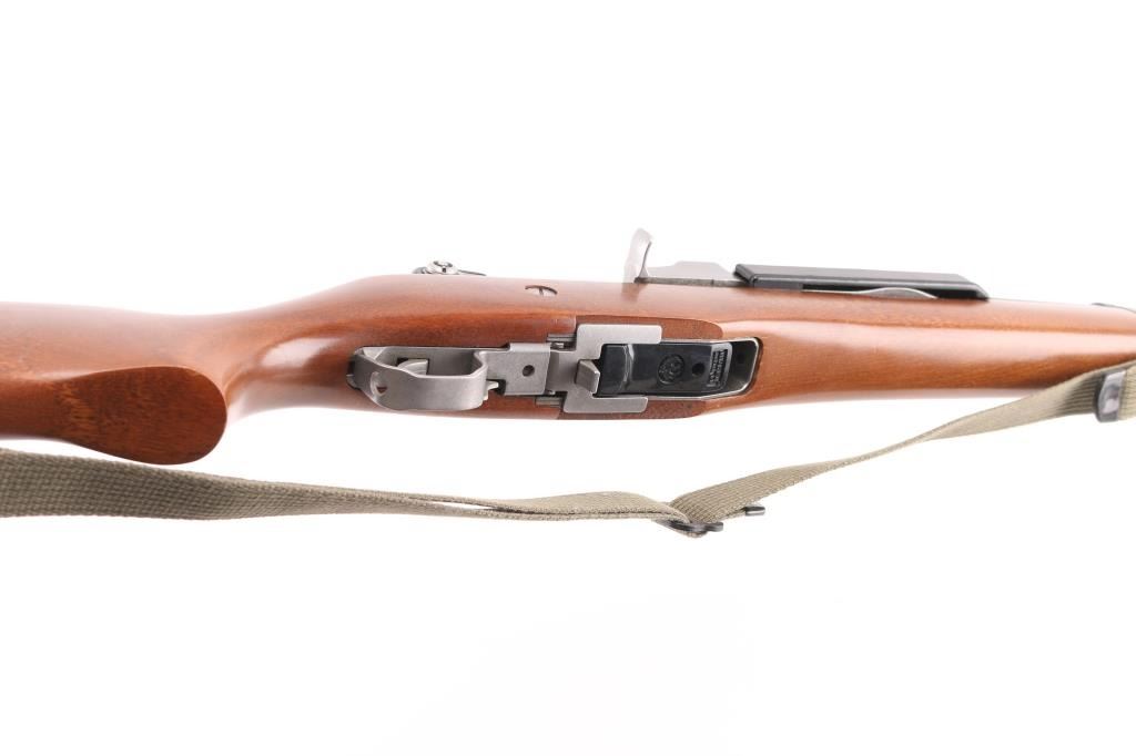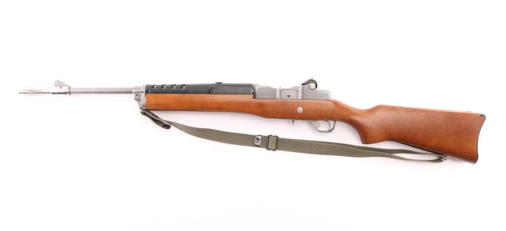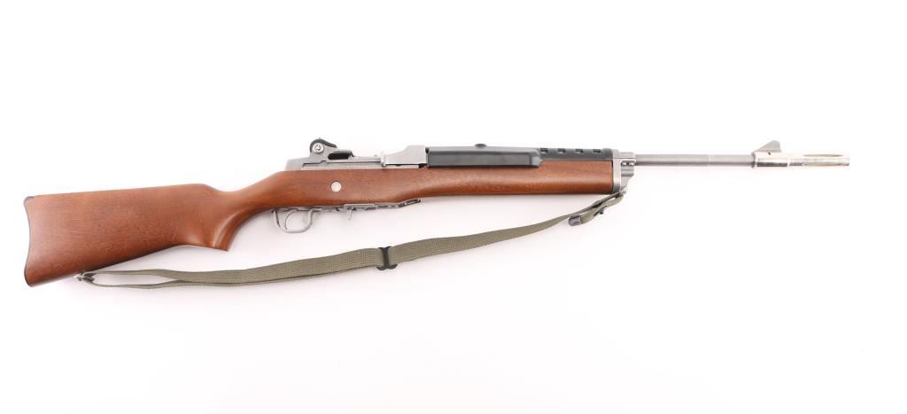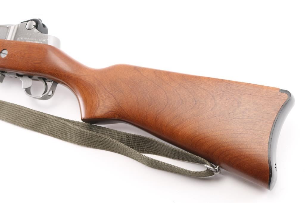 Semiautomatic rifle features stainless steel construction, hardwood stock, black polymer handguard, 18" barrel, blade front sight, adjustable rear peep sight, manual safety, sling swivels, flash hider. Bore is very good condition. Metal shows very good or better condition with signs of handling and use. Stock is very good or better condition with few scratches. Includes one 5 round magazine, green cotton web sling. Condition is NRA Excellent *** Modern Firearm ***