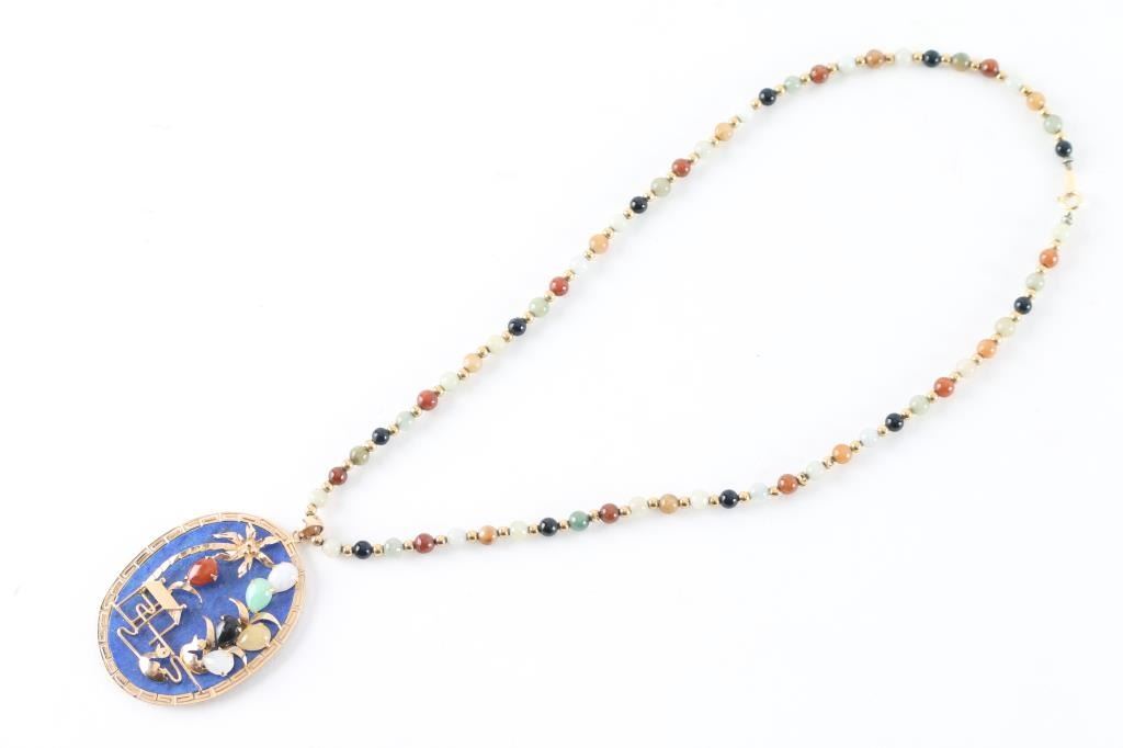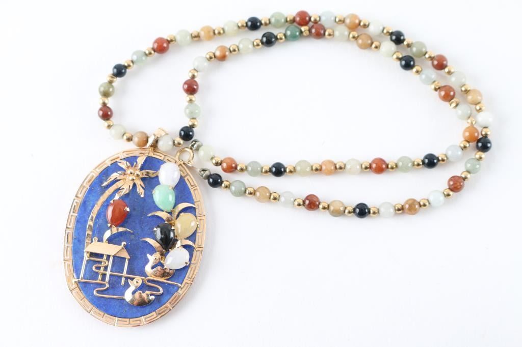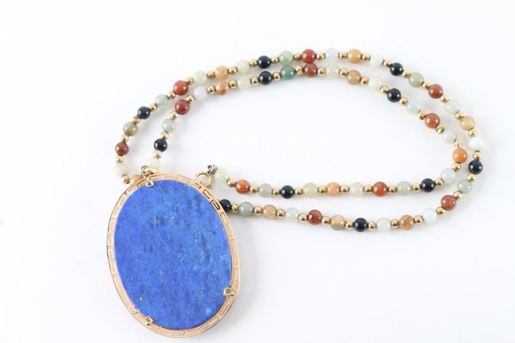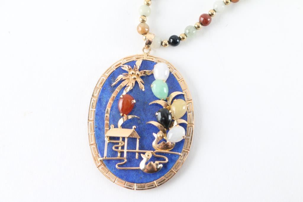 Beautiful piece of lapis and marked 14K on the clasp with hard gem stones, . This was made in the 1950s, or early 60's in Hong Kong for Major John Cable of the U.S. Army, who was attached to the Embassy in Tokyo, Japan and was custom made for him. Scrap gold in this item is estimated to be over $300 @ 39/gram. Necklace measures 16" long and the pendant measures almost 2" x 1.75".