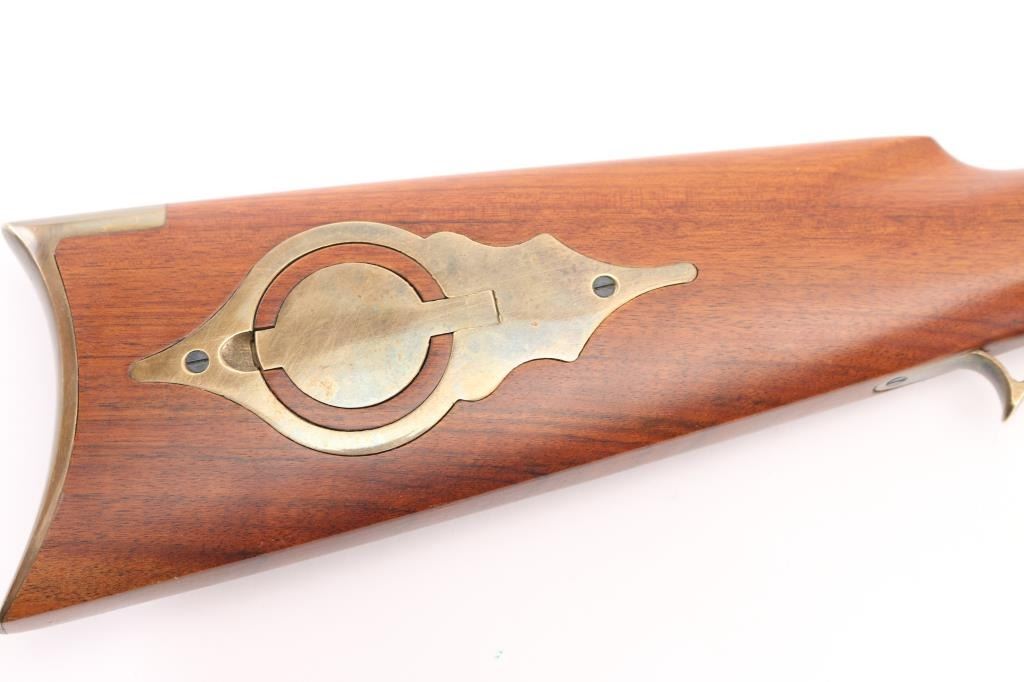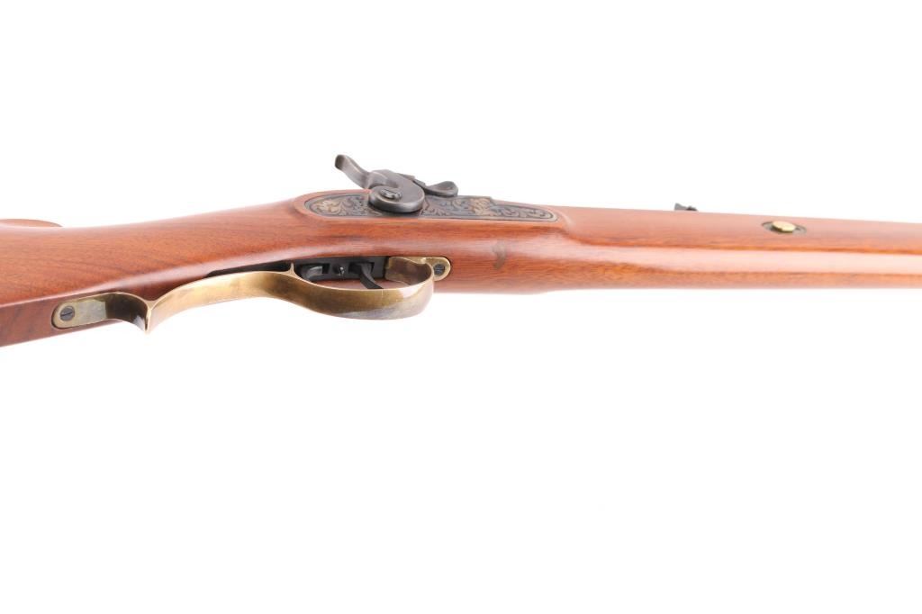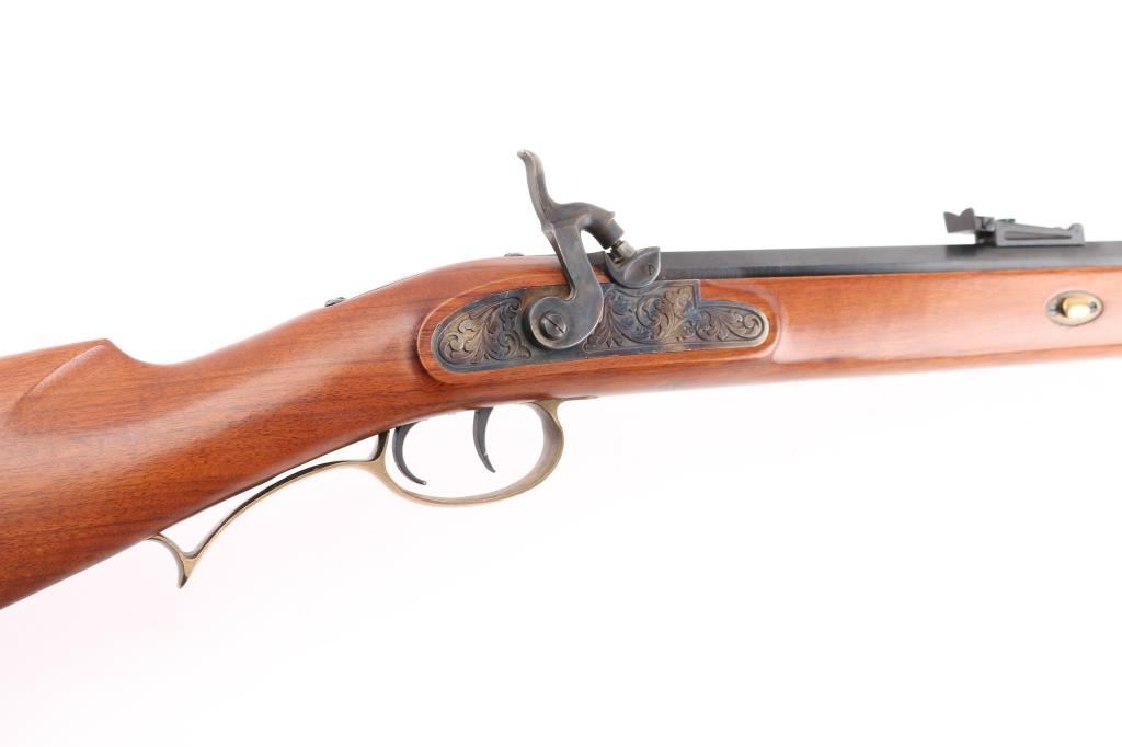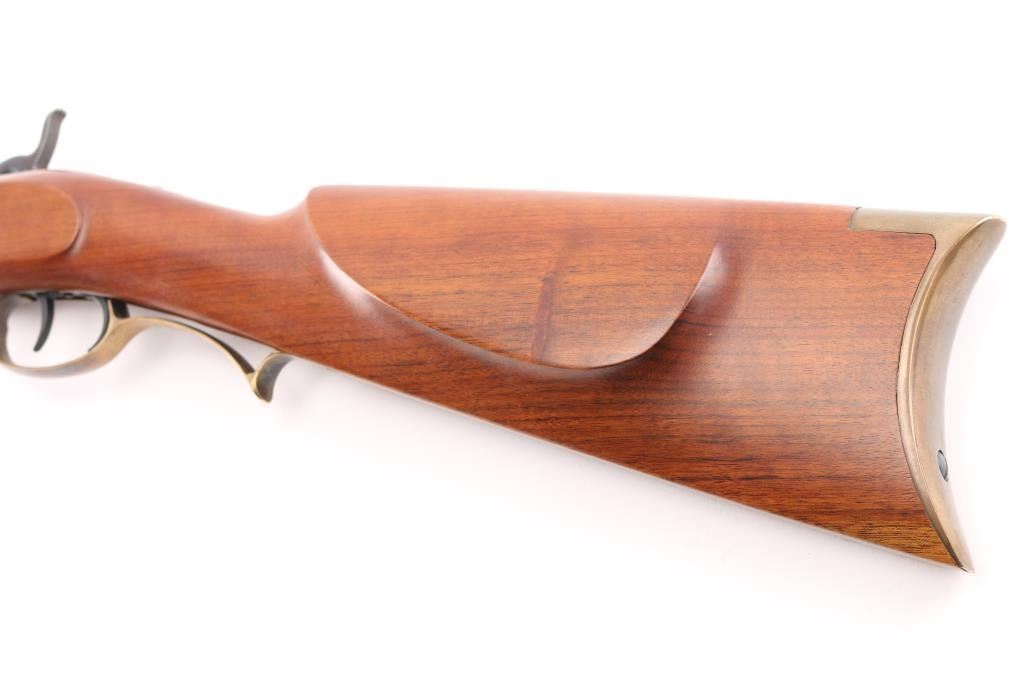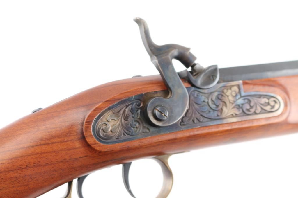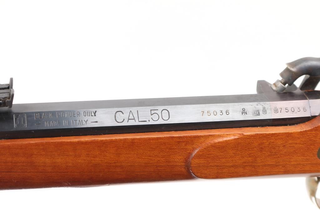 Italian made single shot percussion lock black powder rifle. Features blued barrel, case color lock, brass fittings, half length wood stock, 29" octagon barrel, wooden ramrod, patch box, crescent buttplate, right hand cheekpiece, straight grip stock, double set trigger, right hand percussion lock, blade front sight, adjustable rear sight. Bore shows light rust patches throughout. Barrel retains 95% finish with handling marks. Brass parts show mellow patina. Stock is very good with minor scratches/dings. Condition is NRA Good++ *** "Antique" Firearm ***