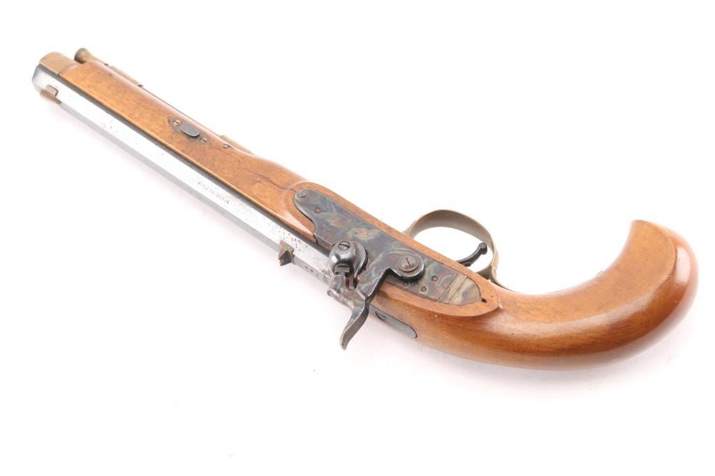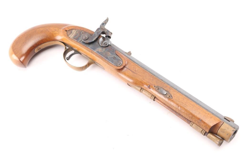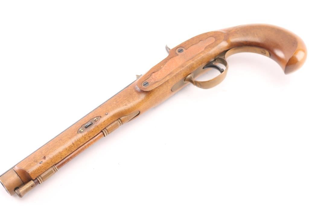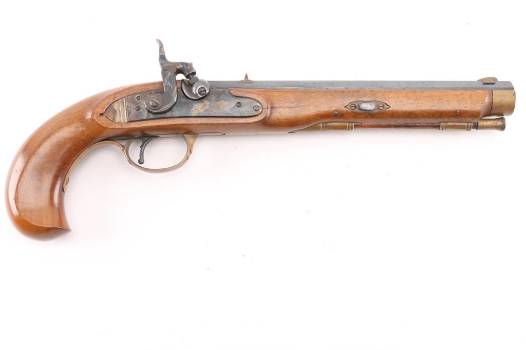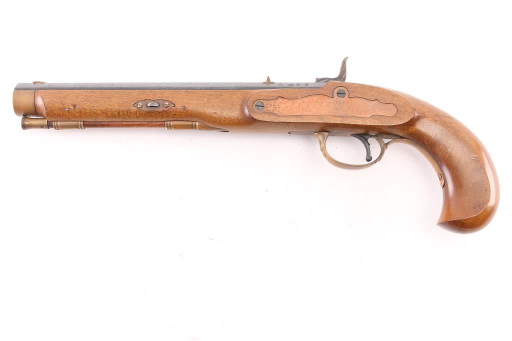 Single shot muzzleloading percussion pistol. Features 10" blued octagon barrel, case colored right hand lock, brass fittings, smooth wood stock with bird's head grip, brass blade and notch sights, single trigger, wood ramrod. Bore shows light rust. Barrel retains 90% finish with handling marks. Brass fittings show mustard color patina. Serpentine appears to be brass, with reddish patina. Wood is very good. Marked "700" on barrel. Condition is NRA Very Good *** "Antique" Firearm ***