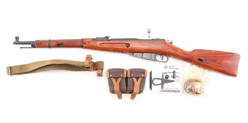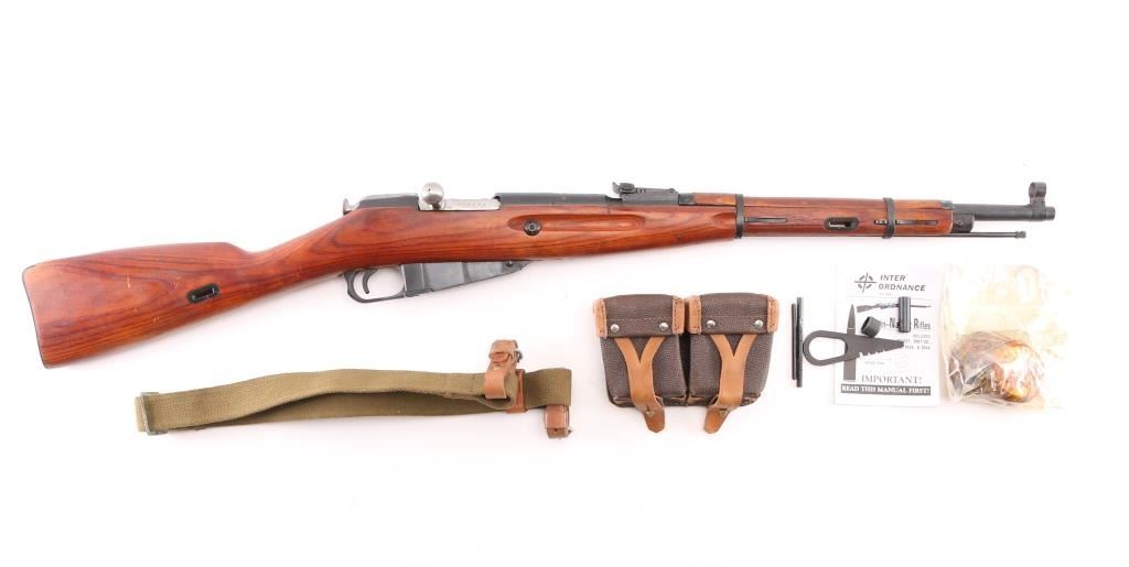 WW 2 Russian (Soviet Union) military bolt action Mosin Nagant rifle imported by IO Inc, Monroe NC. Dated 1943. Features 20" barrel, hooded post front & tangent rear sight, cleaning rod, sling slots. Bore is Fair condition, dark & corroded, strong rifling. Retains 90% dark blued finish with handling marks. Varnished hardwood stock is very good condition with scrapes, dings. Arsenal refinished. Original serial number matching where observed, importer applied number on receiver. Comes with sling with "Dog collars", cartridge box, take-down tool, oiler, and cleaning gear. Condition is NRA Fair (Bore) C&R Firearm.