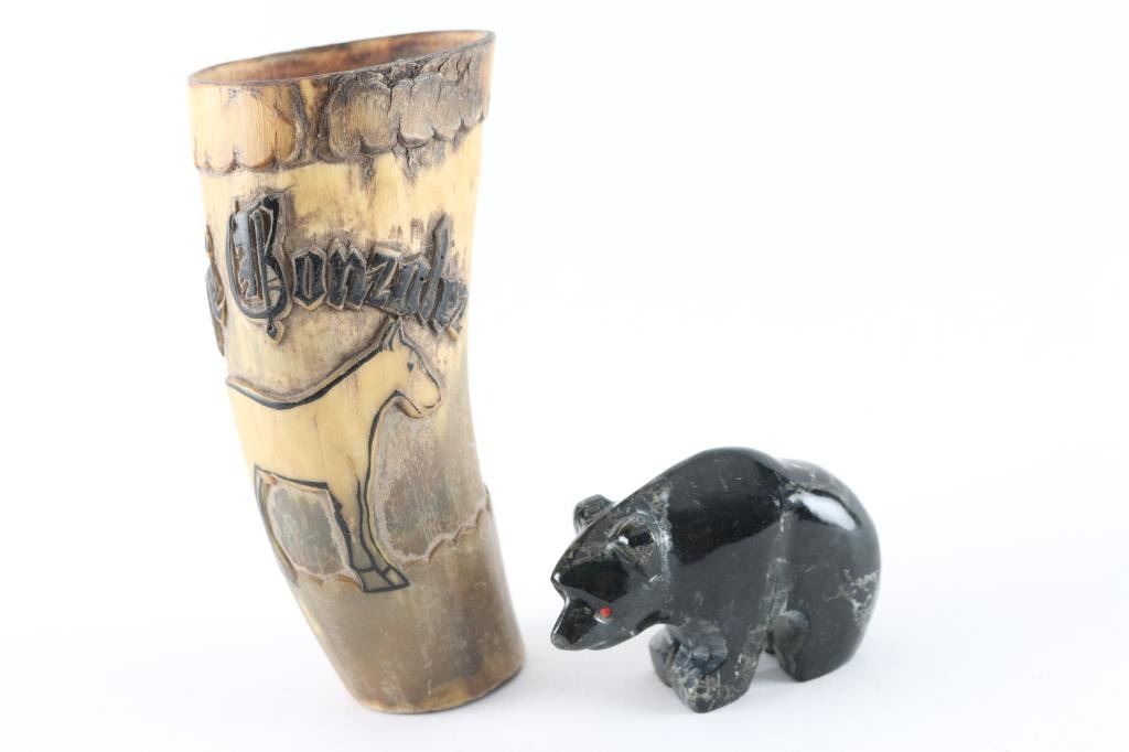 Powder flask with donkey marked Jose Gonzalez missing cap and a black stone bear fetish.