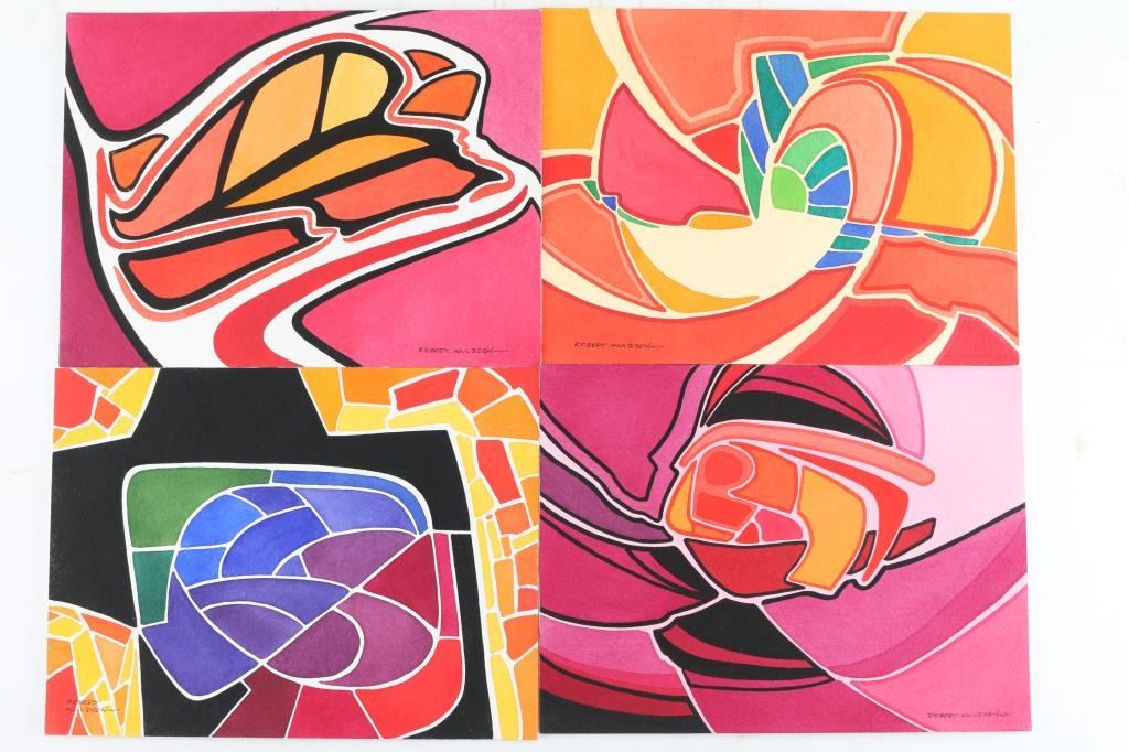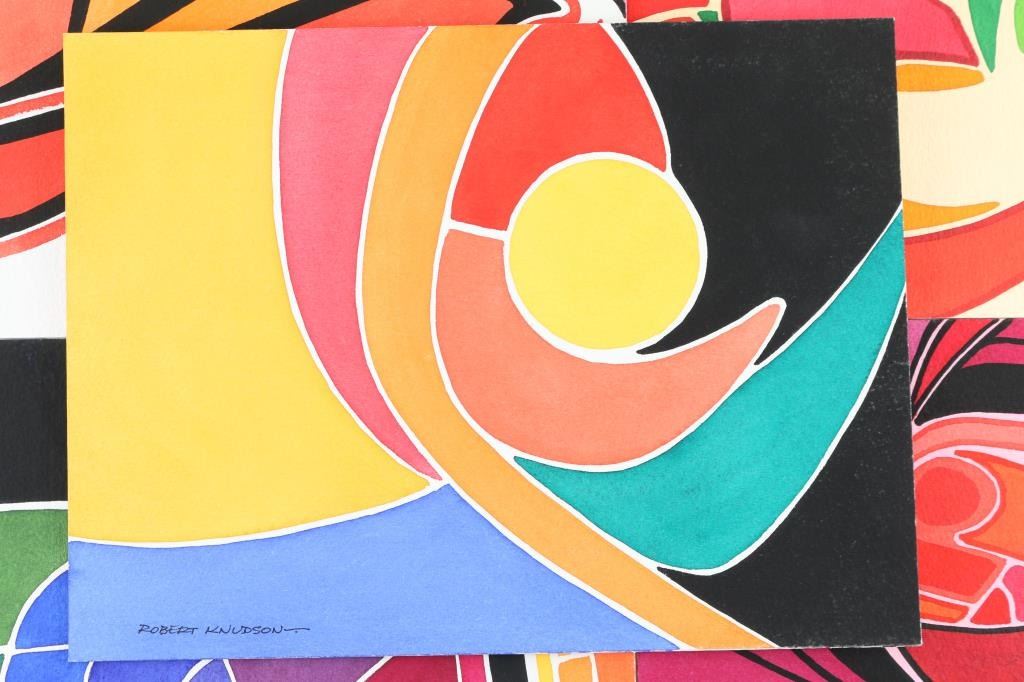 originals by Prescott Valley, Robert Knudson, all signed, measuring 9"x12", in vibrant colors of red, purple, and orange. Titles include, "Pacific Shores", "Conception", "Womb of the Dawn", "Joy in the Morning", and one is not titled. The work of Bob Knudson is represented in major collections through out the US including the William Penn Memorial Museum amd the Museum of Northern AZ. His painting frequently appear in Arizona Highways and he has been member of the Mountain Oyster Club the oldest and most prestigious cattleman's club in the Southwest.