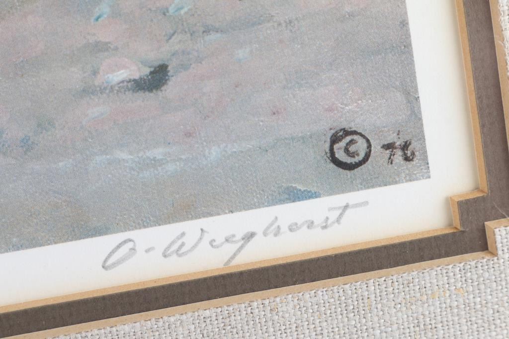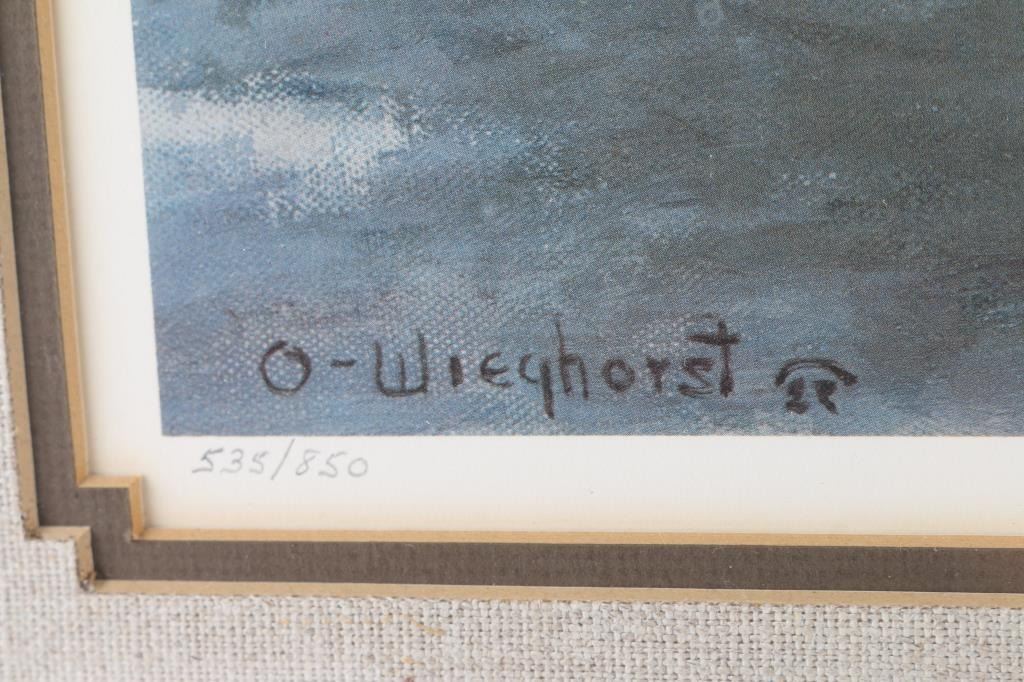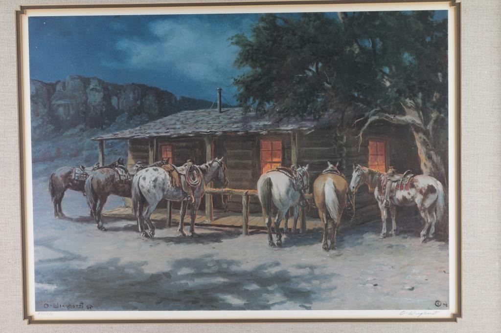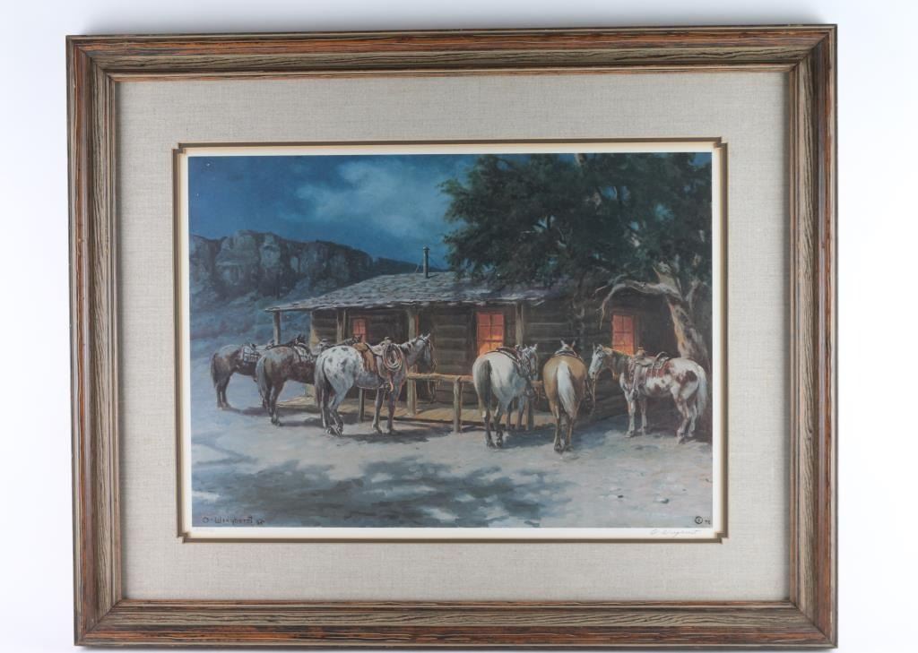 by artist "Olaf Carl Wieghorst" depicting a western scene and named "The Boys in the Bunkhouse". Numbered 535/850 on the lower left and hand-signed on the lower right. Wieghorst was born in Viborg, Denmark in 1899 and died in 1988. His work was represented by the Grand Central Art Galleries of the Biltmore Hotel. In 1944, he settled in El Cajon, California. His paintings include cowboys, horses, and Indians in landscape. He painted celebrity horses including Roy Rogers' Trigger, Gene Autry's Champion and Tom Morgan's stallion. Frame measures 33" wide x 26 1/2" tall. Doubled matted. Very good condition with small tears in the paper backing. No Certificate of Authenticity. Limited Edition. Collectible.