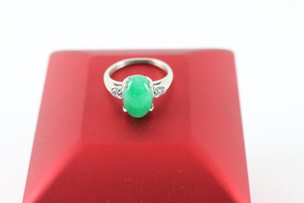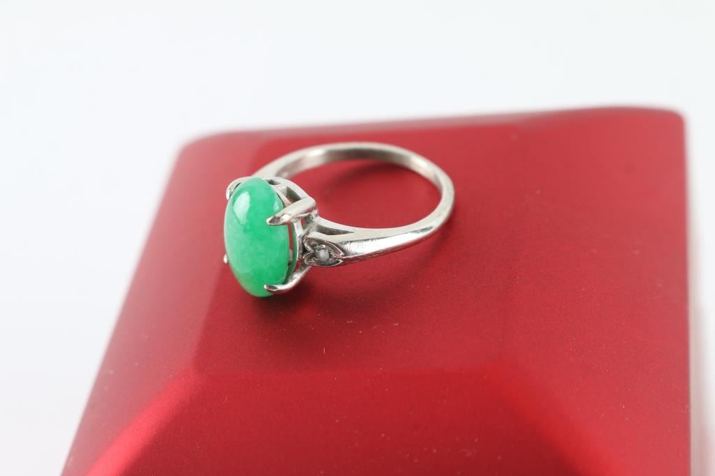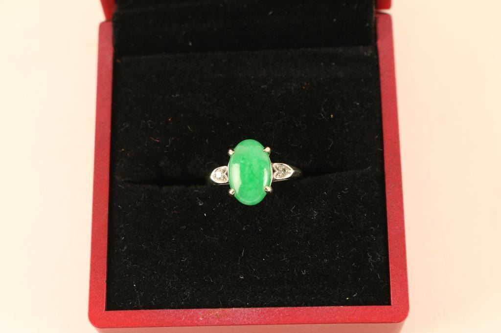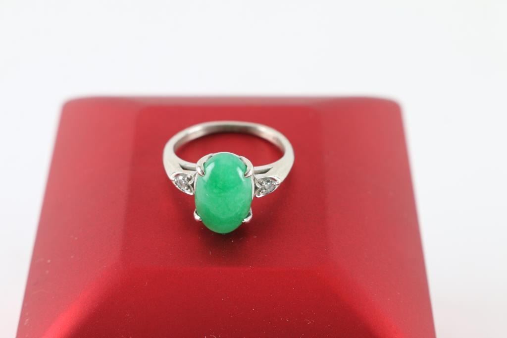 From an estate, this 50's to early 60s ring is made of natural jade with a diamond on either side set in 14k white gold. Size 5.5