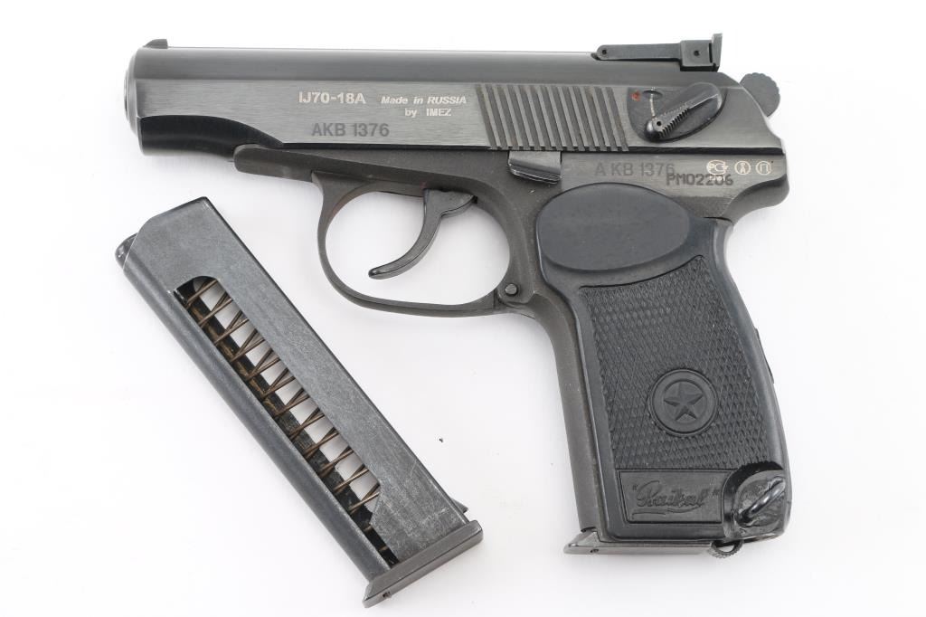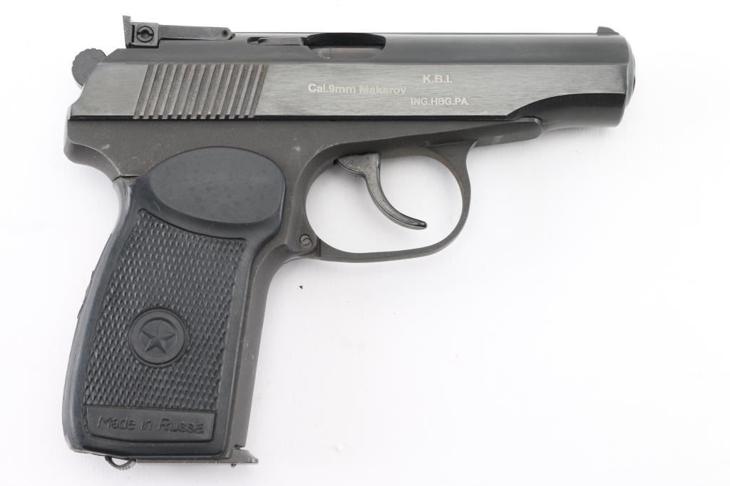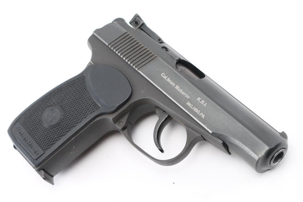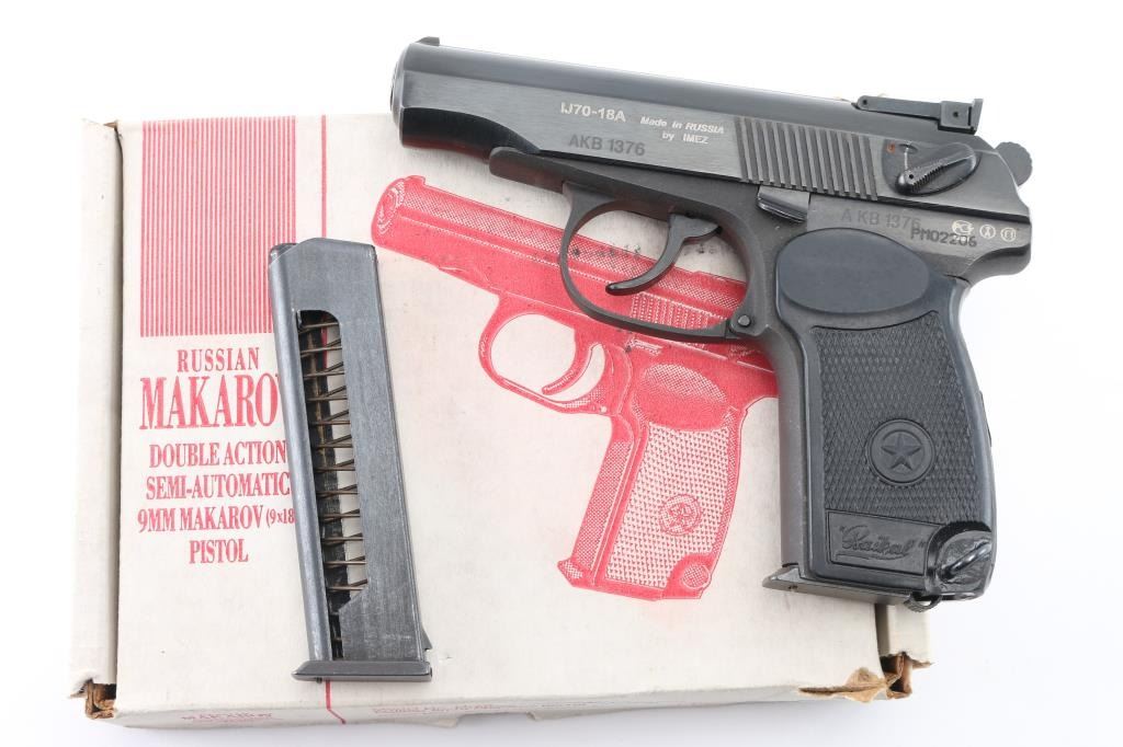 SN: AKB1376/PM02206 'Baikal' Russian made commercial version of the Soviet PM Makarov pistol (itself a modification & development of the Walther PP type pistol) chambered in 9x18mm Makarov. Imported by KBI, HBG PA, with import stamp on the right side of the slide. Features all steel construction, a blued finish, 3.8" fixed barrel (appears hard chrome lined), blade front sight, adjustable rear sight with square notch, smooth trigger, serrated round hammer spur, thumb safety/decocker on the left side of the slide, slide catch on the left side of the frame, heel magazine release, 8 round magazine and checkered one-piece black synthetic wrap-around grip with molded stars and "Baikal" logos. Pistol is like new with few handling marks. Includes original factory cardboard box and spare magazine. Condition is NRA Excellent *** Modern Firearm ***