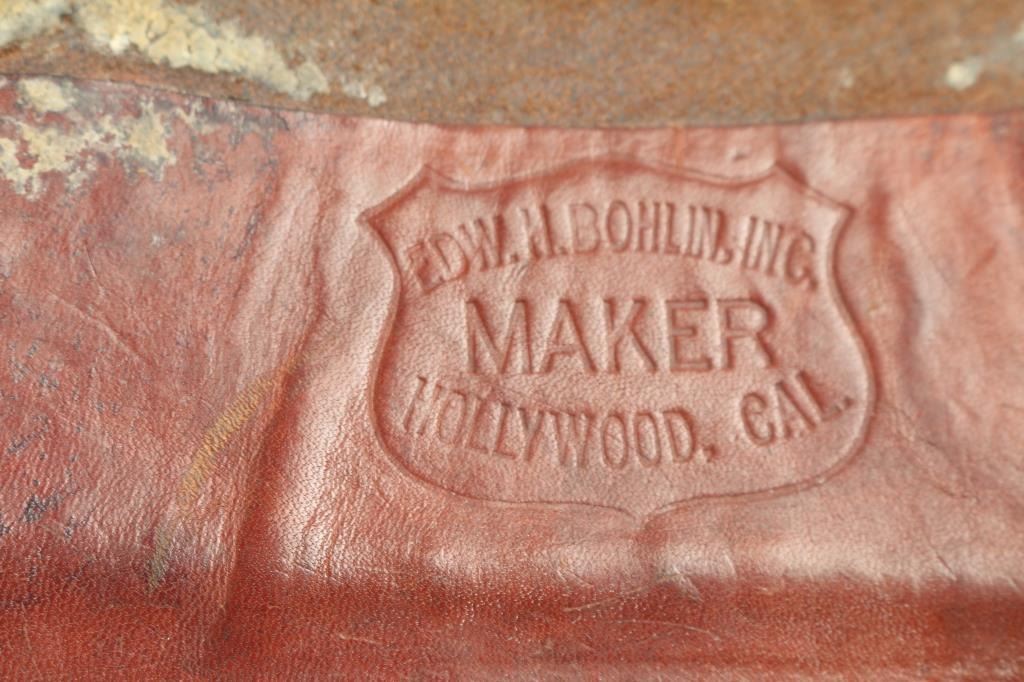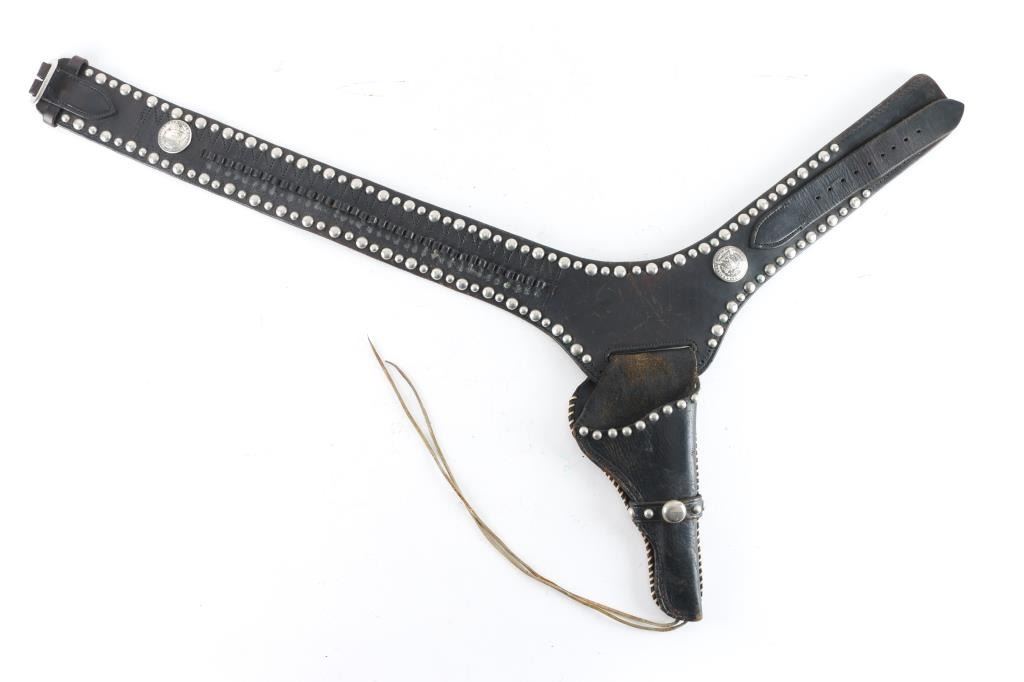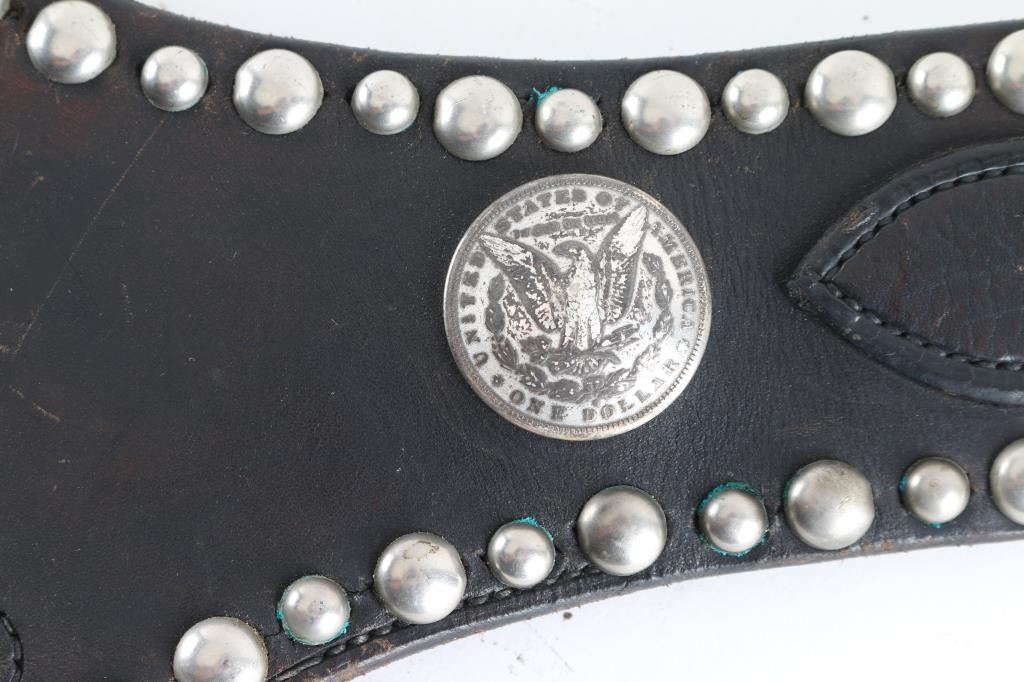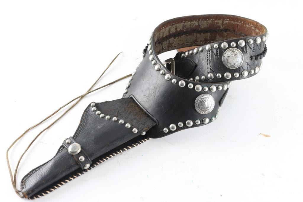Smooth black leather, accented with nickeled spots, silver conchos and two silver dollar coins, type used in the movie, "Gun Crazy" and holds an H&R DA-22 Sportsman. Measures 40" long at widest belt hole.