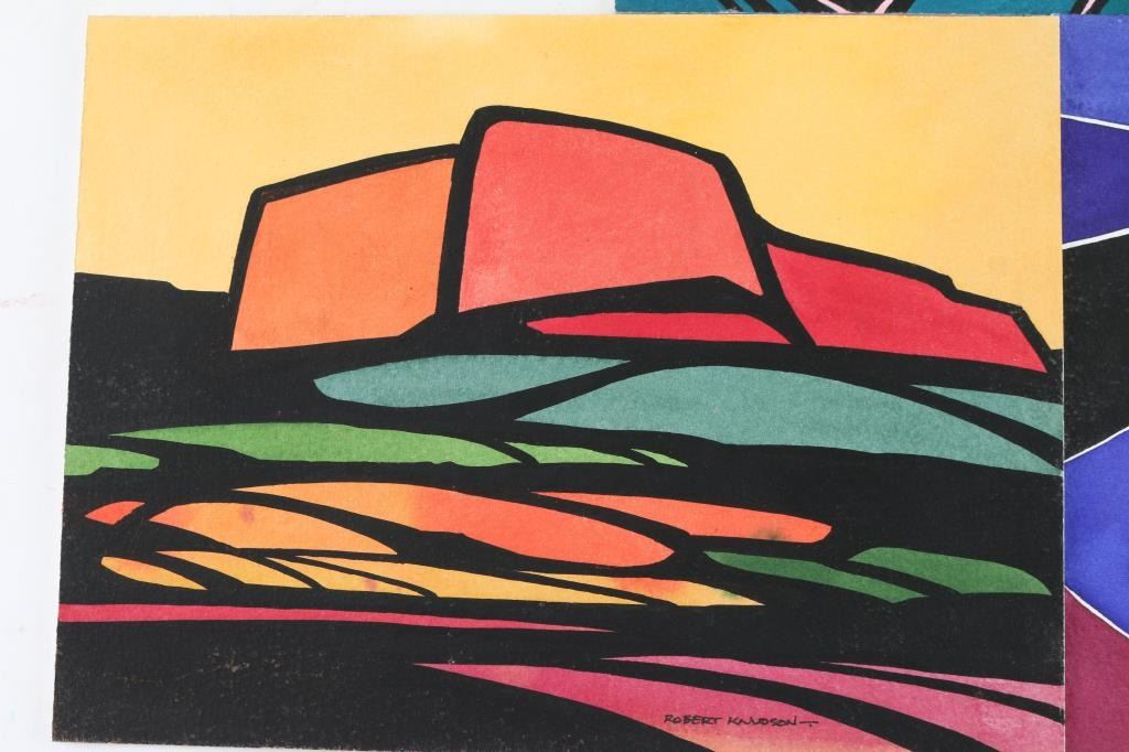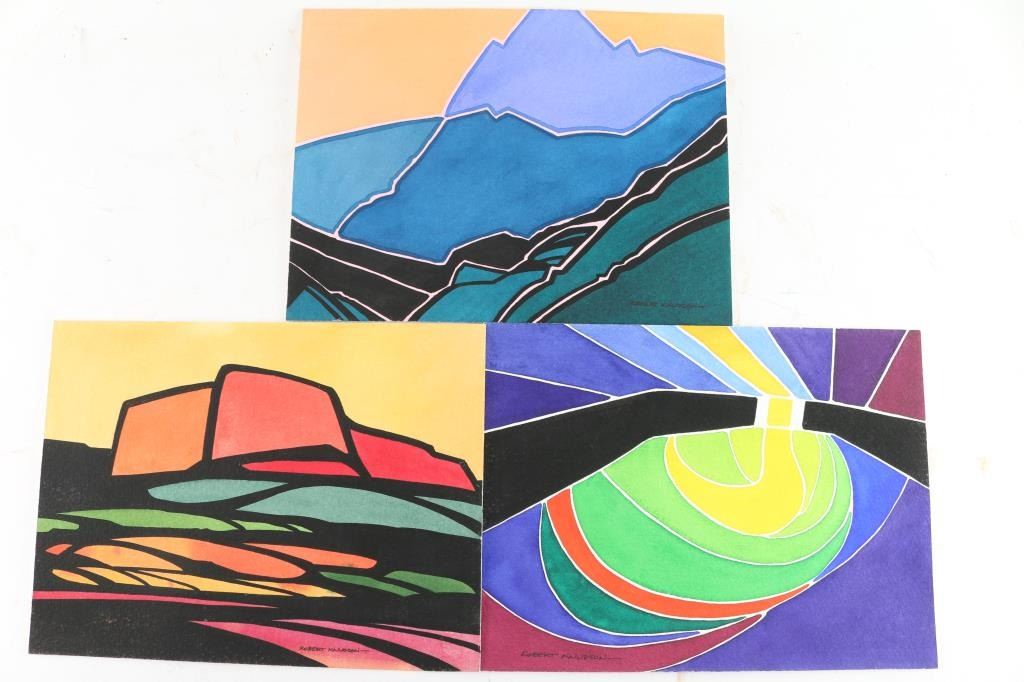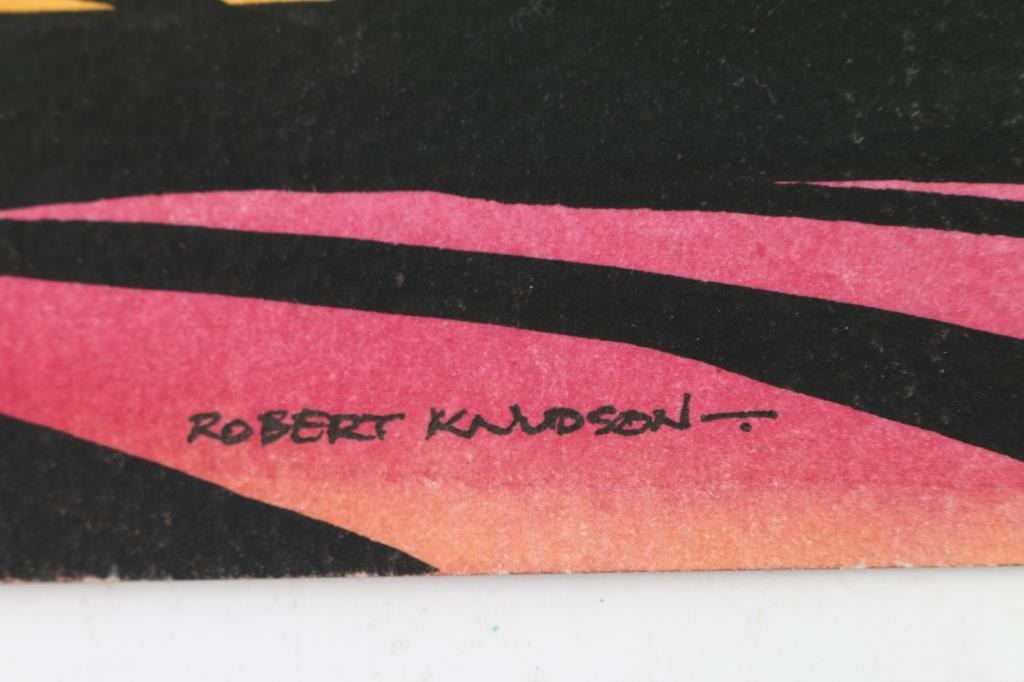 originals by Prescott Valley, Robert Knudson, all signed, measuring 9"x12", in vibrant colors, with the titles, "Evening Song", "Dusk", and "Piercing the Darkness." The work of Bob Knudson is represented in major collections through out the US including the William Penn Memorial Museum amd the Museum of Northern AZ. His painting frequently appear in Arizona Highways and he has been member of the Mountain Oyster Club the oldest and most prestigious cattleman's club in the Southwest.