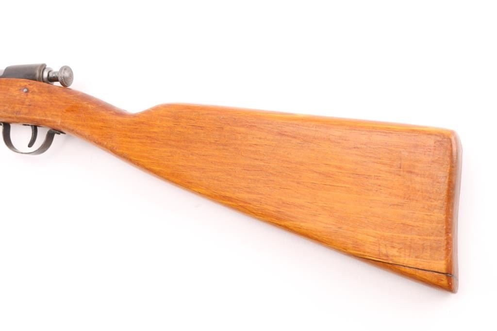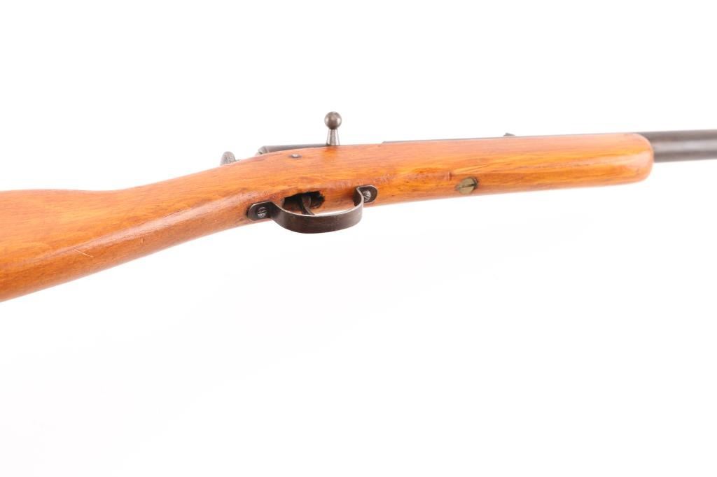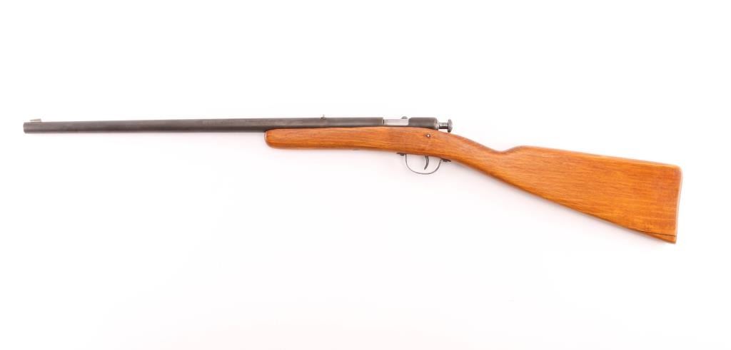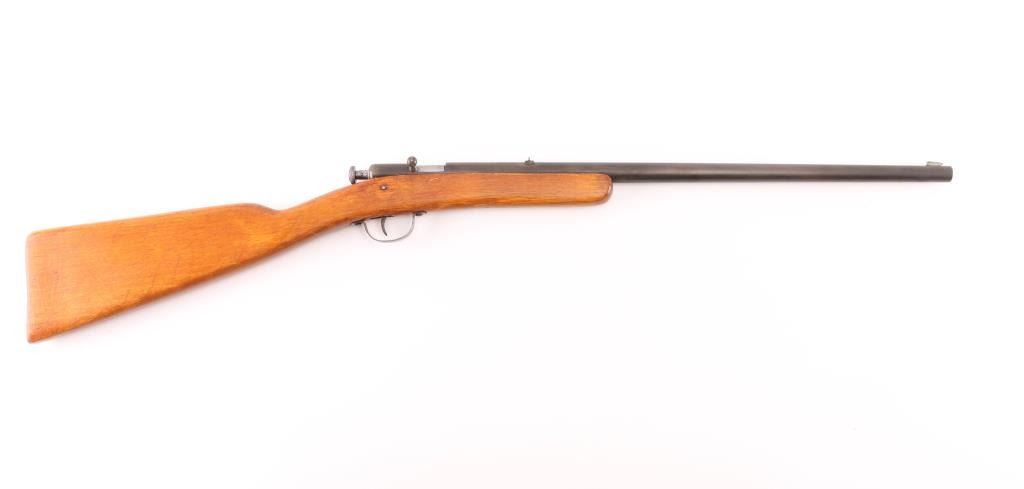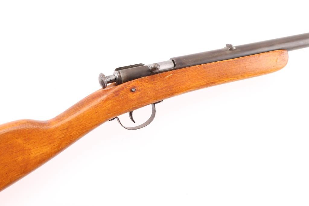 Bolt action single shot, manual cocking, youth rifle with 18 inch round barrel chambered in 22 S. L. and L.R. caliber. Hard to believe but it has an excellent bright shiny bore. Barrel is dull blue turning a brown patina. Original open sights. Takedown frame. One piece straight grip gumwood stock without fitted buttplate. Wood has some light usage mars and a repaired crack on the heel. Action works well, It should make for a fine shooter with this bore. These are hard to come by as less than 39,000 were made between 1928-1931. NRA Condition-Good. C&R Firearm.